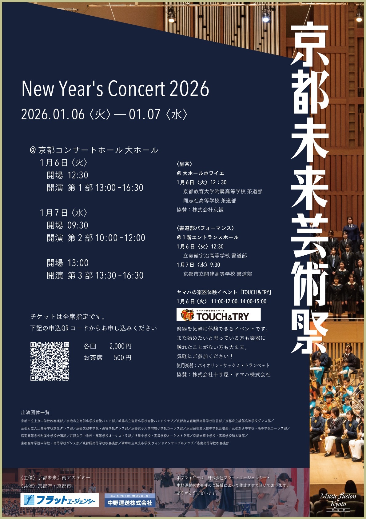 ◆出演 京都光華中学校・高等学校太鼓部 京都聖母学院中学校ダンス部 京都橘高等学校吹奏楽部 京都文京中学校・高等学校ダンス部 京都未来合唱団(京都女子大学附属小学校コーラス部/京都女子中学校・高等学校コーラス部/京田辺市立大住中学校合唱部/洛南高等学校附属中学校合唱部/洛南高等学校吹奏楽部(共演)