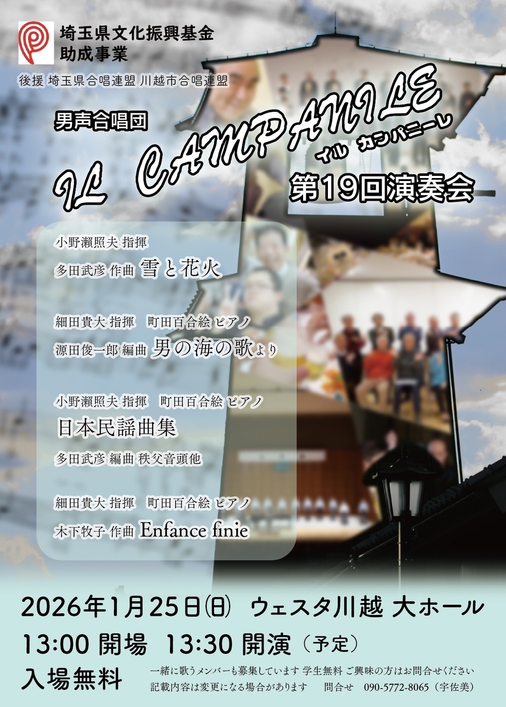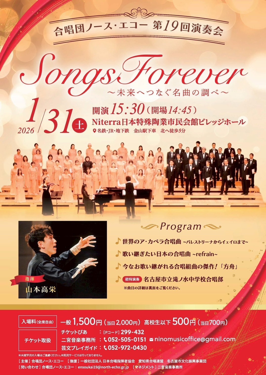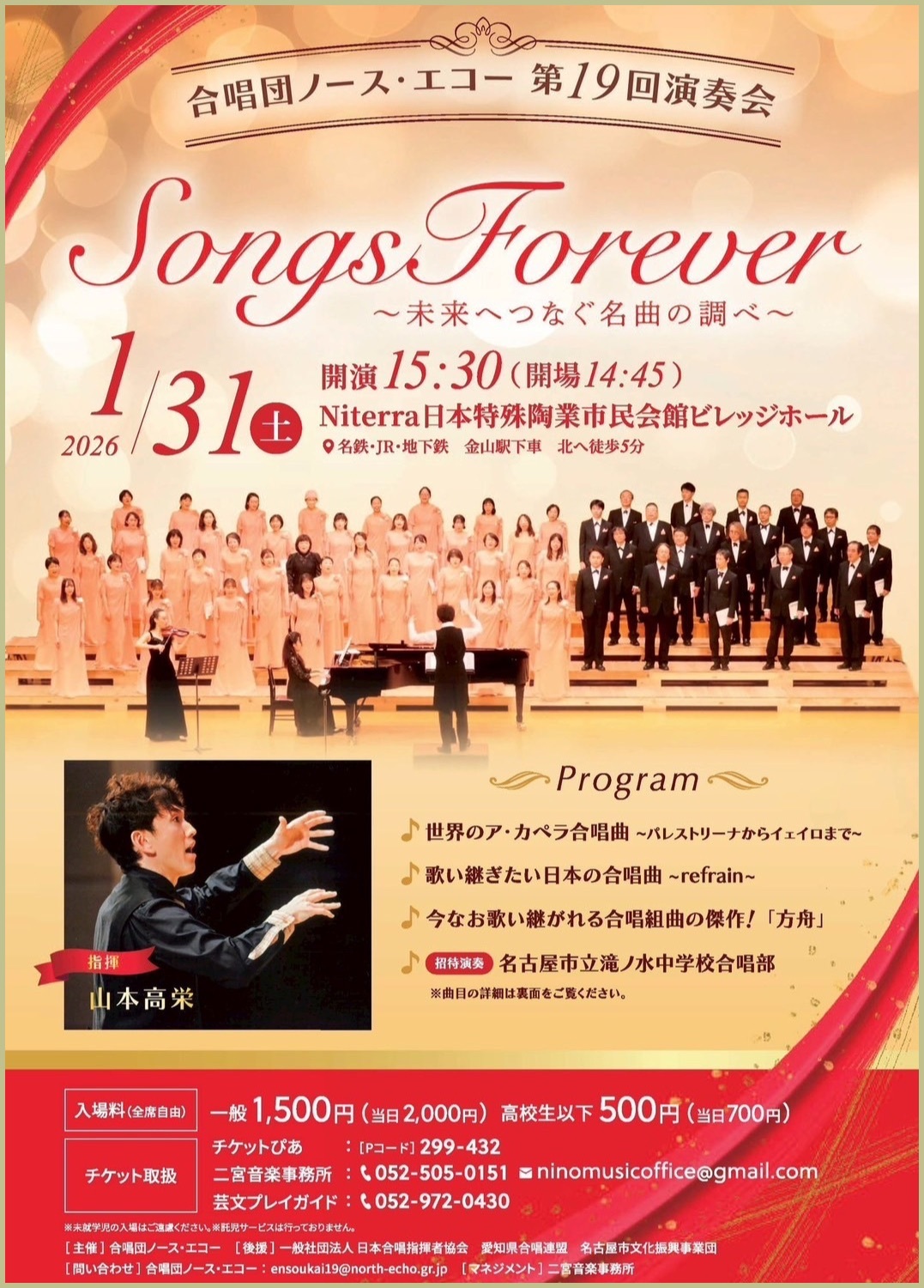 ◆曲目 世界のア・カペラ合唱曲(パレストリーナからイェイロまで)、歌い継ぎたい日本の合唱曲 小さい空(武満 徹) リフレイン(信長貴富)他、今なお歌い継がれる合唱組曲「方舟」(木下牧子)、招待演奏:名古屋市立滝ノ水中学校合唱部 ◆連絡先 合唱団ノースエコー