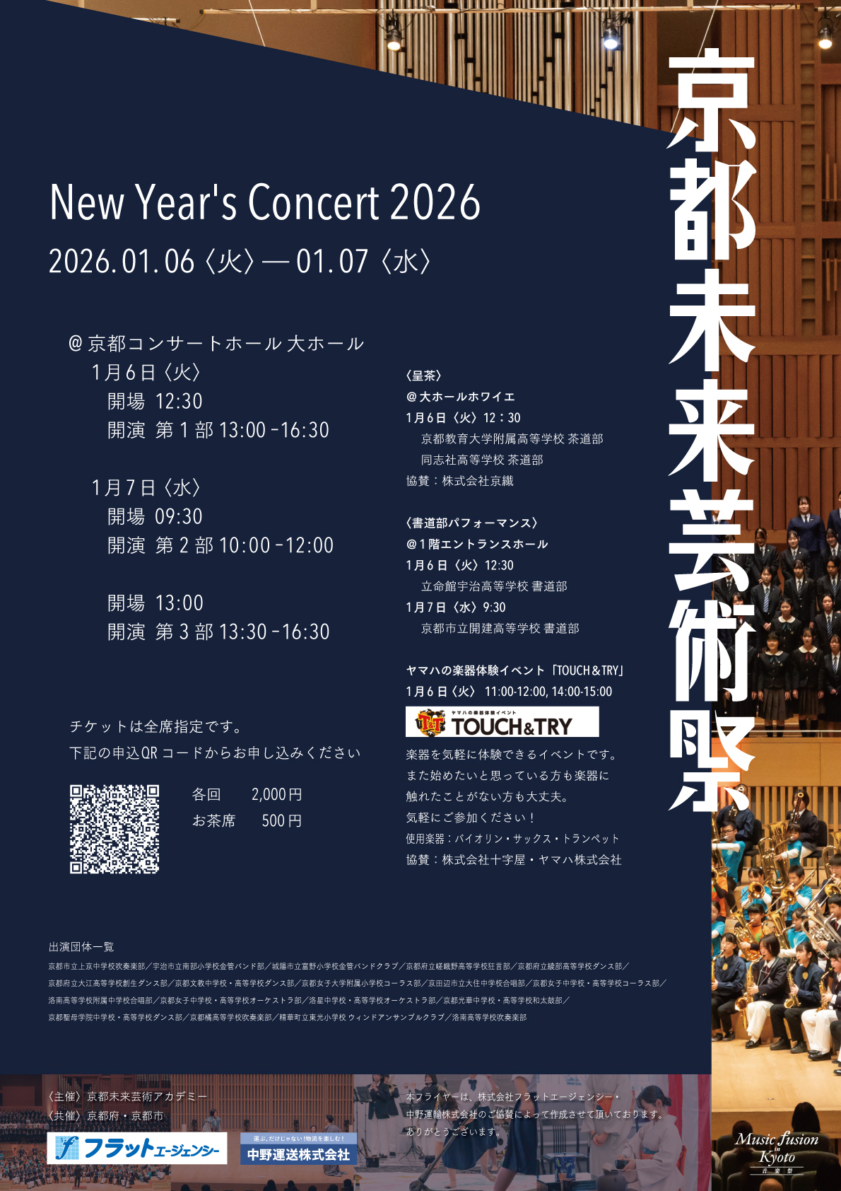 ◆出演 京都市立上京中学校吹奏楽部 宇治市立南部小学校金管バンド部 城陽市立富野小学校金管バンドクラブ 京都府立嵯峨野高校狂言部 Northern Kyoto Dance Crew(北部校ダンス)、京都未来合唱団(京都女子大学附属小学校コーラス部/京都女子中学校・高等学校コーラス部/京田辺市立大住中学校合唱部/洛南高等学校附属中学校合唱部/洛南高等学校吹奏楽部(共演) Ensemble Kyoto Academy(弦楽合同)