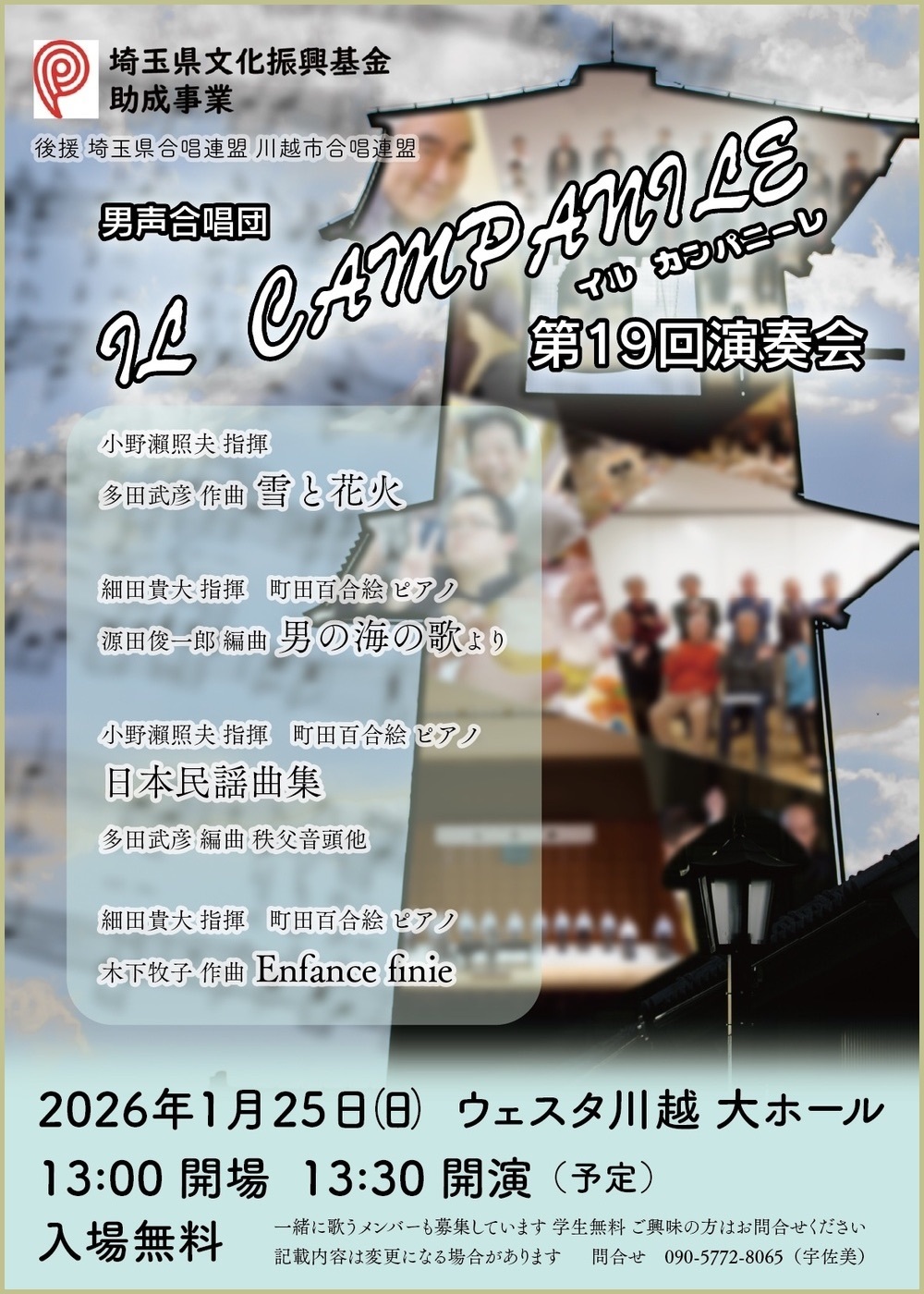 ◆曲目 この道 からたちの花(山田耕筰)、オペラ「死神」より(池辺晋一郎)、日々草(加羽沢美濃)、しぬまえにおじいさんのいったこと(木下牧子)、花の春告鳥(小林秀雄)