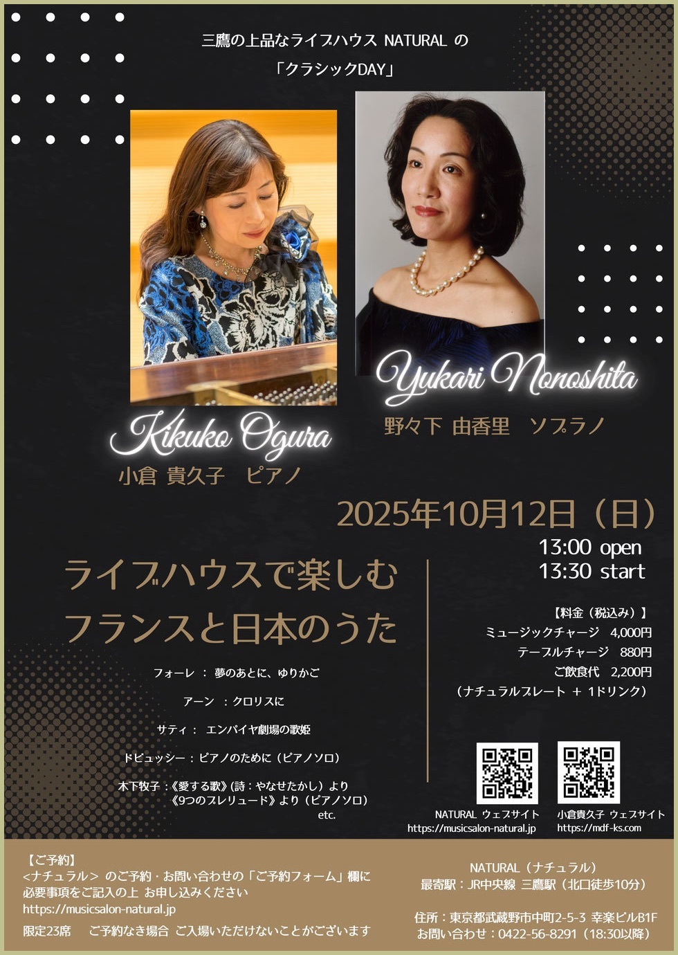 ◆曲目 夢のあとに ゆりかご(フォーレ)、クロリスに(アーン)、エンパイヤ芸地涌つの歌姫(サティ)、ピアノのために(ドビュッシー)、「愛する歌」より ピアノのための「9つのプレリュード」より(木下牧子)他 ◆連絡先 ナチュラル
