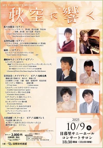 ◆曲目 ノクターン第4番 舟唄(フォーレ)、ため息 ペトラルカのソネット(リスト)、ディーヴァ・ダンス・ソング(ドニゼッティ)、荒城の月 他(瀧廉太郎)、この道 他(山田耕筰)、理想の人(トスティ)、カタリ・カタリ(カルディッロ)、帰れソレントへ(クルティス)、霧と話した(中田喜直)、しぬまえにおじいさんのいったこと(木下牧子)、ひぐらし(團 伊玖磨) ◆主催 国際芸術連盟