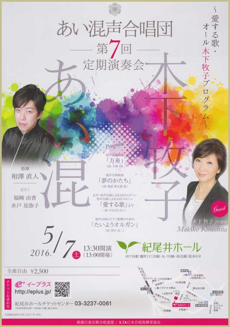 ●出演 木下牧子(ゲスト)清水敬一(司会)ピアノデュオ・パリ・プラハ(十川菜穂、小田裕之)近藤基/信州大学グリークラブ、シナノコラリアーず、清水昭/合唱団ひぐらし/pf.小田裕之、清水敬一/男声合唱団TOKEI/pf.前田勝則、辻秀幸/ラ・カンパネラ/河本充代、中舘伸一/女声合唱団クール・ミルフィーユ、名島啓太/混声合唱団鈴優会/pf.太田由美子、古橋冨士雄/N.F.レディースシンガーズ/pf.秋野淳子、松田乃利子/日本音楽高等学校/pf.小川教子、清水昭・古橋冨士雄/合同合唱/pf.野間春美