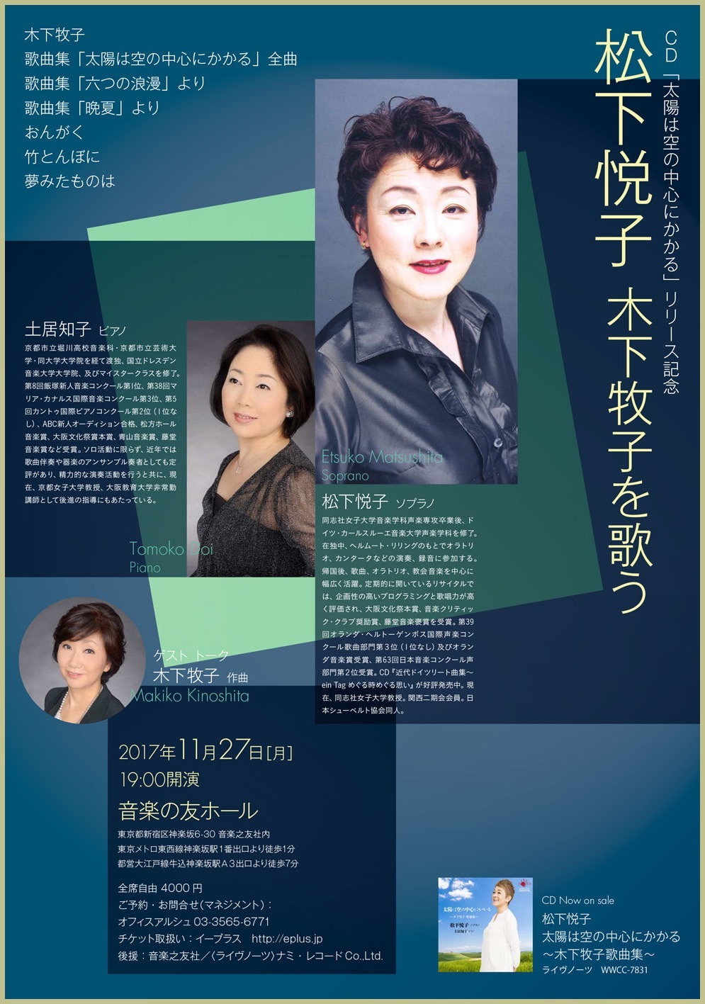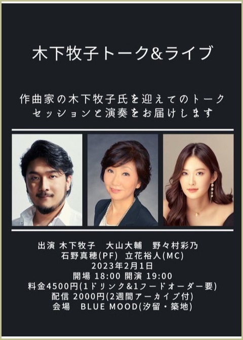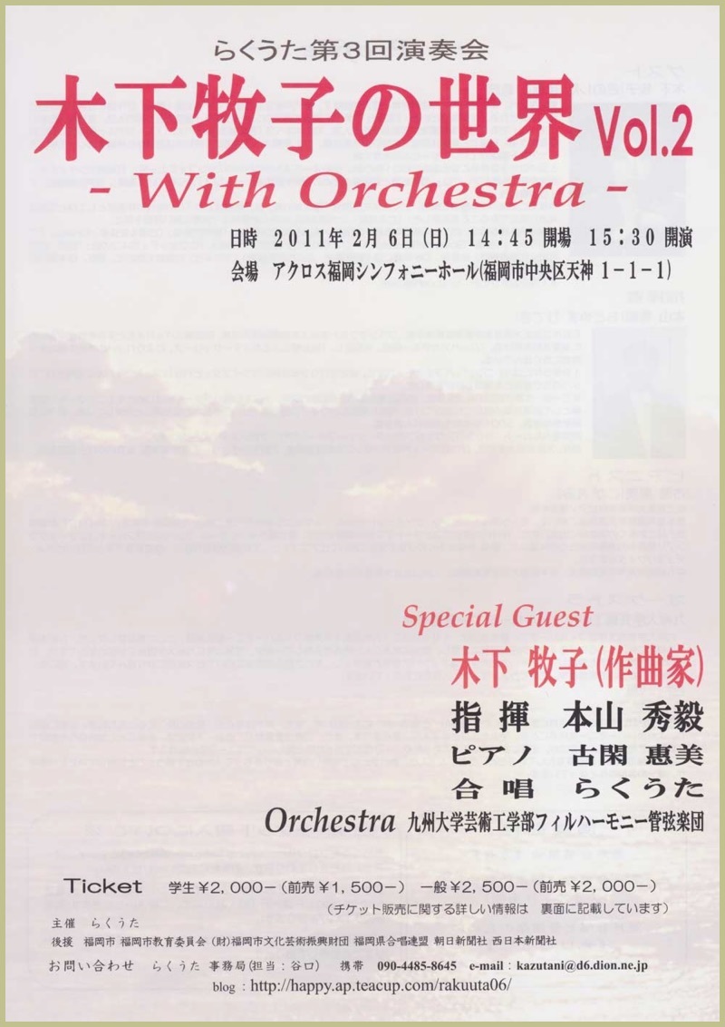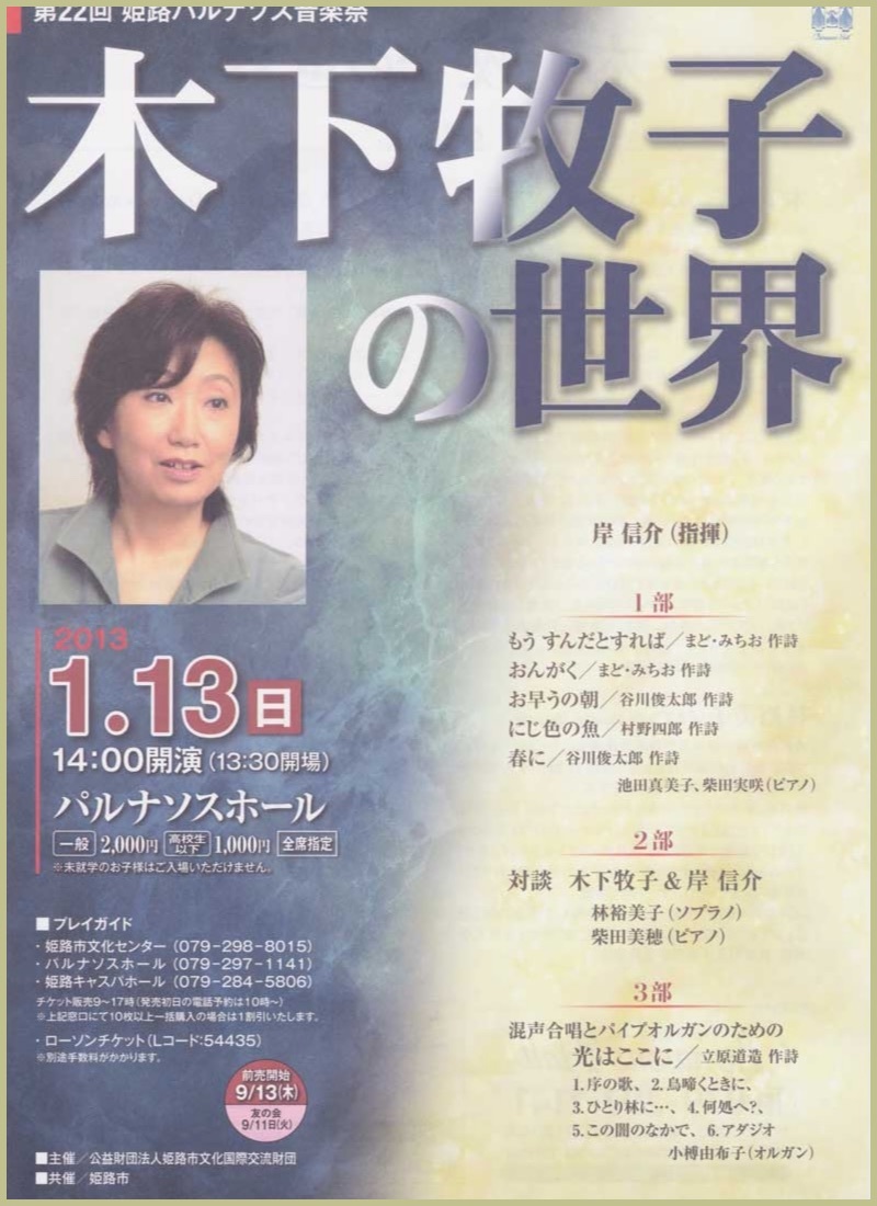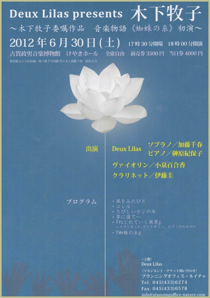 ●曲目 全作曲:木下牧子 「地平線の彼方へ」より/「愛する歌」より/「わたしは風」より/「花のかず」より/「夢みたものは」より/「アカペラ・コーラス・セレクション」より/歌曲:夢みたものは、幼年、風をみたひと/ピアノ連弾「迷宮のピアノ」より/音楽物語「蜘蛛の糸」〜朗読/独唱・クラリネット・ピアノのための