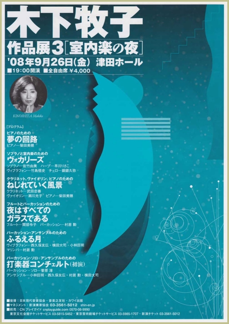 ●曲目 全作曲:木下牧子 ピアノ組曲「夢の回路」/「ヴォカリーズ」〜ソプラノ、ハープ、チェロ&Perc./「ねじれていく風景」Cl.Vn.Pf.のための/「夜はすべてのガラスである」Fl.&Perc./「ふるえる月」パーカッション・アンサンブルのための/「打楽器コンチェルト」Percソロ+アンサンブルのための 初演