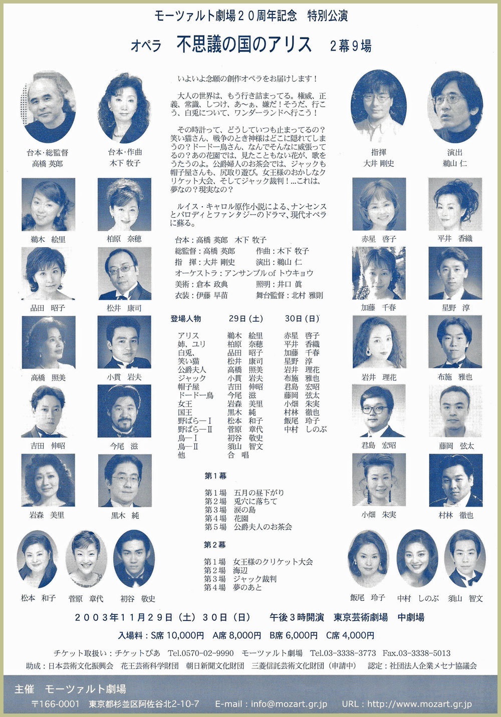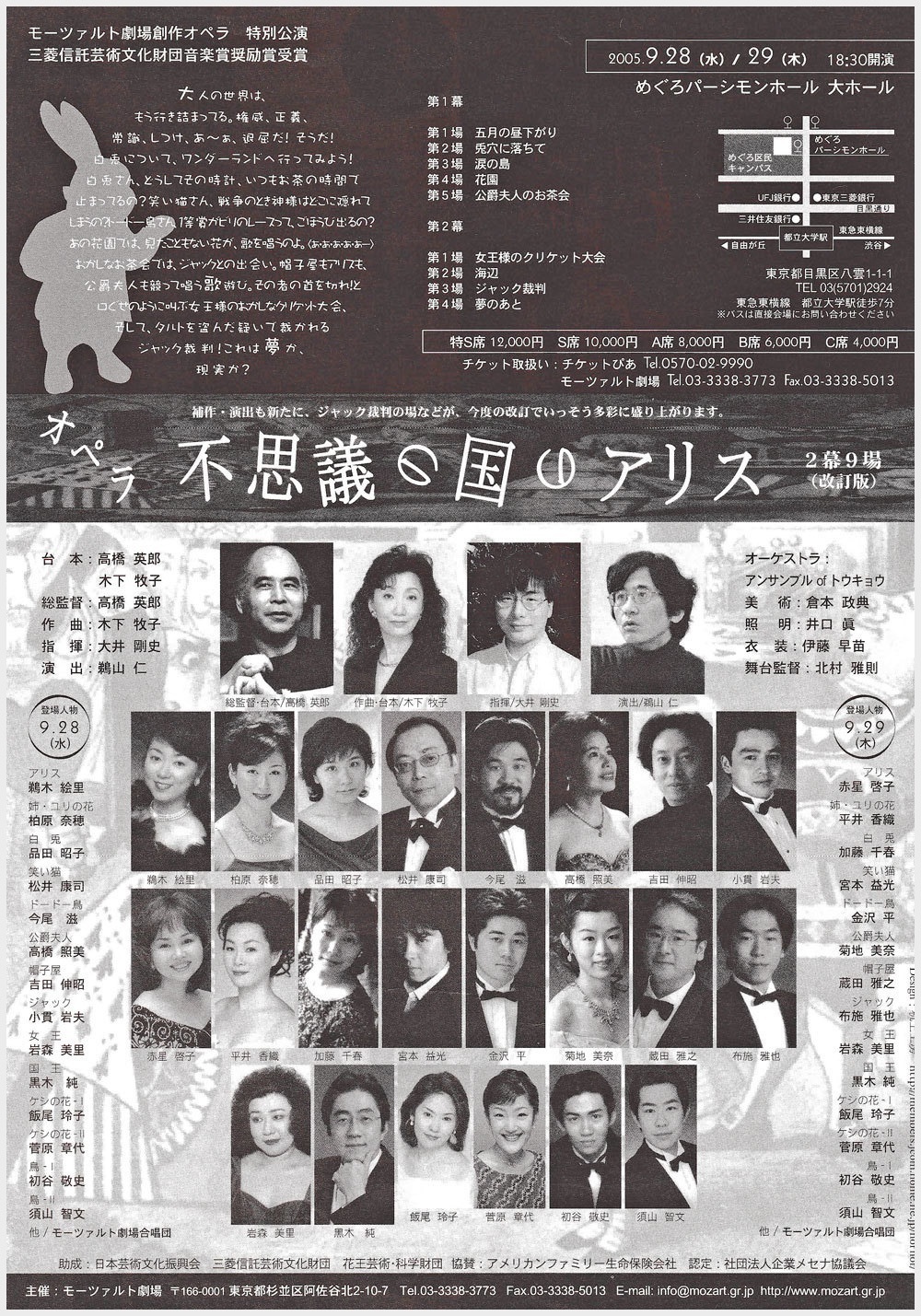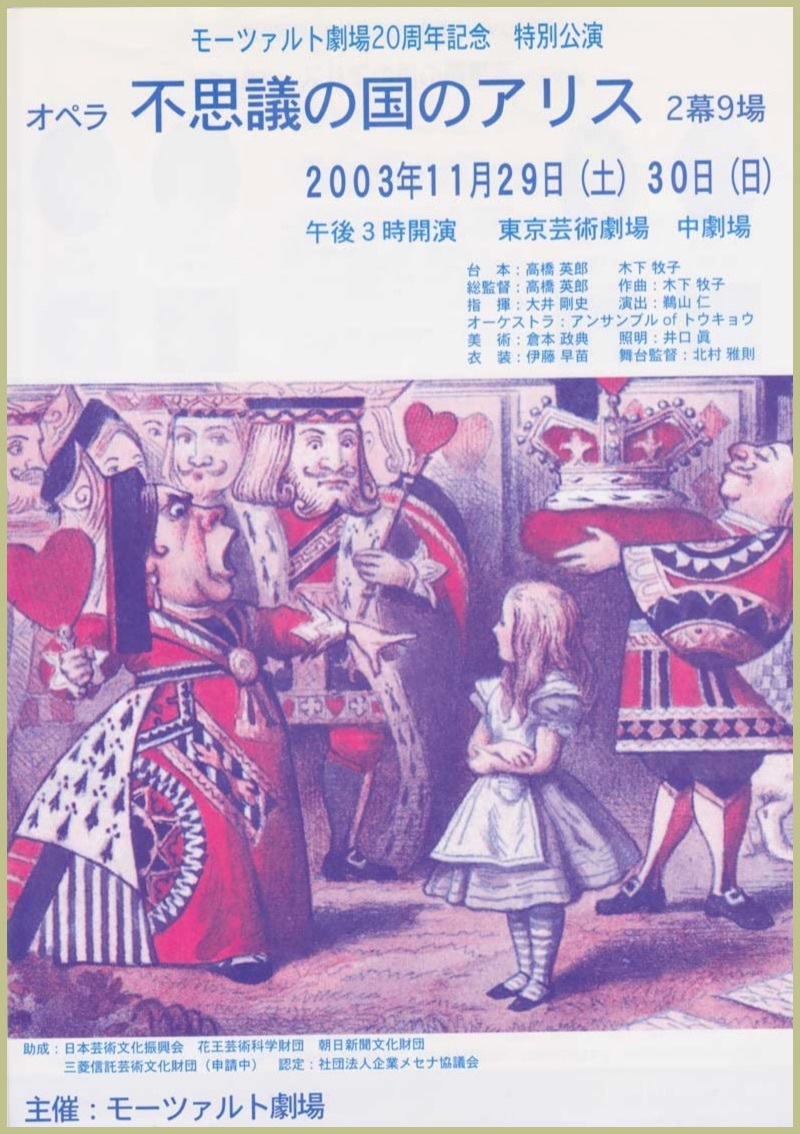 ●キャスト アリス:鵜木絵里・赤星啓子 姉・ユリ:柏原奈穂・平井香織 白うさぎ:品田昭子・加藤千春 笑い猫:松井康司・宮本益光 ドードー鳥:今尾 滋・金沢 平 公爵夫人:高橋照美・菊地美奈 女王:岩森美里(両日) ジャック:小貫岩夫・布施雅也 帽子屋:吉田伸昭・蔵田雅之 王様:黒木 純(両日) けし12:飯尾玲子・菅原章代(両日) 庭師他:初谷敬史・須山智文(両日) モーツァルト劇場合唱団