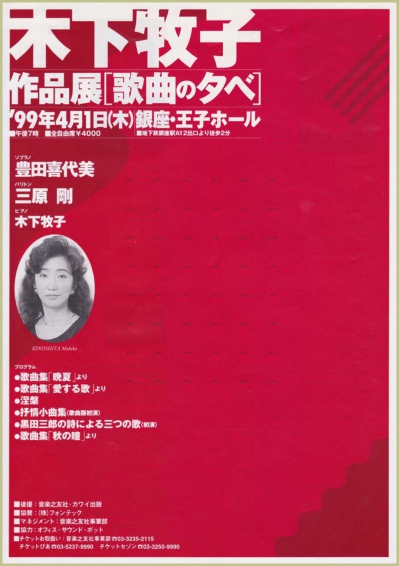 ●曲目 全作曲:木下牧子 「抒情小曲集」より 「愛する歌」より 「晩夏」より 「六つの浪漫」より 「秋の瞳」より 「古風な月」より 「動物詩集」より ゆうぐれ 「花のかず」より しぬまえにおじいさんがいったこと 私が死んでも 「竹久夢二の詩による7つの歌」全曲