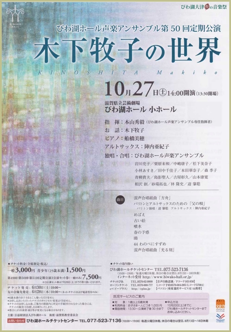 ●曲目 全作曲:木下牧子 [合唱]混声合唱組曲「方舟」より、「花のかず」より、「愛する歌」より、「アカペラ・コーラス・セレクション」より/[歌曲]歌曲集「父の唄」、「涅槃」、「抒情小曲集」より