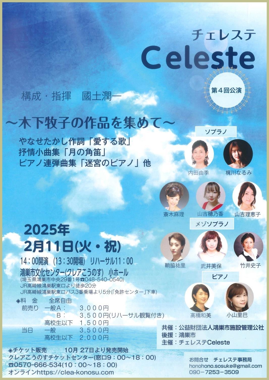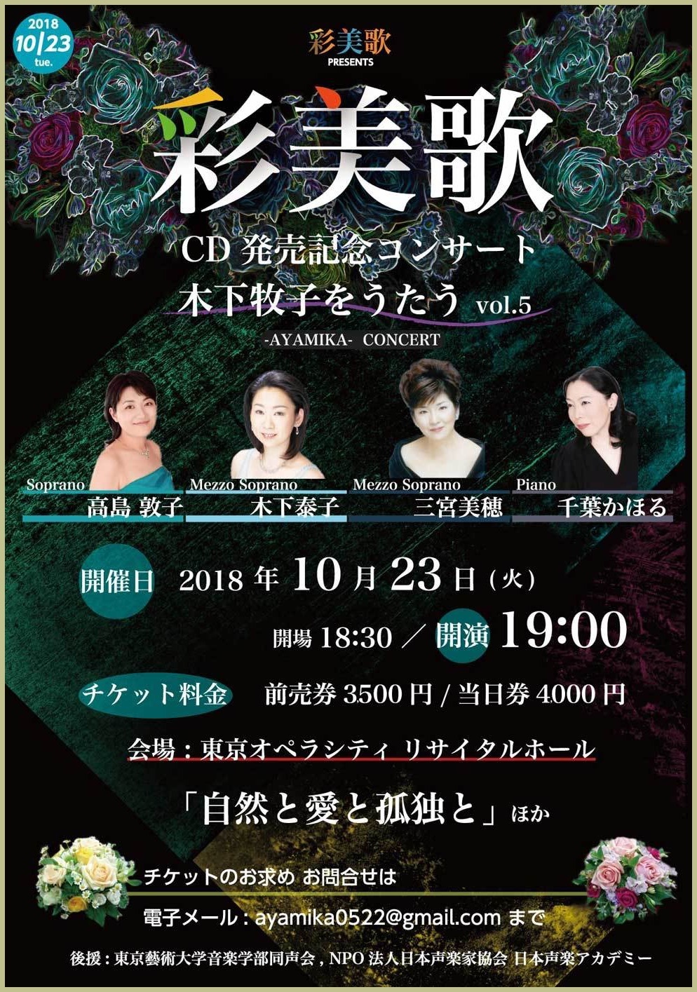 ●出演 公演監督.S.篠原美幸 Vo.荒尾公美子 石井浩子 大濱杏奈 武智美奈 津田基子 西田想人美 沼田葉子 畑田弘美 別所香穂 矢内絵利子 山本伸子 児玉裕子 安井裕子 藤井零治 Pf.今岡淑子 小林美智