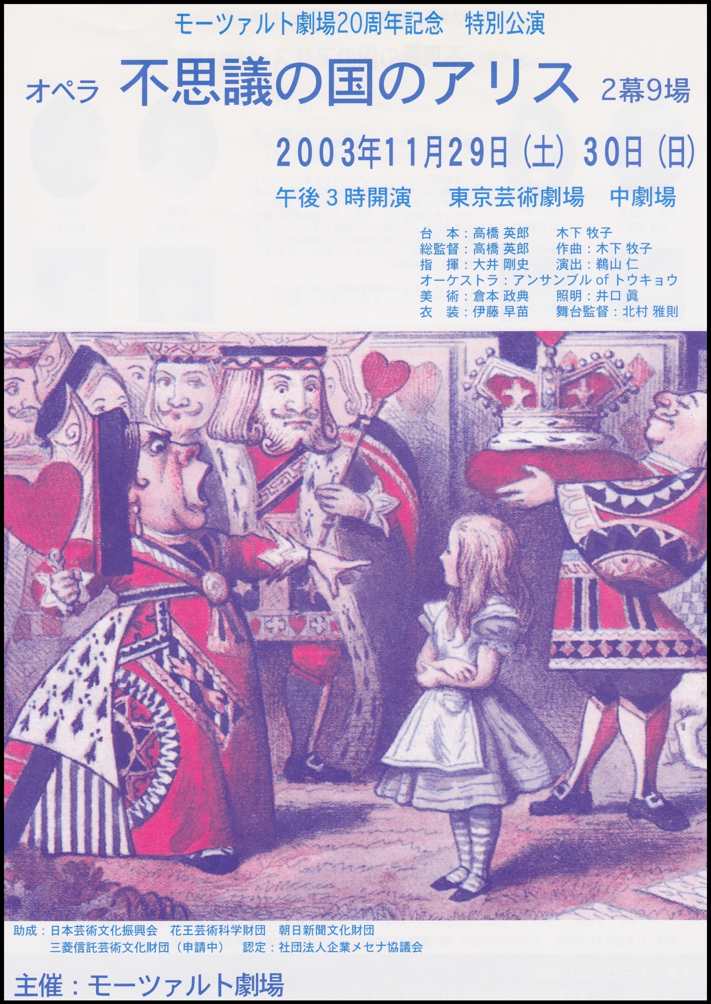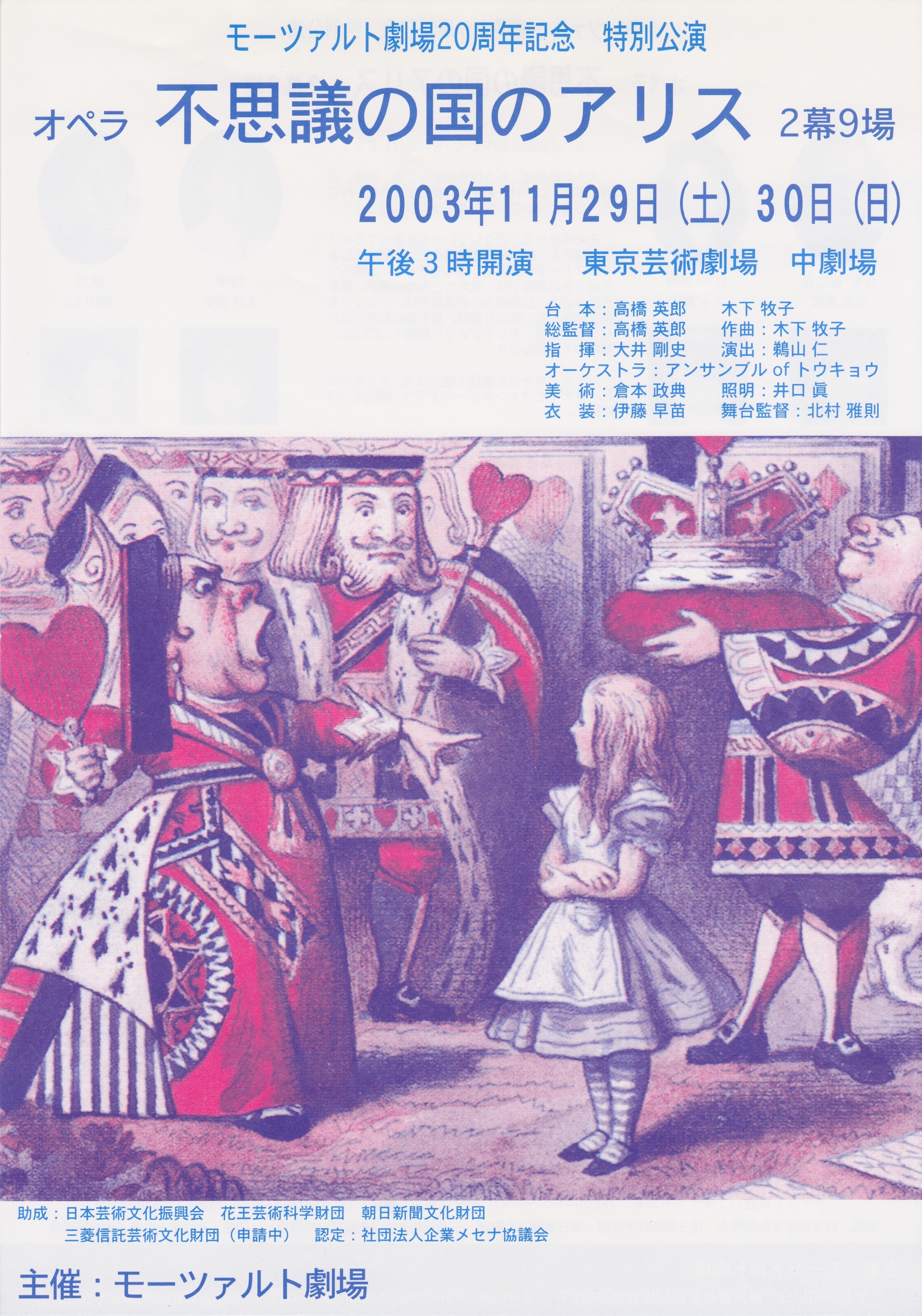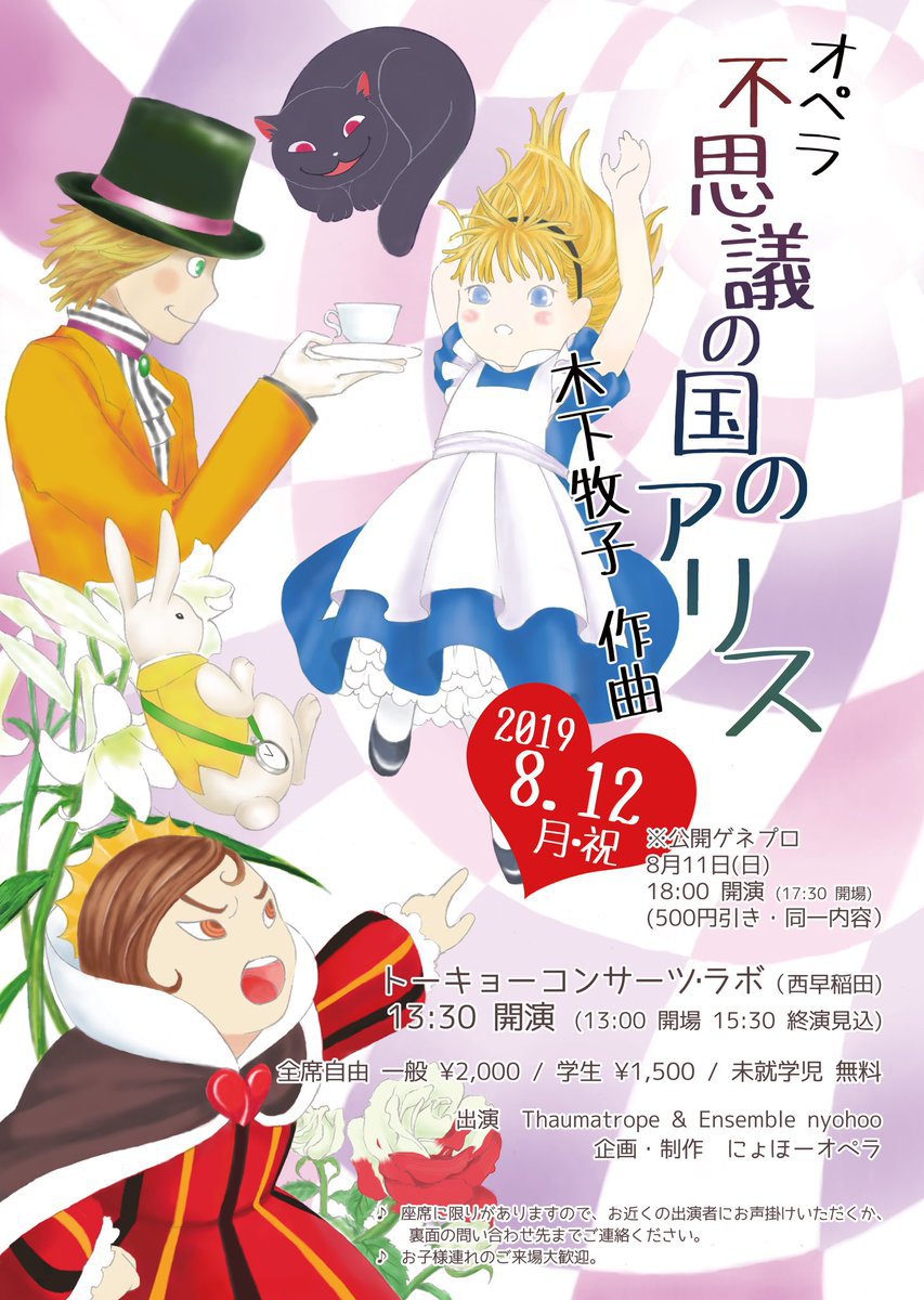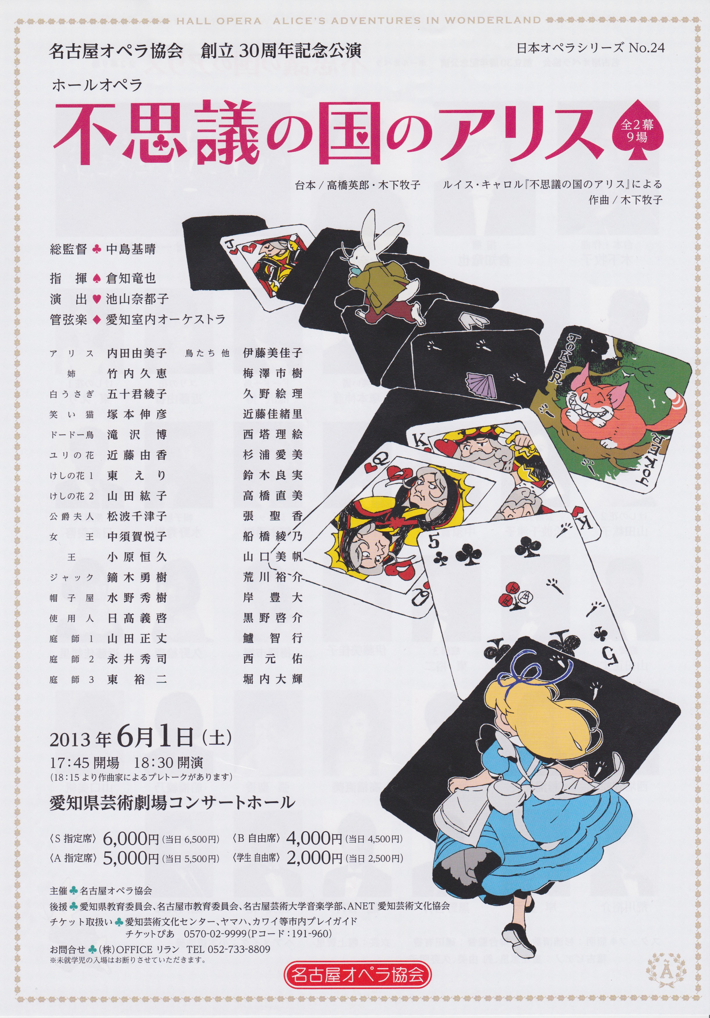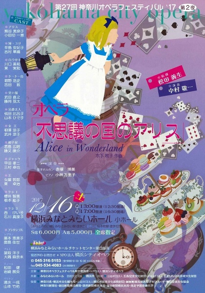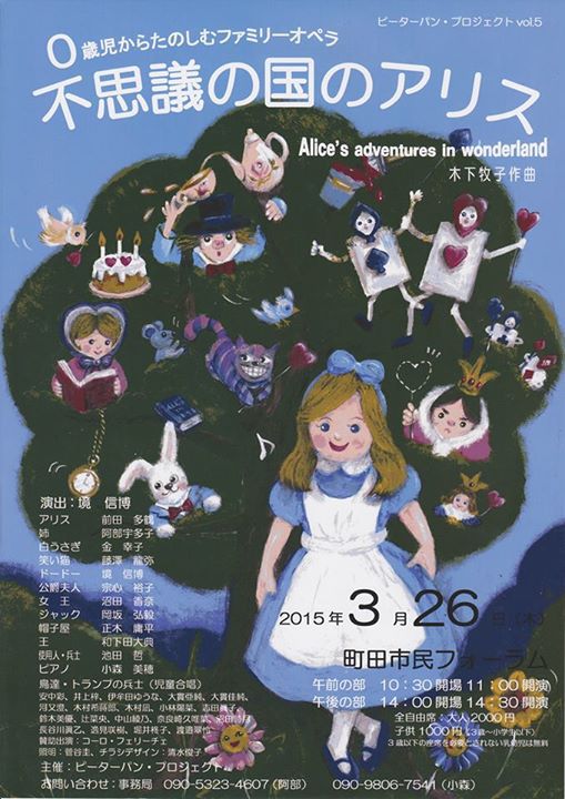 オペラ「不思議の国のアリス」ちらしコレクション(25) ※画像をクリックすると拡大します。 '24. 1/13 (土)昼,夜 1/14(日)昼,夜一般社団法人 奏楽会日経ホール演/中村敬一 指/平野桂子♦︎ ♦︎ ♦︎ ♦︎ ♦︎ '23. 11/19 (日)函館オペラの会函館市民会館大ホール演/中村勝男 指/阿部哲治♦︎ ♦︎ ♦︎ ♦︎ ♦︎ '23. 2/23(木/祝) にしのみやオペラアミティ•ベイコムホール演/中村敬一 指/瀬山智博♦︎ ♦︎ ♦︎ ♦︎ ♦︎ '22. 5/5 (木/祝) オペラカッフェマッキアート58滝野川会館大ホール演/塙 翔平 指/谷本喜基 ♦︎ ♦︎ ♦︎ ♦︎ ♦︎ '21. 12/5 (木) サラマンカホール主催サラマンカホール演/乃村健一 指/倉知竜也 ♦︎ ♦︎ ♦︎ ♦︎ ♦︎ '19. 8/12 (月/祝)にょほーオペラ東京コンサーツ・ラボ演/にょほーおぺら 指/町村 彰♦︎ ♦︎ ♦︎ ♦︎ ♦︎ '18. 8/11 (土)横浜シティオペラ横浜みなとみらい大演/中村敬一♦︎ ♦︎ ♦︎ ♦︎ ♦︎ '18. 6/30 (土) 昼,夜 7/1 (日) 午前,午後稲葉地オペラ振興会名古屋市東文化小劇場演/池山奈都子 指/柴田 祥♦︎ ♦︎ ♦︎ ♦︎ ♦︎ '17. 12/16 (土) 昼,夜横浜シティオペラ横浜みなとみらい小演/中村敬一 指/松田義生♦︎ ♦︎ ♦︎ ♦︎ ♦︎ '17. 11/23 (木) 昼,夜 11/24 (金) 夜 北海道二期会札幌市教育文化会館小演/齊藤雅彰 指/鎌倉亮太♦︎ ♦︎ ♦︎ ♦︎ ♦︎ '17.3/25 (土)びわ湖 H 声楽アンサンブル主催:びわ湖ホール演/岩田達宗 指/大井剛史♦︎ ♦︎ ♦︎ ♦︎ ♦︎ '16.8/21 (日)オペラ•ディ•ファミーユ静岡音楽館AOIホール演/澤井妃巳乃 指/野間春正♦︎ ♦︎ ♦︎ ♦︎ ♦︎ '15.12/10 (木) 昼,夜いちおぺら豊島区民文化ホール演/いちおぺら 指/松田義生 ♦︎ ♦︎ ♦︎ ♦︎ ♦︎ '15.12/5 (土) 昼,夜横浜シティオペラ横浜みなとみらい小演/中村敬一 指/増田宏昭♦︎ ♦︎ ♦︎ ♦︎ ♦︎ '15.3/26 (木) 午前,昼ピーターパン・プロジェクト町田市民フォーラム演/境 信博♦︎ ♦︎ ♦︎ ♦︎ ♦︎ '15.2/27(金)28(土)名古屋芸術大学名古屋市千種文化小劇場演/澤脇達晴 指/山田正丈♦︎ ♦︎ ♦︎ ♦︎ ♦︎ '14.12/20 (土)八重奏版 委嘱初演名古屋オペラ協会主催:サラマンカホール演/池山奈都子 指/倉知竜也♦︎ ♦︎ ♦︎ ♦︎ ♦︎ '14.10/19 (日) おおいたオペラカンパニーホルトホール大分大ホール演出/薗田幹輝夫 指/楠本龍一♦︎ ♦︎ ♦︎ ♦︎ ♦︎ '13.12/7(土) 昼,夜 12/8(日) 昼北海道二期会札幌市教育文化会館小演/齊藤雅彰 指/鎌倉亮太♦︎ ♦︎ ♦︎ ♦︎ ♦︎ '13.6/1 (土) 名古屋オペラ協会愛知県芸劇コンサートH演/池山奈都子 指/倉知竜也♦︎ ♦︎ ♦︎ ♦︎ ♦︎ '11.3/30 (水)大阪音楽大学学生自主堺市民会館大ホール演/村上智香 指/清水一生♦︎ ♦︎ ♦︎ ♦︎ ♦︎ '10. 8/22 (日)オペラ•ディ•ファミーユ静岡音楽館AOIホール演/小野初美♦︎ ♦︎ ♦︎ ♦︎ ♦︎ '09.12/5(土) 6(日) 東京室内歌劇場ル テアトル銀座演/鵜山 仁 指/大勝秀也♦︎ ♦︎ ♦︎ ♦︎ ♦︎ '05.9/28(水) 29(木)二管オケ版 改訂初演モーツァルト劇場めぐろパーシモン大演/鵜山 仁 指/大井剛史 ♦︎ ♦︎ ♦︎ ♦︎ ♦︎ '03.11/29(土)30(日)二管オケ版 委嘱初演モーツァルト劇場東京芸術劇場中演/鵜山 仁 指/大井剛史 ♦︎ ♦︎ ♦︎ ♦︎ ♦︎ ページトップへ