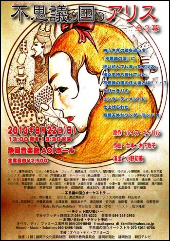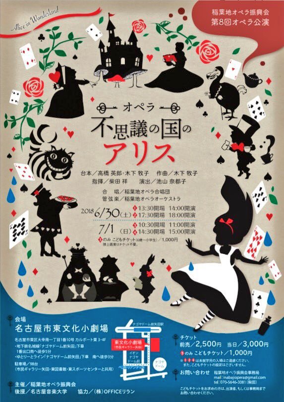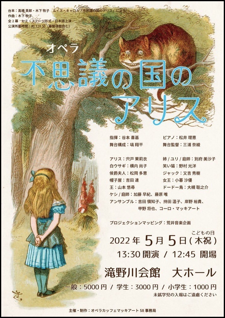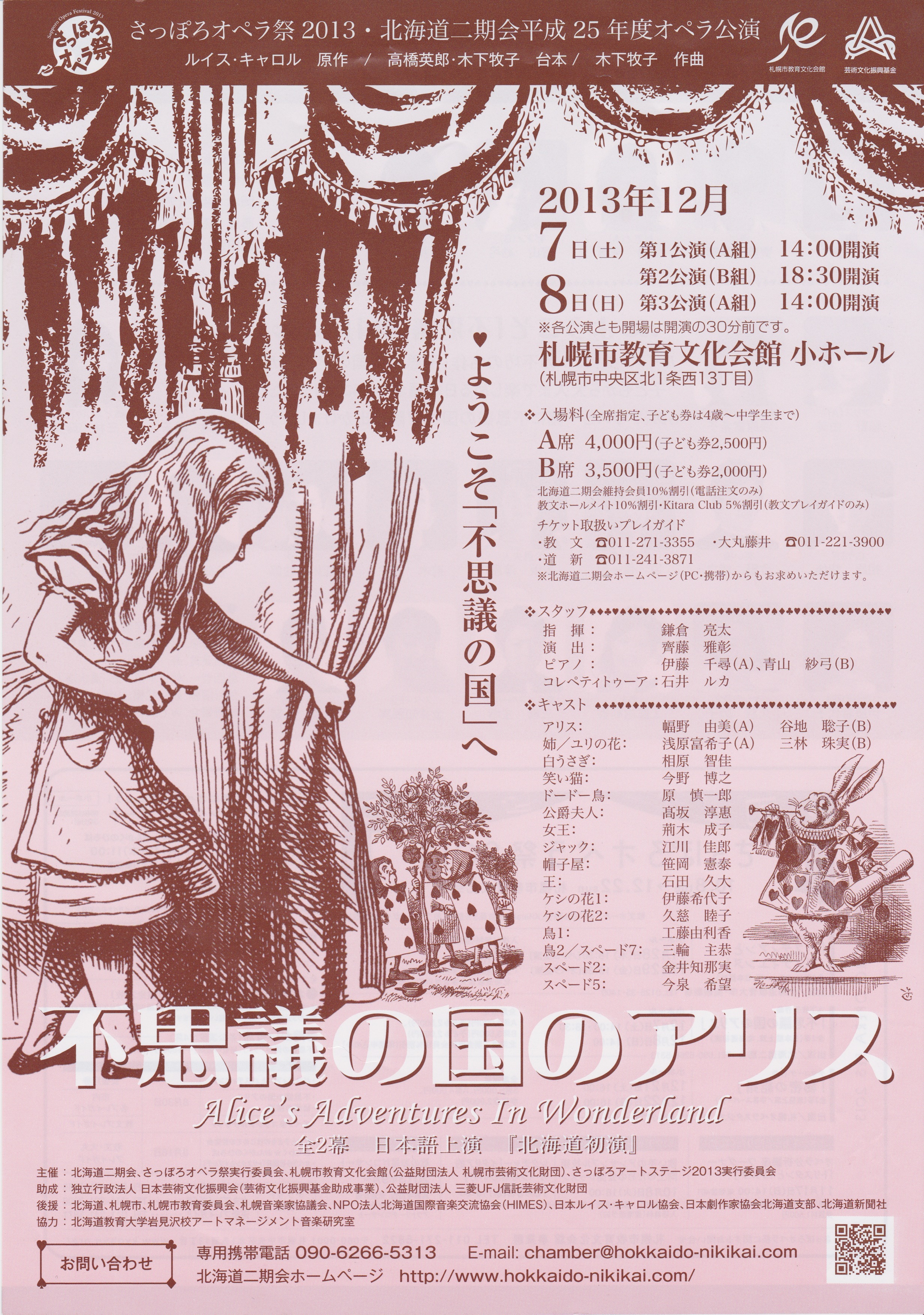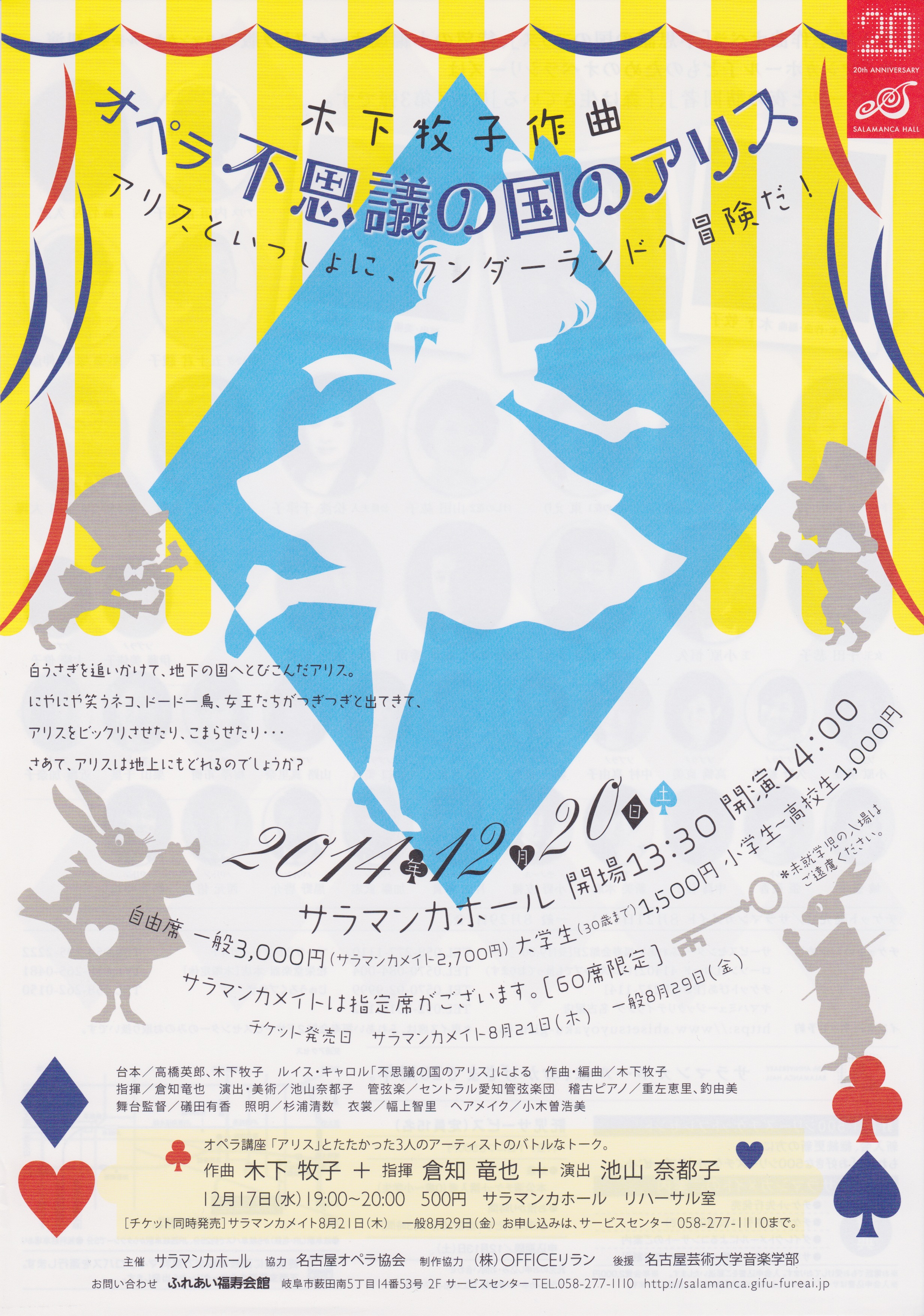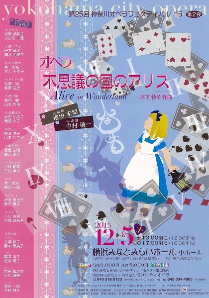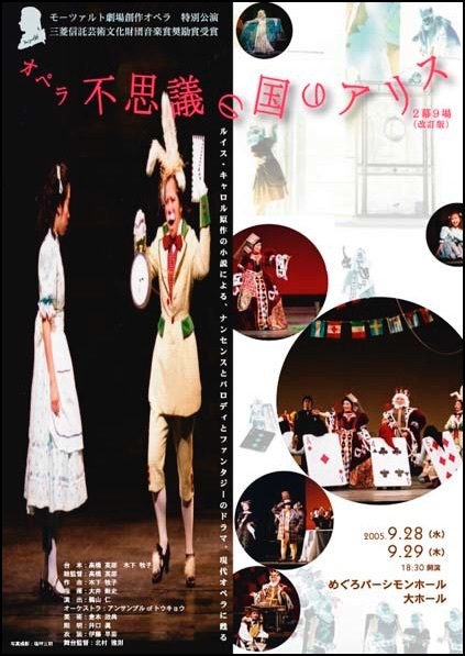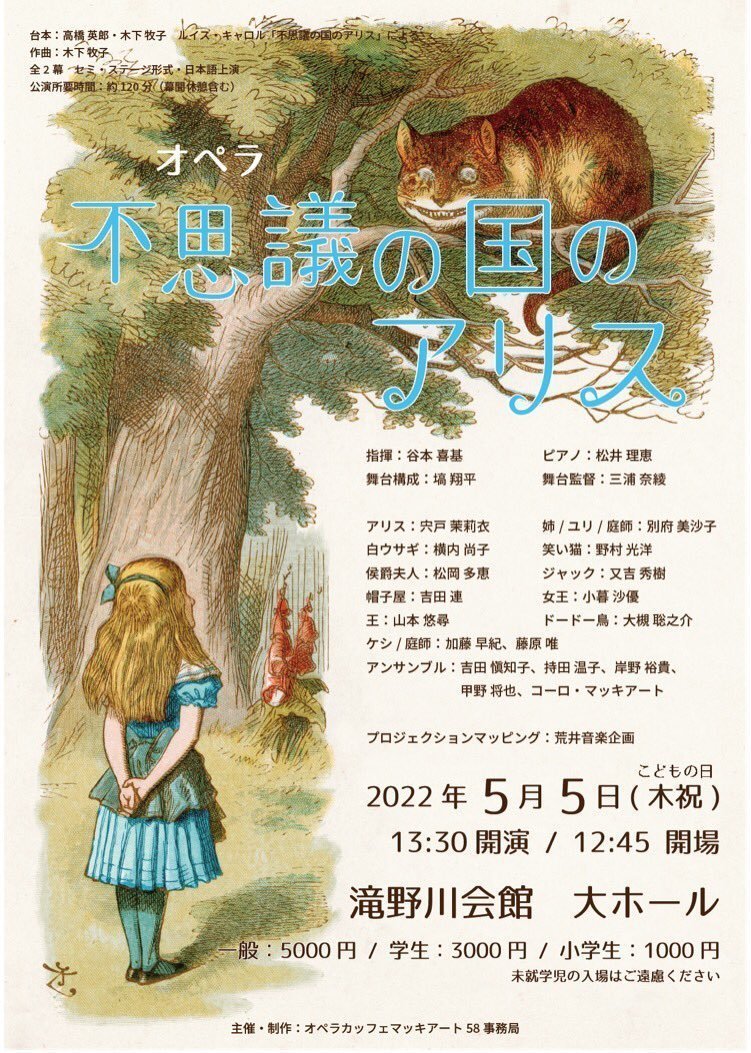 オペラ「不思議の国のアリス」ちらしコレクション(25) ※画像をクリックすると拡大します。 '24. 1/13 (土)昼,夜 1/14(日)昼,夜一般社団法人 奏楽会日経ホール演/中村敬一 指/平野桂子♦︎ ♦︎ ♦︎ ♦︎ ♦︎ '23. 11/19 (日)函館オペラの会函館市民会館大ホール演/中村勝男 指/阿部哲治♦︎ ♦︎ ♦︎ ♦︎ ♦︎ '23. 2/23(木/祝) にしのみやオペラアミティ•ベイコムホール演/中村敬一 指/瀬山智博♦︎ ♦︎ ♦︎ ♦︎ ♦︎ '22. 5/5 (木/祝) オペラカッフェマッキアート58滝野川会館大ホール演/塙 翔平 指/谷本喜基 ♦︎ ♦︎ ♦︎ ♦︎ ♦︎ '21. 12/5 (木) サラマンカホール主催サラマンカホール演/乃村健一 指/倉知竜也 ♦︎ ♦︎ ♦︎ ♦︎ ♦︎ '19. 8/12 (月/祝)にょほーオペラ東京コンサーツ・ラボ演/にょほーおぺら 指/町村 彰♦︎ ♦︎ ♦︎ ♦︎ ♦︎ '18. 8/11 (土)横浜シティオペラ横浜みなとみらい大演/中村敬一♦︎ ♦︎ ♦︎ ♦︎ ♦︎ '18. 6/30 (土) 昼,夜 7/1 (日) 午前,午後稲葉地オペラ振興会名古屋市東文化小劇場演/池山奈都子 指/柴田 祥♦︎ ♦︎ ♦︎ ♦︎ ♦︎ '17. 12/16 (土) 昼,夜横浜シティオペラ横浜みなとみらい小演/中村敬一 指/松田義生♦︎ ♦︎ ♦︎ ♦︎ ♦︎ '17. 11/23 (木) 昼,夜 11/24 (金) 夜 北海道二期会札幌市教育文化会館小演/齊藤雅彰 指/鎌倉亮太♦︎ ♦︎ ♦︎ ♦︎ ♦︎ '17.3/25 (土)びわ湖 H 声楽アンサンブル主催:びわ湖ホール演/岩田達宗 指/大井剛史♦︎ ♦︎ ♦︎ ♦︎ ♦︎ '16.8/21 (日)オペラ•ディ•ファミーユ静岡音楽館AOIホール演/澤井妃巳乃 指/野間春正♦︎ ♦︎ ♦︎ ♦︎ ♦︎ '15.12/10 (木) 昼,夜いちおぺら豊島区民文化ホール演/いちおぺら 指/松田義生 ♦︎ ♦︎ ♦︎ ♦︎ ♦︎ '15.12/5 (土) 昼,夜横浜シティオペラ横浜みなとみらい小演/中村敬一 指/増田宏昭♦︎ ♦︎ ♦︎ ♦︎ ♦︎ '15.3/26 (木) 午前,昼ピーターパン・プロジェクト町田市民フォーラム演/境 信博♦︎ ♦︎ ♦︎ ♦︎ ♦︎ '15.2/27(金)28(土)名古屋芸術大学名古屋市千種文化小劇場演/澤脇達晴 指/山田正丈♦︎ ♦︎ ♦︎ ♦︎ ♦︎ '14.12/20 (土)八重奏版 委嘱初演名古屋オペラ協会主催:サラマンカホール演/池山奈都子 指/倉知竜也♦︎ ♦︎ ♦︎ ♦︎ ♦︎ '14.10/19 (日) おおいたオペラカンパニーホルトホール大分大ホール演出/薗田幹輝夫 指/楠本龍一♦︎ ♦︎ ♦︎ ♦︎ ♦︎ '13.12/7(土) 昼,夜 12/8(日) 昼北海道二期会札幌市教育文化会館小演/齊藤雅彰 指/鎌倉亮太♦︎ ♦︎ ♦︎ ♦︎ ♦︎ '13.6/1 (土) 名古屋オペラ協会愛知県芸劇コンサートH演/池山奈都子 指/倉知竜也♦︎ ♦︎ ♦︎ ♦︎ ♦︎ '11.3/30 (水)大阪音楽大学学生自主堺市民会館大ホール演/村上智香 指/清水一生♦︎ ♦︎ ♦︎ ♦︎ ♦︎ '10. 8/22 (日)オペラ•ディ•ファミーユ静岡音楽館AOIホール演/小野初美♦︎ ♦︎ ♦︎ ♦︎ ♦︎ '09.12/5(土) 6(日) 東京室内歌劇場ル テアトル銀座演/鵜山 仁 指/大勝秀也♦︎ ♦︎ ♦︎ ♦︎ ♦︎ '05.9/28(水) 29(木)二管オケ版 改訂初演モーツァルト劇場めぐろパーシモン大演/鵜山 仁 指/大井剛史 ♦︎ ♦︎ ♦︎ ♦︎ ♦︎ '03.11/29(土)30(日)二管オケ版 委嘱初演モーツァルト劇場東京芸術劇場中演/鵜山 仁 指/大井剛史 ♦︎ ♦︎ ♦︎ ♦︎ ♦︎ ページトップへ
