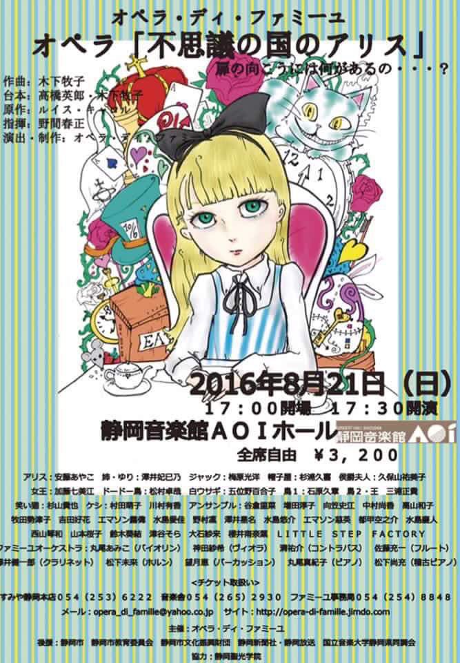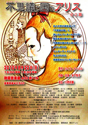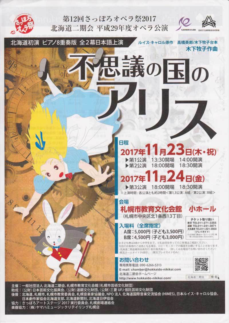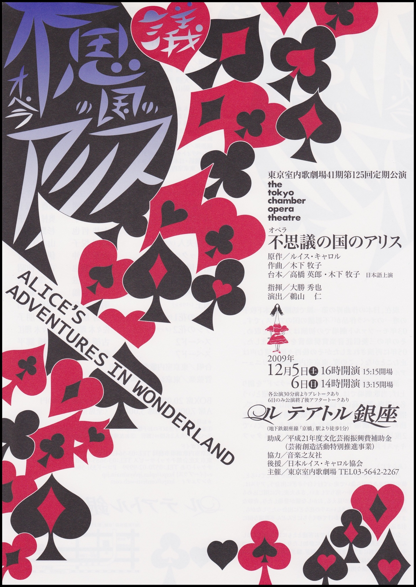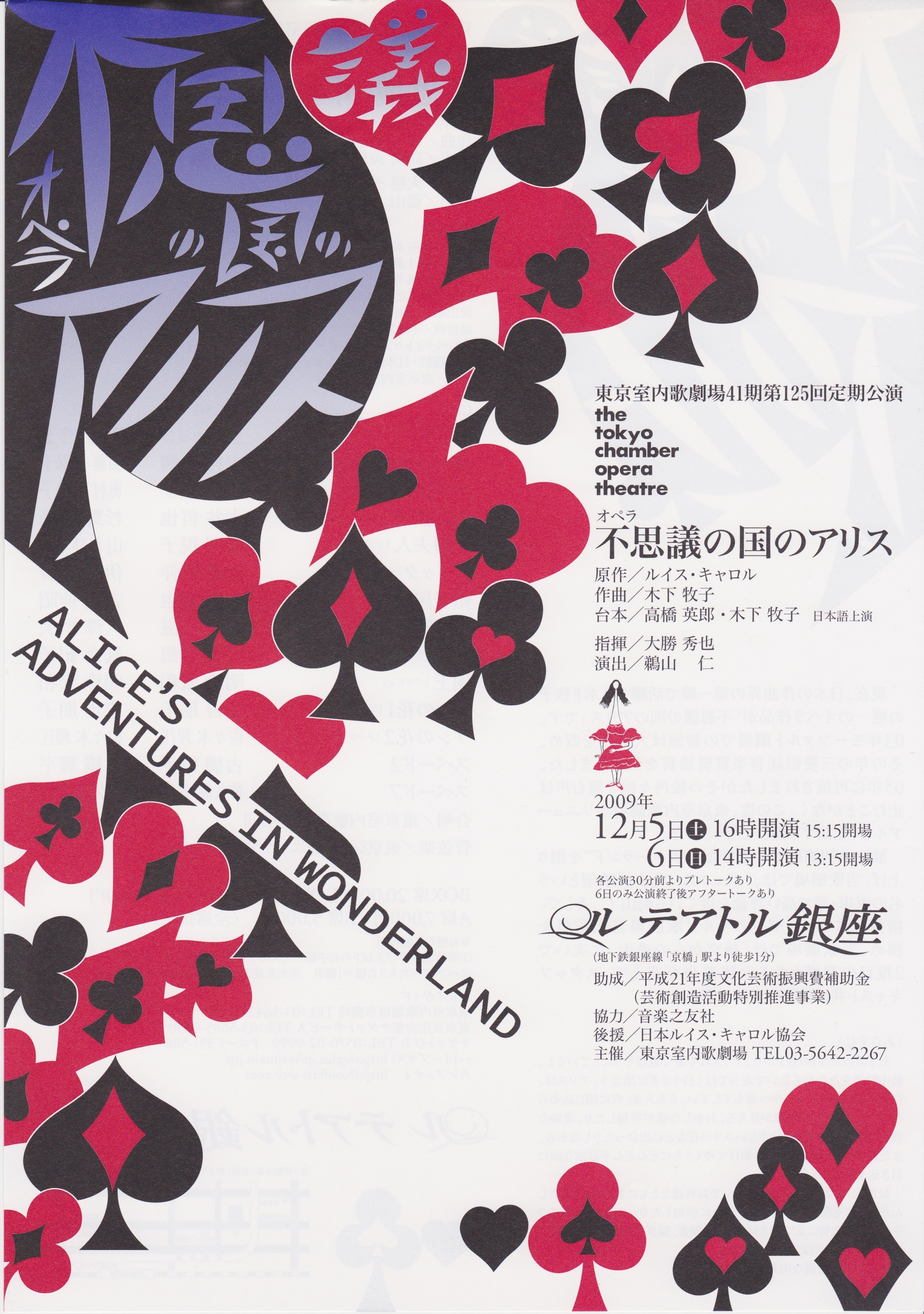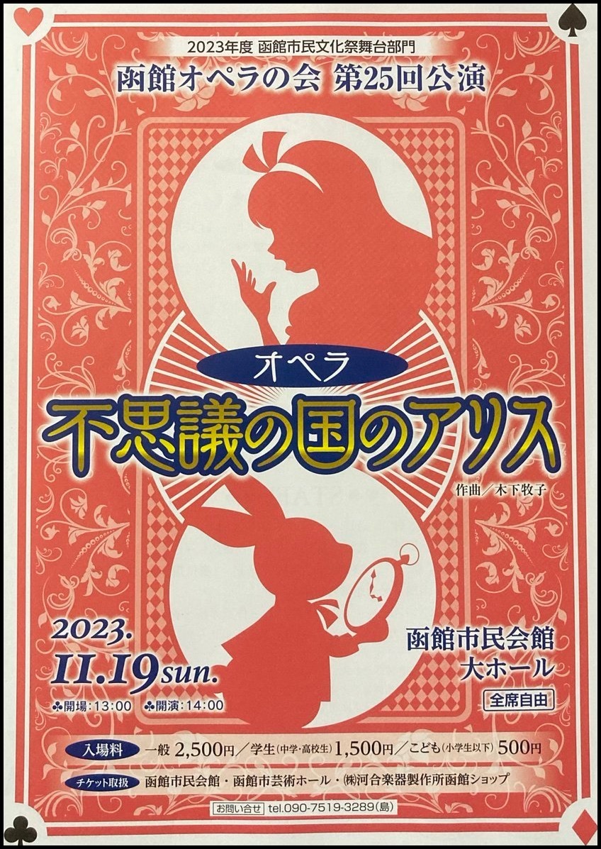 オペラ「不思議の国のアリス」ちらしコレクション(25) ※画像をクリックすると拡大します。 '24. 1/13 (土)昼,夜 1/14(日)昼,夜一般社団法人 奏楽会日経ホール演/中村敬一 指/平野桂子♦︎ ♦︎ ♦︎ ♦︎ ♦︎ '23. 11/19 (日)函館オペラの会函館市民会館大ホール演/中村勝男 指/阿部哲治♦︎ ♦︎ ♦︎ ♦︎ ♦︎ '23. 2/23(木/祝) にしのみやオペラアミティ•ベイコムホール演/中村敬一 指/瀬山智博♦︎ ♦︎ ♦︎ ♦︎ ♦︎ '22. 5/5 (木/祝) オペラカッフェマッキアート58滝野川会館大ホール演/塙 翔平 指/谷本喜基 ♦︎ ♦︎ ♦︎ ♦︎ ♦︎ '21. 12/5 (木) サラマンカホール主催サラマンカホール演/乃村健一 指/倉知竜也 ♦︎ ♦︎ ♦︎ ♦︎ ♦︎ '19. 8/12 (月/祝)にょほーオペラ東京コンサーツ・ラボ演/にょほーおぺら 指/町村 彰♦︎ ♦︎ ♦︎ ♦︎ ♦︎ '18. 8/11 (土)横浜シティオペラ横浜みなとみらい大演/中村敬一♦︎ ♦︎ ♦︎ ♦︎ ♦︎ '18. 6/30 (土) 昼,夜 7/1 (日) 午前,午後稲葉地オペラ振興会名古屋市東文化小劇場演/池山奈都子 指/柴田 祥♦︎ ♦︎ ♦︎ ♦︎ ♦︎ '17. 12/16 (土) 昼,夜横浜シティオペラ横浜みなとみらい小演/中村敬一 指/松田義生♦︎ ♦︎ ♦︎ ♦︎ ♦︎ '17. 11/23 (木) 昼,夜 11/24 (金) 夜 北海道二期会札幌市教育文化会館小演/齊藤雅彰 指/鎌倉亮太♦︎ ♦︎ ♦︎ ♦︎ ♦︎ '17.3/25 (土)びわ湖 H 声楽アンサンブル主催:びわ湖ホール演/岩田達宗 指/大井剛史♦︎ ♦︎ ♦︎ ♦︎ ♦︎ '16.8/21 (日)オペラ•ディ•ファミーユ静岡音楽館AOIホール演/澤井妃巳乃 指/野間春正♦︎ ♦︎ ♦︎ ♦︎ ♦︎ '15.12/10 (木) 昼,夜いちおぺら豊島区民文化ホール演/いちおぺら 指/松田義生 ♦︎ ♦︎ ♦︎ ♦︎ ♦︎ '15.12/5 (土) 昼,夜横浜シティオペラ横浜みなとみらい小演/中村敬一 指/増田宏昭♦︎ ♦︎ ♦︎ ♦︎ ♦︎ '15.3/26 (木) 午前,昼ピーターパン・プロジェクト町田市民フォーラム演/境 信博♦︎ ♦︎ ♦︎ ♦︎ ♦︎ '15.2/27(金)28(土)名古屋芸術大学名古屋市千種文化小劇場演/澤脇達晴 指/山田正丈♦︎ ♦︎ ♦︎ ♦︎ ♦︎ '14.12/20 (土)八重奏版 委嘱初演名古屋オペラ協会主催:サラマンカホール演/池山奈都子 指/倉知竜也♦︎ ♦︎ ♦︎ ♦︎ ♦︎ '14.10/19 (日) おおいたオペラカンパニーホルトホール大分大ホール演出/薗田幹輝夫 指/楠本龍一♦︎ ♦︎ ♦︎ ♦︎ ♦︎ '13.12/7(土) 昼,夜 12/8(日) 昼北海道二期会札幌市教育文化会館小演/齊藤雅彰 指/鎌倉亮太♦︎ ♦︎ ♦︎ ♦︎ ♦︎ '13.6/1 (土) 名古屋オペラ協会愛知県芸劇コンサートH演/池山奈都子 指/倉知竜也♦︎ ♦︎ ♦︎ ♦︎ ♦︎ '11.3/30 (水)大阪音楽大学学生自主堺市民会館大ホール演/村上智香 指/清水一生♦︎ ♦︎ ♦︎ ♦︎ ♦︎ '10. 8/22 (日)オペラ•ディ•ファミーユ静岡音楽館AOIホール演/小野初美♦︎ ♦︎ ♦︎ ♦︎ ♦︎ '09.12/5(土) 6(日) 東京室内歌劇場ル テアトル銀座演/鵜山 仁 指/大勝秀也♦︎ ♦︎ ♦︎ ♦︎ ♦︎ '05.9/28(水) 29(木)二管オケ版 改訂初演モーツァルト劇場めぐろパーシモン大演/鵜山 仁 指/大井剛史 ♦︎ ♦︎ ♦︎ ♦︎ ♦︎ '03.11/29(土)30(日)二管オケ版 委嘱初演モーツァルト劇場東京芸術劇場中演/鵜山 仁 指/大井剛史 ♦︎ ♦︎ ♦︎ ♦︎ ♦︎ ページトップへ