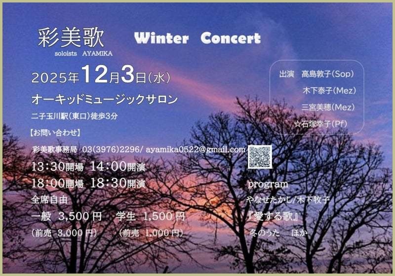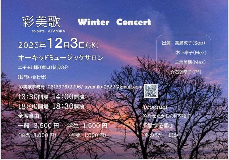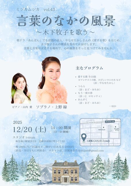 ◆曲目 「ヨコハマ・ストーリー」(青木雅也)、テノまみ特製「スペシャルクリスマスメドレー」、『トゥーランドット』より「誰も寝てはならぬ」、グラナダ(ララ)、竹とんぼに(木下牧子)ほか