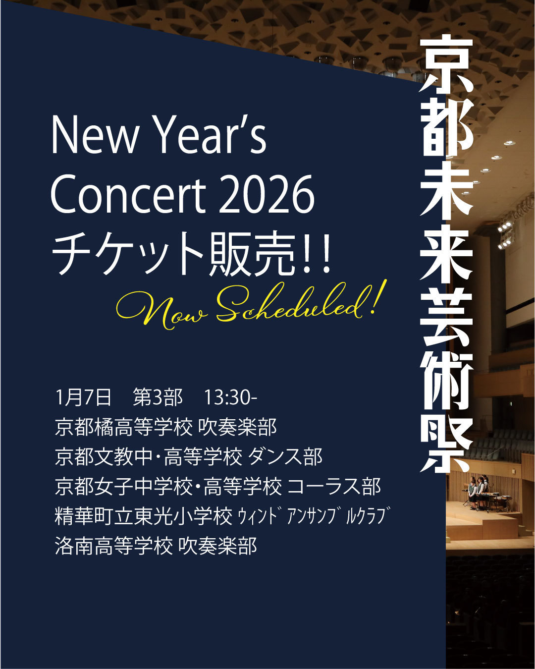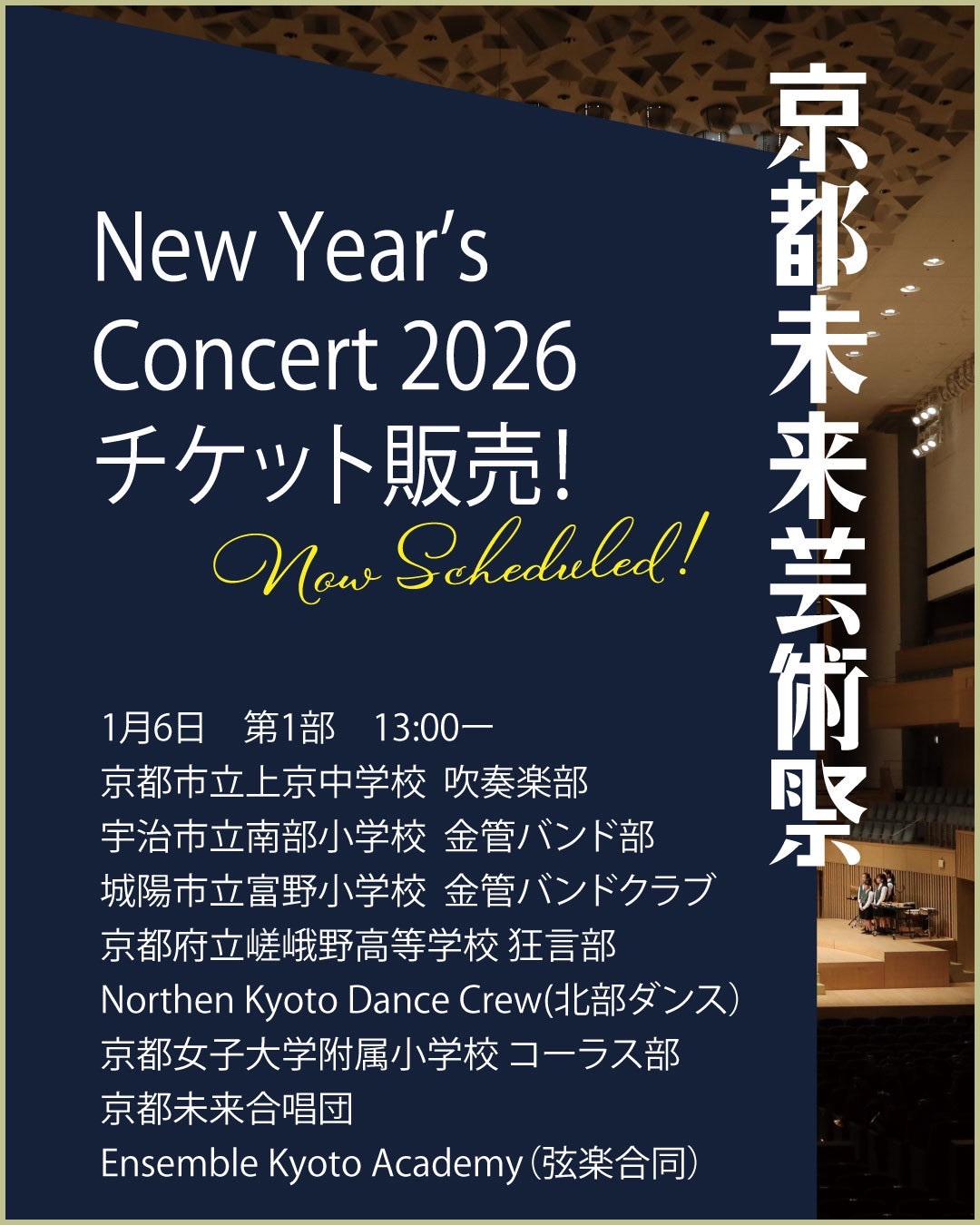 ◆出演 京都市立上京中学校吹奏楽部 宇治市立南部小学校金管バンド部 城陽市立富野小学校金管バンドクラブ 京都府立嵯峨野高校狂言部 Northern Kyoto Dance Crew(北部校ダンス)、京都女子大學付属小学校コーラス部 京都未来合唱団 Ensemble Kyoto Academy(弦楽合同)
