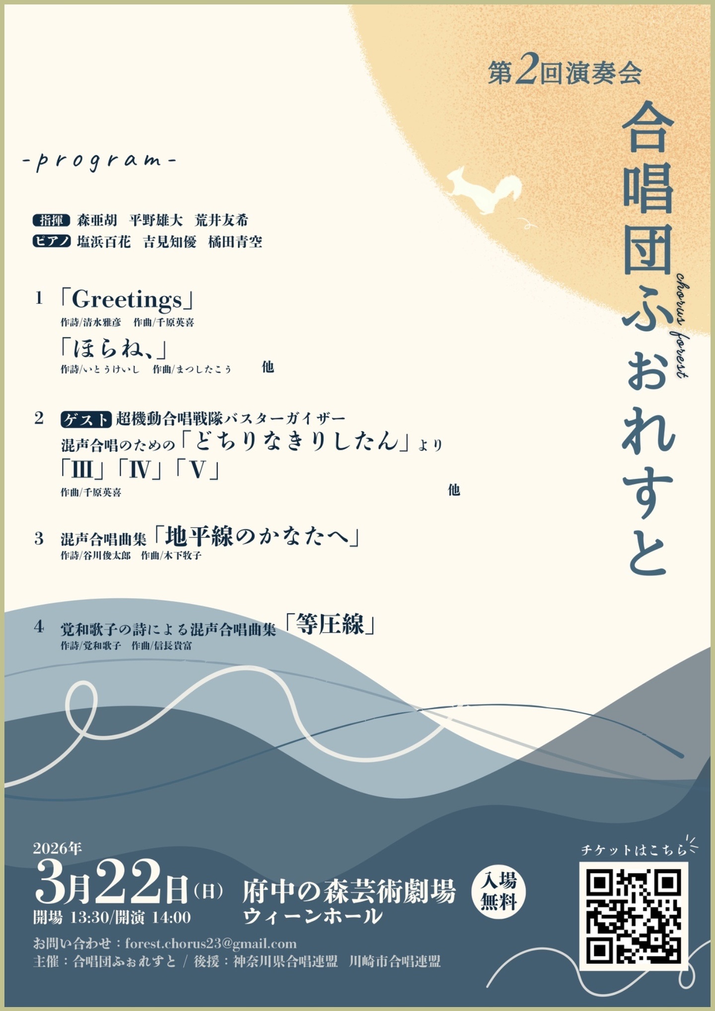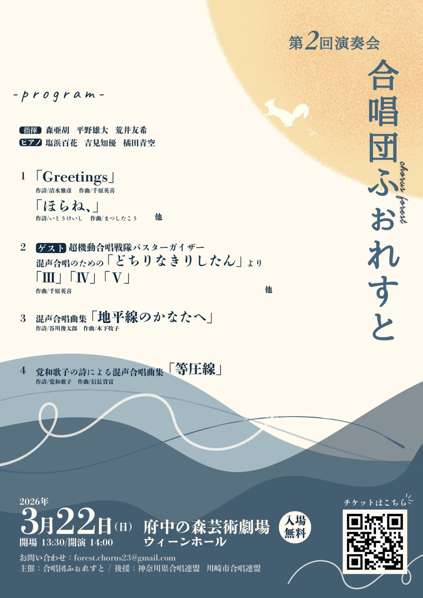 ◆曲目 合唱の部 「鳥のように」(みなつきみのり/木下牧子 委嘱初演 指揮:伊東恵司) 春に 瑠璃色の地球 ◆主催 一般社団法人 京都未来芸術アカデミー 075-741-8843