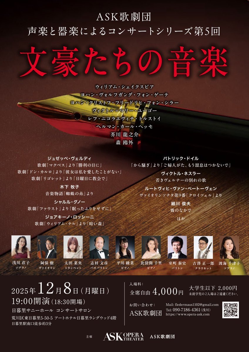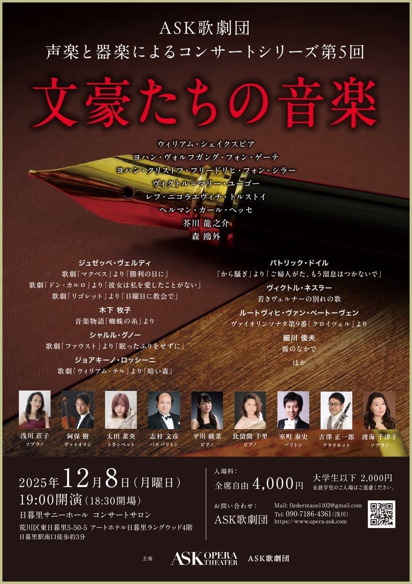 ◆曲目 歌劇「マクベス」(シェクスピア/ヴェルディ)より 他、音楽物語「蜘蛛の糸」より(芥川龍之介/木下牧子)、歌劇「ファウスト」(ゲーテ/グノー)、歌劇「ウィリアム・テル」より(シラー/ロッシーニ)、「から騒ぎ」より(パトリック・ドイル)、若きヴェルナーの別れの歌(ネスラー)、ヴァイオリンソナタ「クロイツェル」より(ベートーヴェン)、霧のなかで(細川俊夫)他