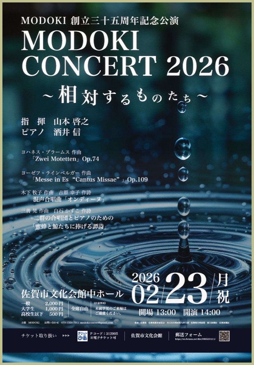 ◆曲目 Zwei Motetten Op.74(ブラームス)、Messe in Es Op.109(ラインベルガー)、混声合唱曲「オンディーヌ」(木下牧子)、2群の合唱団とピアノのための「蜜蜂と鯨たちに捧げる譚詩」(三善 晃)