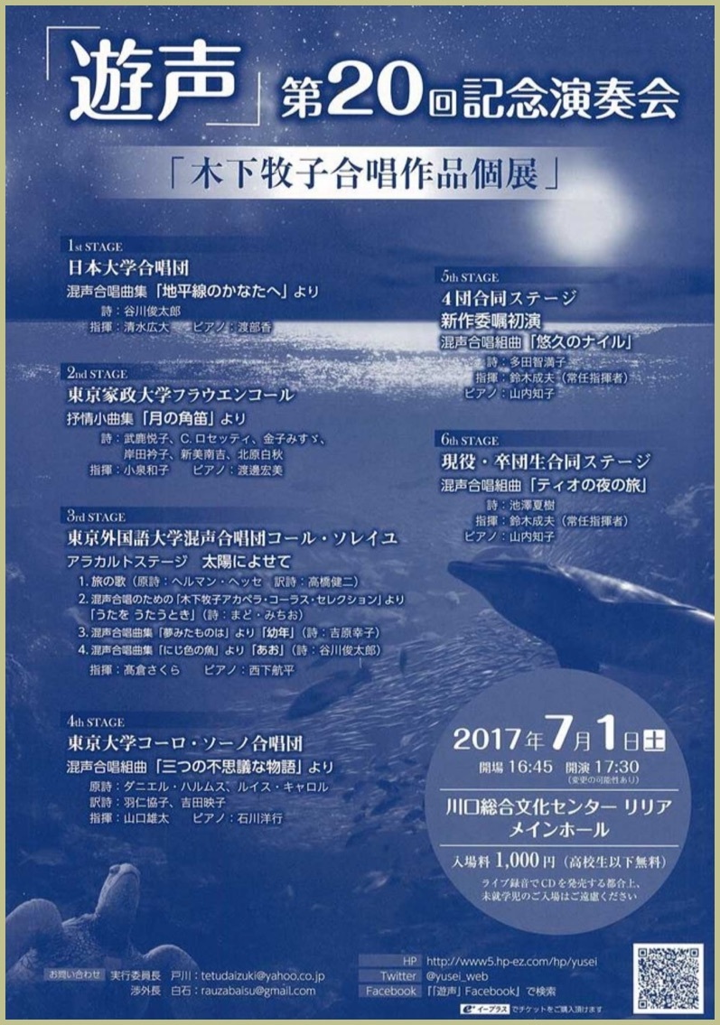 ●出演 木下牧子(ゲスト)清水敬一(司会)ピアノデュオ・パリ・プラハ(十川菜穂、小田裕之)近藤基/信州大学グリークラブ、シナノコラリアーず、清水昭/合唱団ひぐらし/pf.小田裕之、清水敬一/男声合唱団TOKEI/pf.前田勝則、辻秀幸/ラ・カンパネラ/河本充代、中舘伸一/女声合唱団クール・ミルフィーユ、名島啓太/混声合唱団鈴優会/pf.太田由美子、古橋冨士雄/N.F.レディースシンガーズ/pf.秋野淳子、松田乃利子/日本音楽高等学校/pf.小川教子、清水昭・古橋冨士雄/合同合唱/pf.野間春美