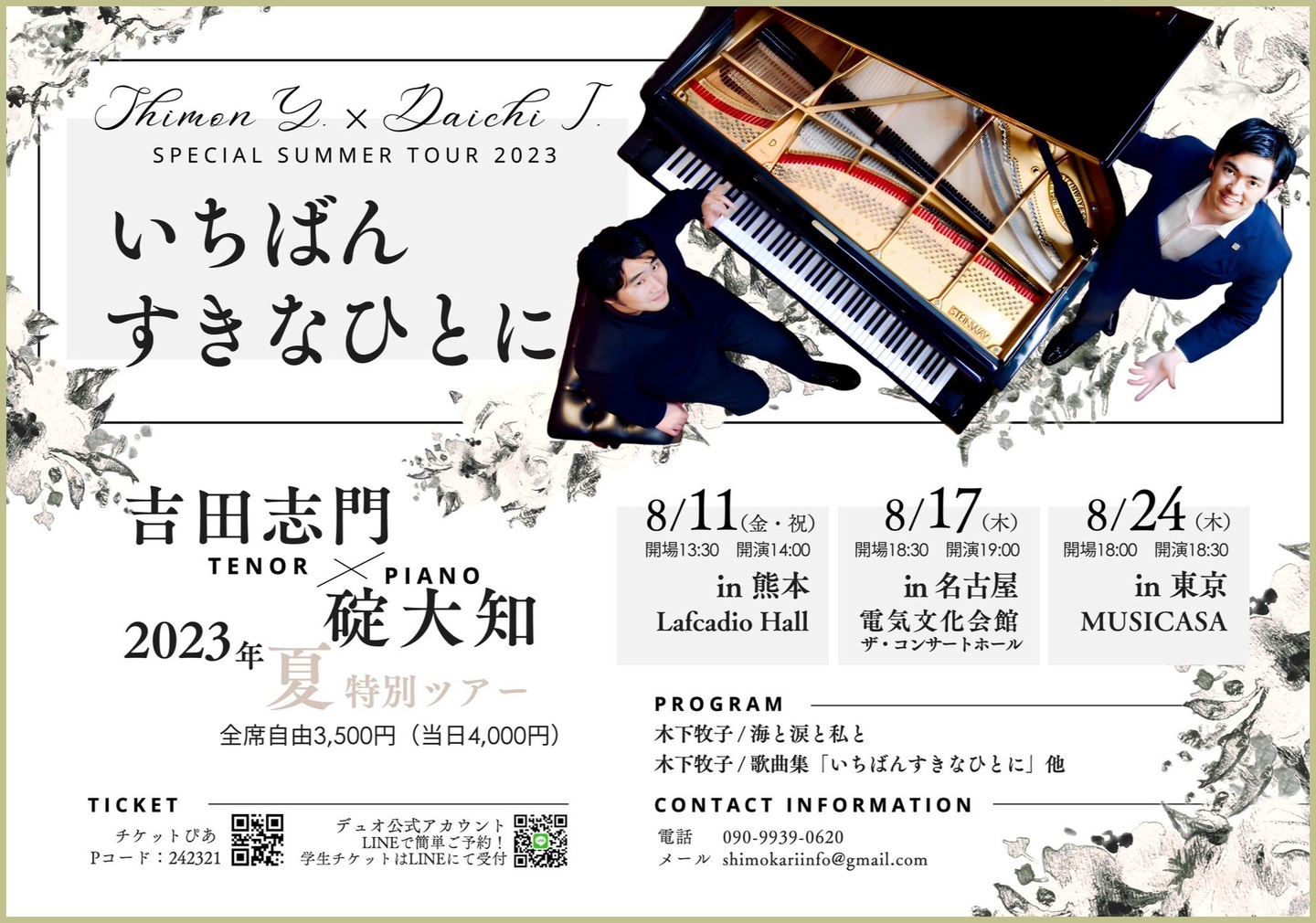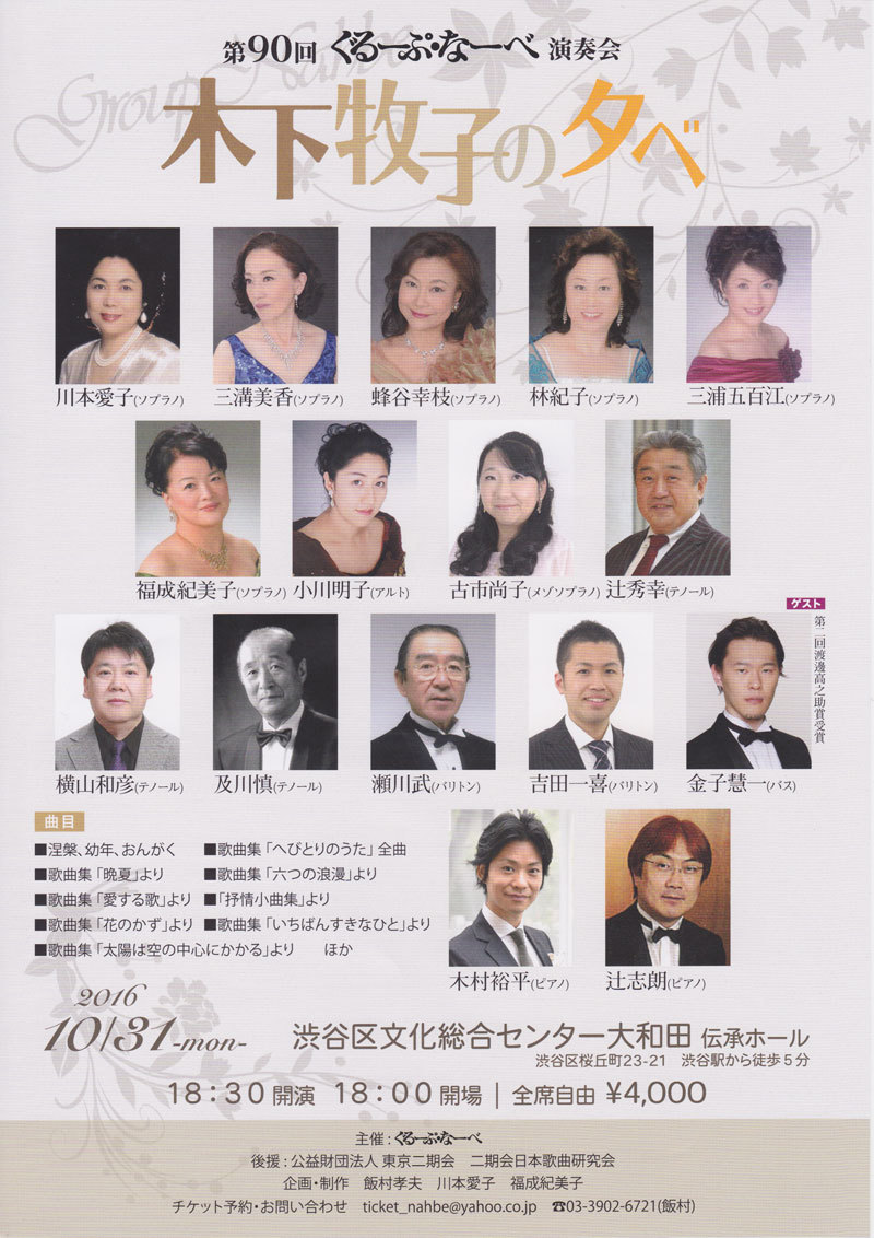 ●出演 公演監督.S.篠原美幸 Vo.荒尾公美子 石井浩子 大濱杏奈 武智美奈 津田基子 西田想人美 沼田葉子 畑田弘美 別所香穂 矢内絵利子 山本伸子 児玉裕子 安井裕子 藤井零治 Pf.今岡淑子 小林美智