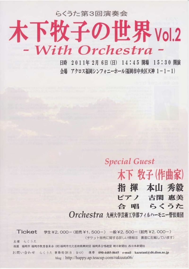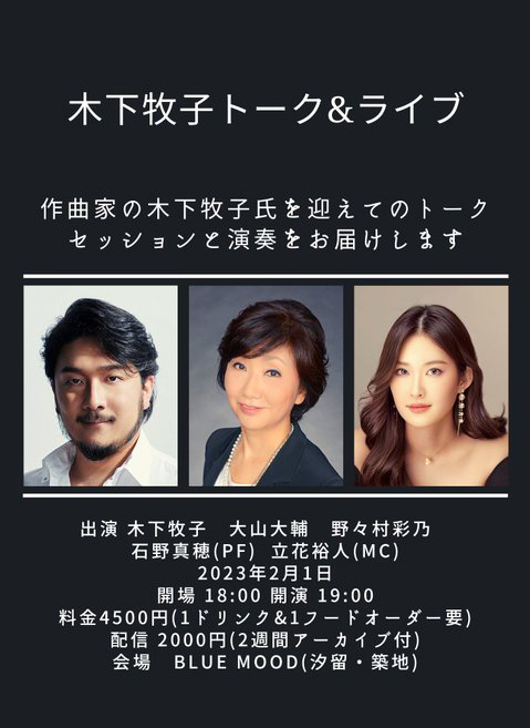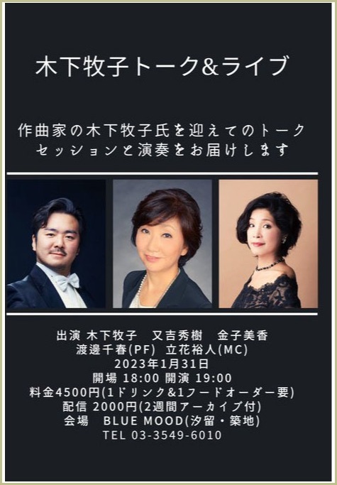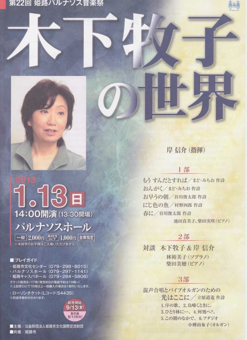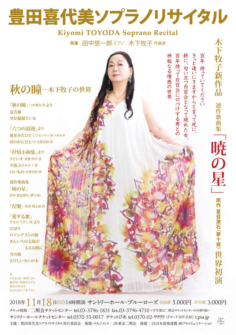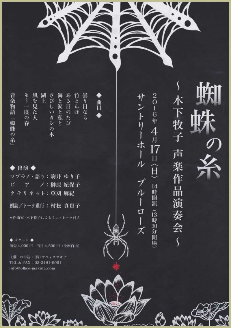 ●曲目 全作曲:木下牧子 「地平線の彼方へ」より/「愛する歌」より/「わたしは風」より/「花のかず」より/「夢みたものは」より/「アカペラ・コーラス・セレクション」より/歌曲:夢みたものは、幼年、風をみたひと/ピアノ連弾「迷宮のピアノ」より/音楽物語「蜘蛛の糸」〜朗読/独唱・クラリネット・ピアノのための