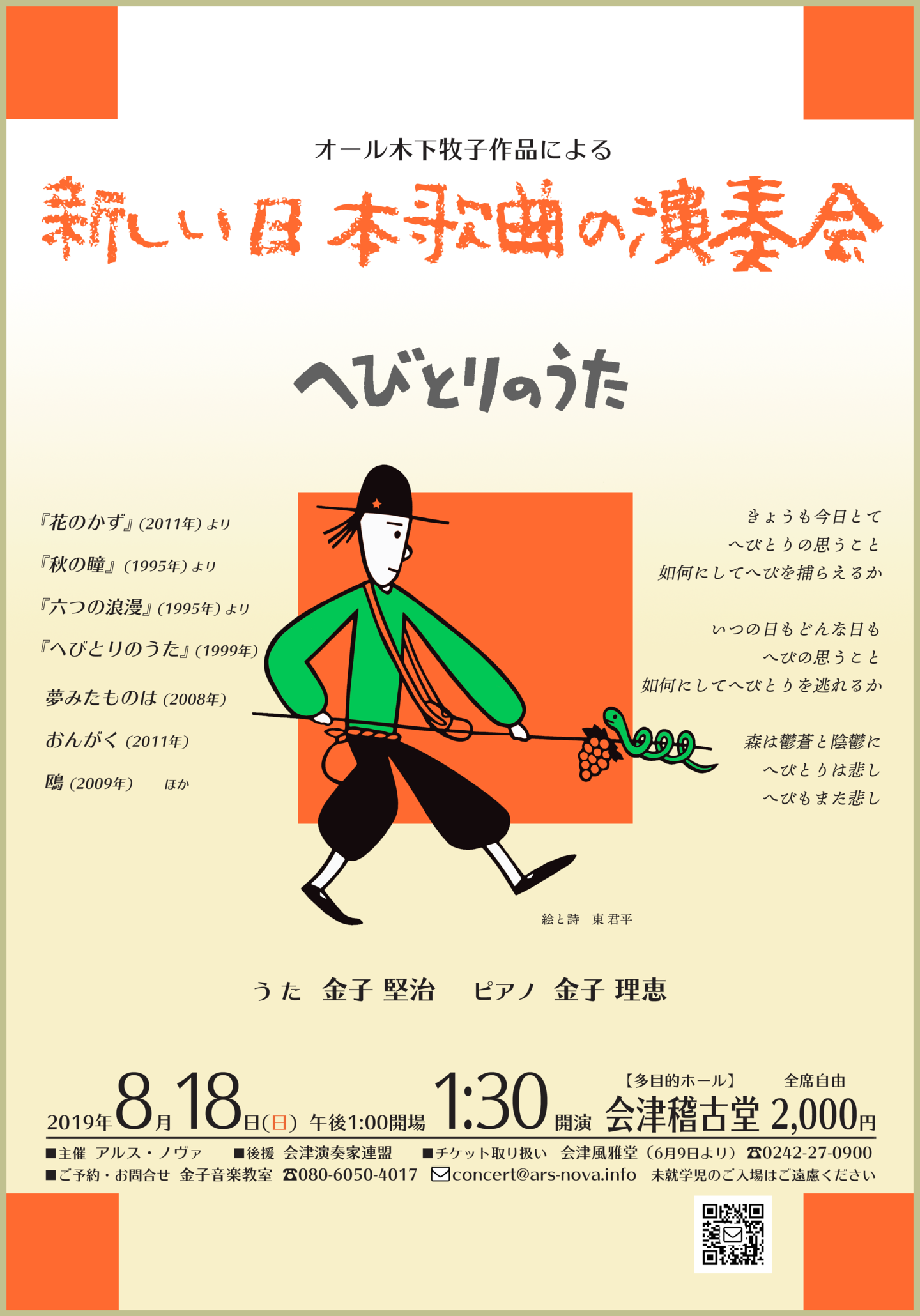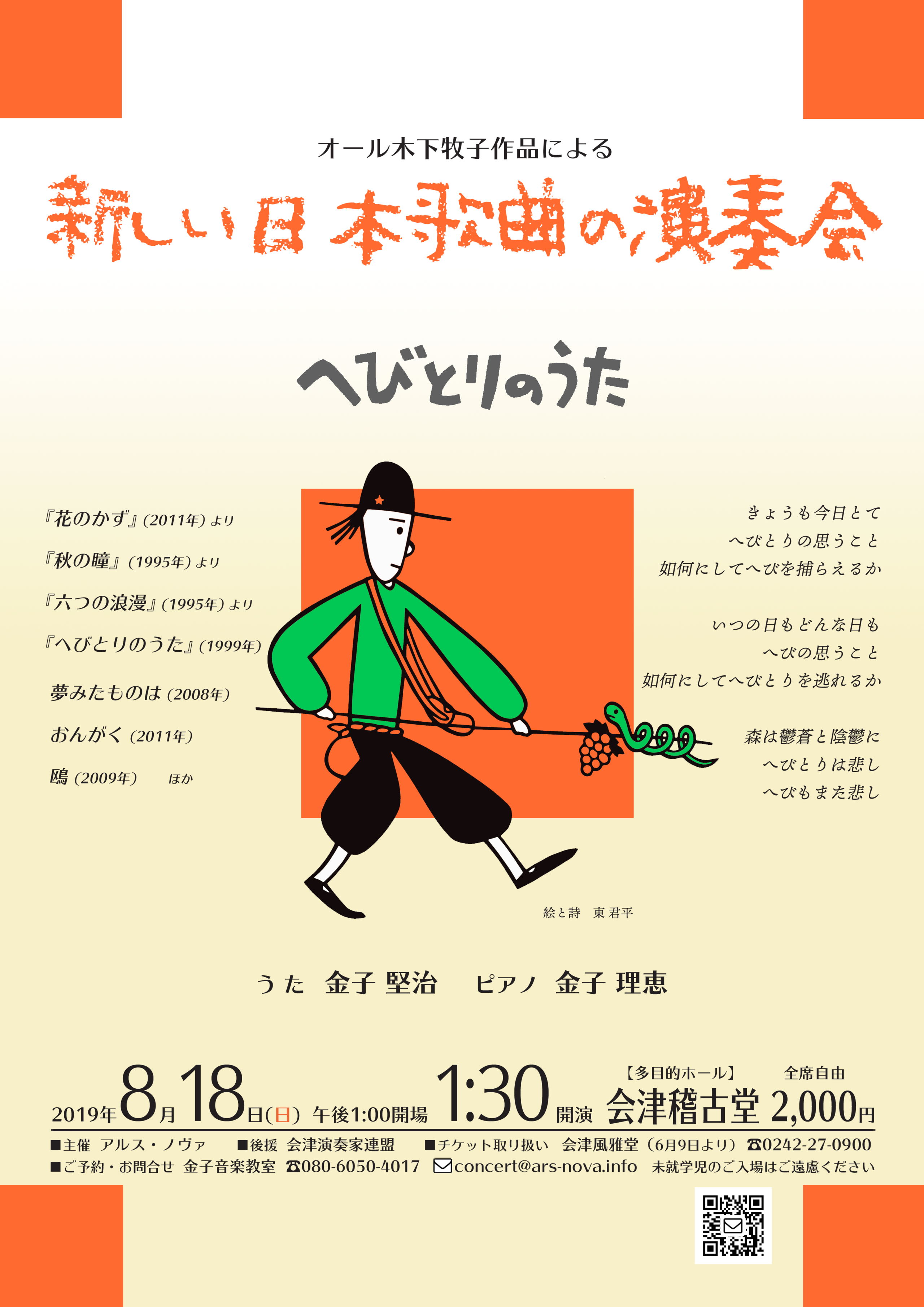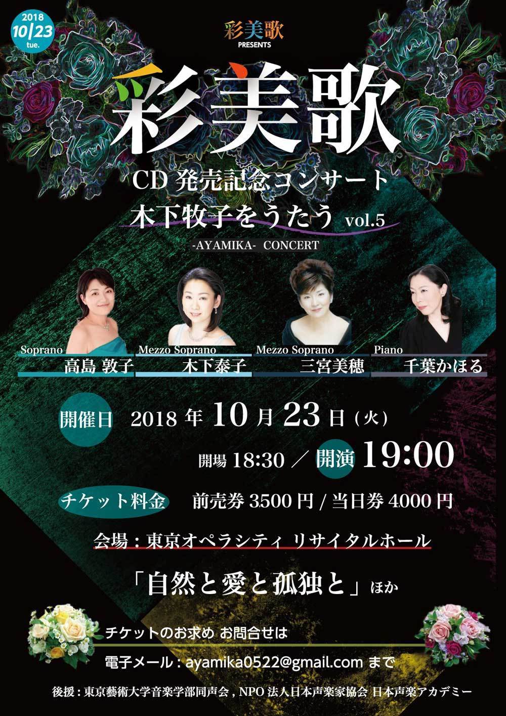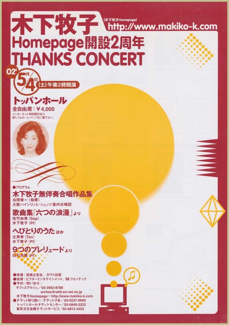 ●曲目 全作曲:木下牧子 「地平線の彼方へ」より/「愛する歌」より/「わたしは風」より/「花のかず」より/「夢みたものは」より/「アカペラ・コーラス・セレクション」より/歌曲:夢みたものは、幼年、風をみたひと/ピアノ連弾「迷宮のピアノ」より/音楽物語「蜘蛛の糸」〜朗読/独唱・クラリネット・ピアノのための