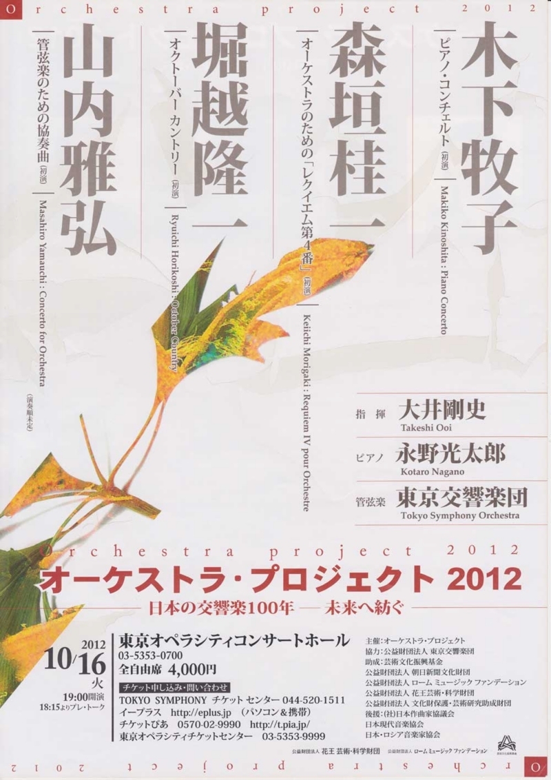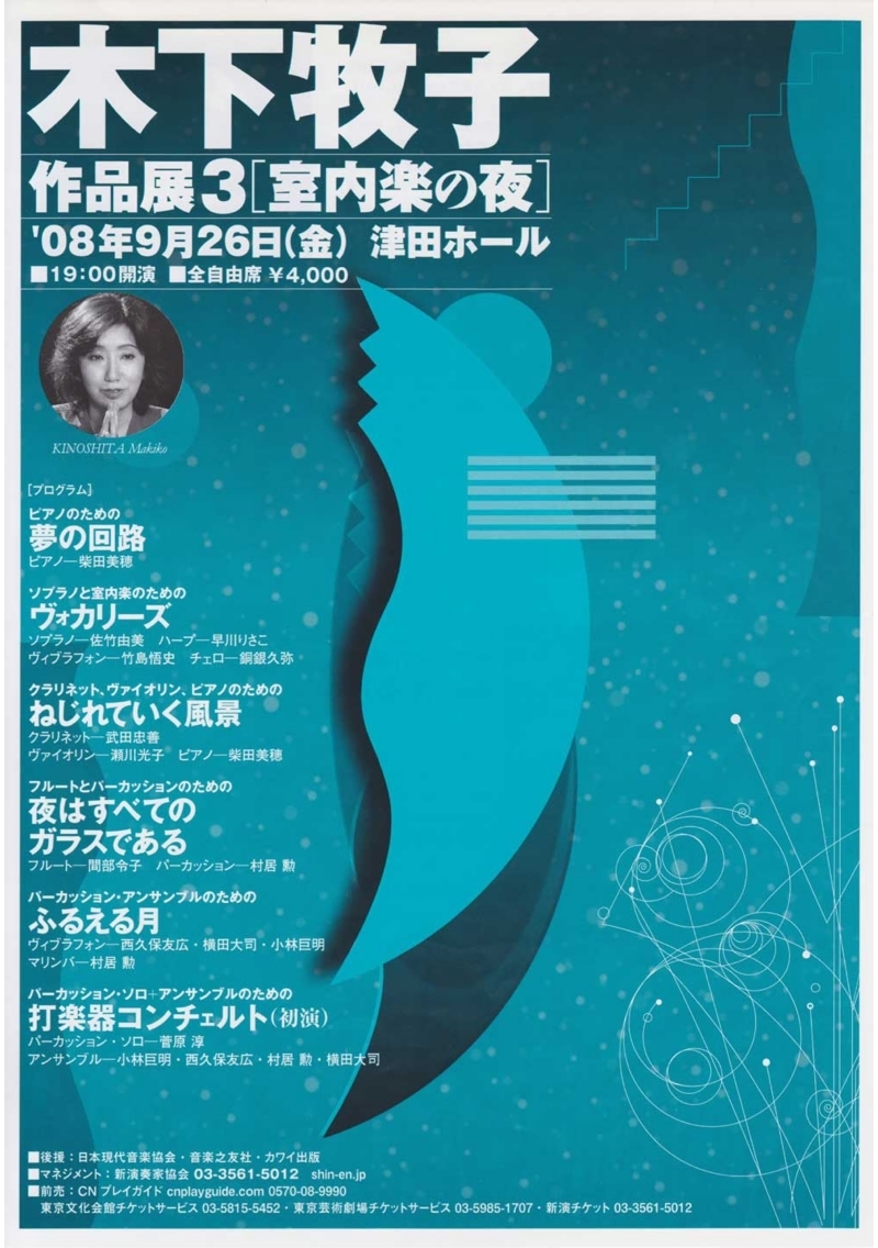 ●曲目 全作曲:木下牧子 ピアノ組曲「夢の回路」/「ヴォカリーズ」〜ソプラノ、ハープ、チェロ&Perc./「ねじれていく風景」Cl.Vn.Pf.のための/「夜はすべてのガラスである」Fl.&Perc./「ふるえる月」パーカッション・アンサンブルのための/「打楽器コンチェルト」Percソロ+アンサンブルのための 初演