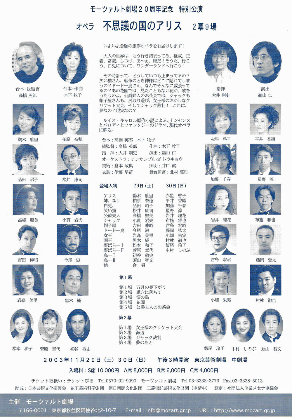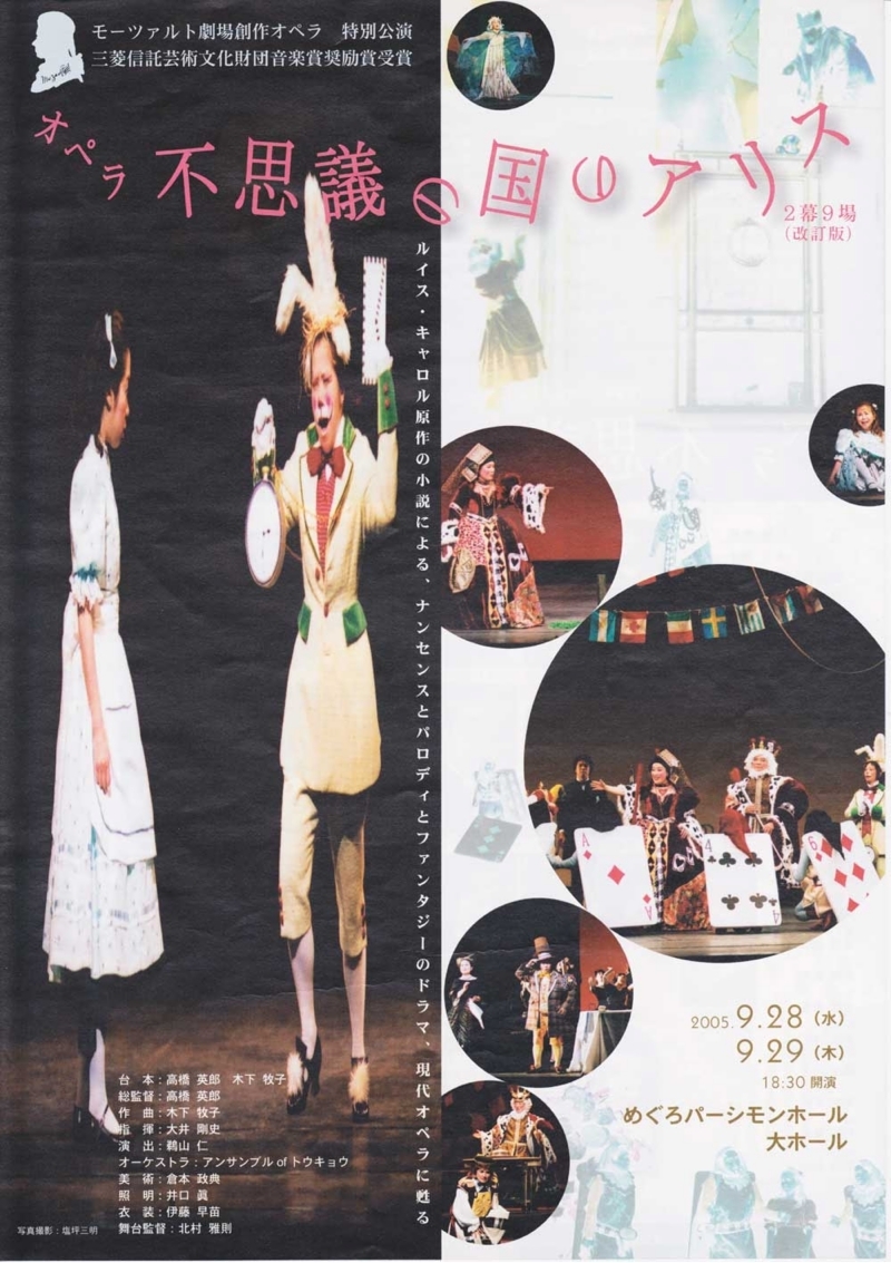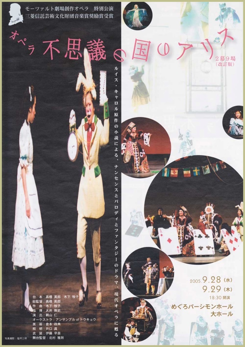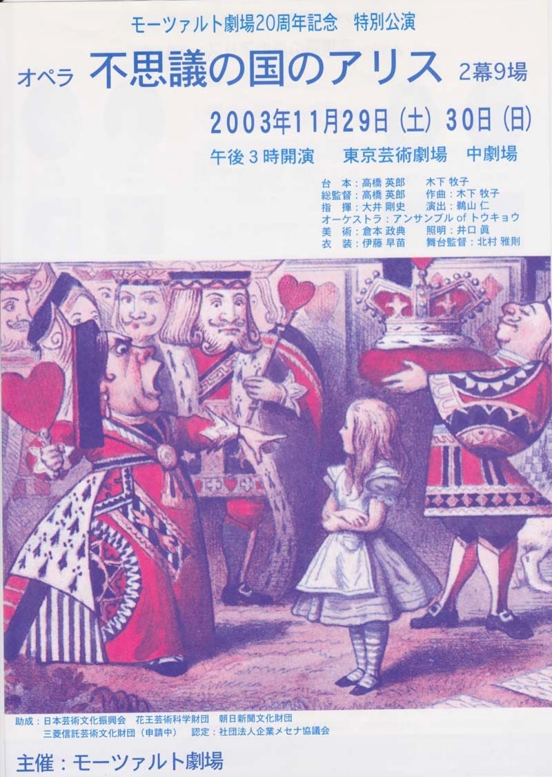 ●キャスト アリス:鵜木絵里・赤星啓子 姉・ユリ:柏原奈穂・平井香織 白うさぎ:品田昭子・加藤千春 笑い猫:松井康司・宮本益光 ドードー鳥:今尾 滋・金沢 平 公爵夫人:高橋照美・菊地美奈 女王:岩森美里(両日) ジャック:小貫岩夫・布施雅也 帽子屋:吉田伸昭・蔵田雅之 王様:黒木 純(両日) けし12:飯尾玲子・菅原章代(両日) 庭師他:初谷敬史・須山智文(両日) モーツァルト劇場合唱団