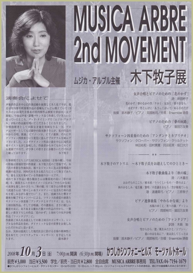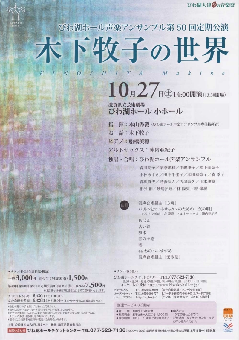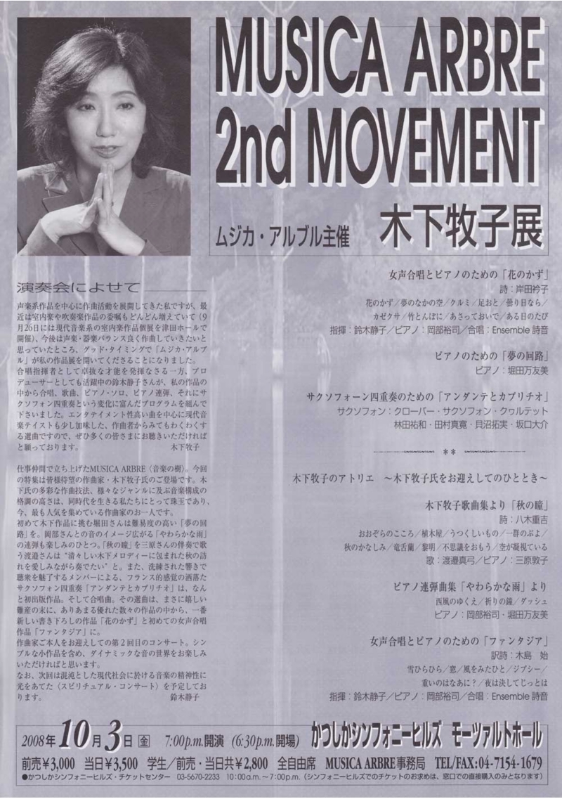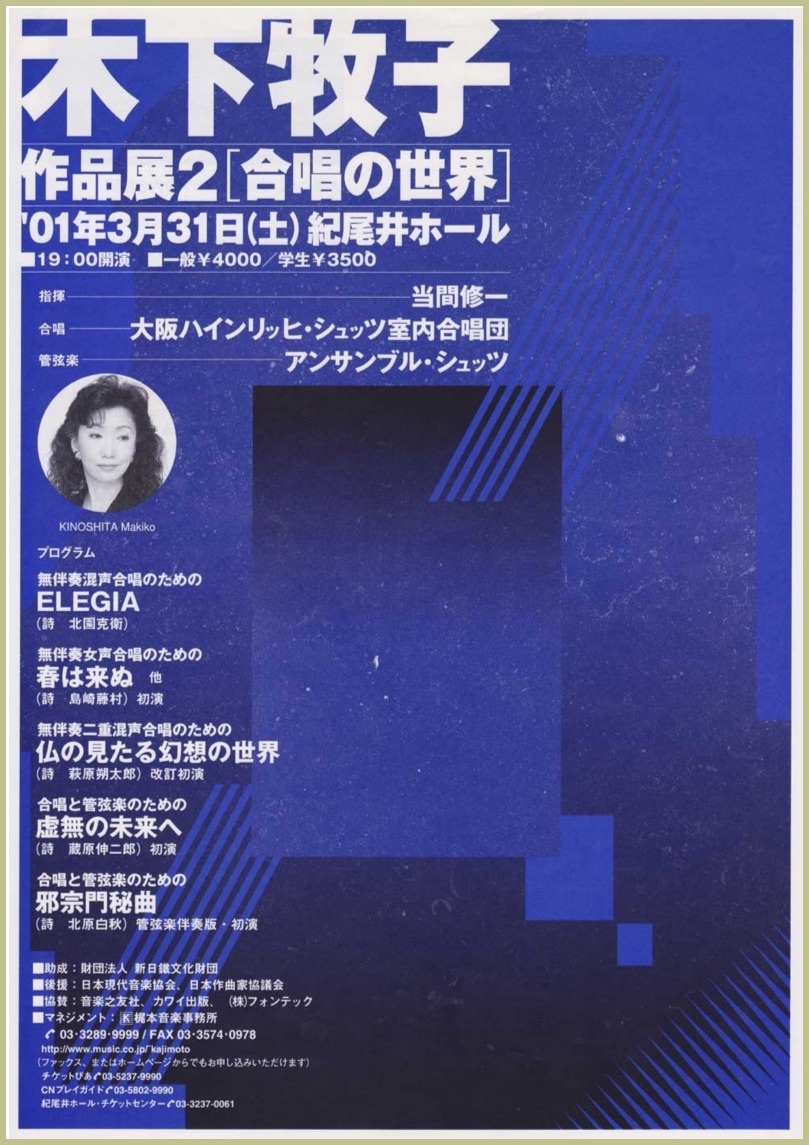 ●曲目 全作曲:木下牧子 [合唱]混声合唱組曲「方舟」より、「花のかず」より、「愛する歌」より、「アカペラ・コーラス・セレクション」より/[歌曲]歌曲集「父の唄」、「涅槃」、「抒情小曲集」より