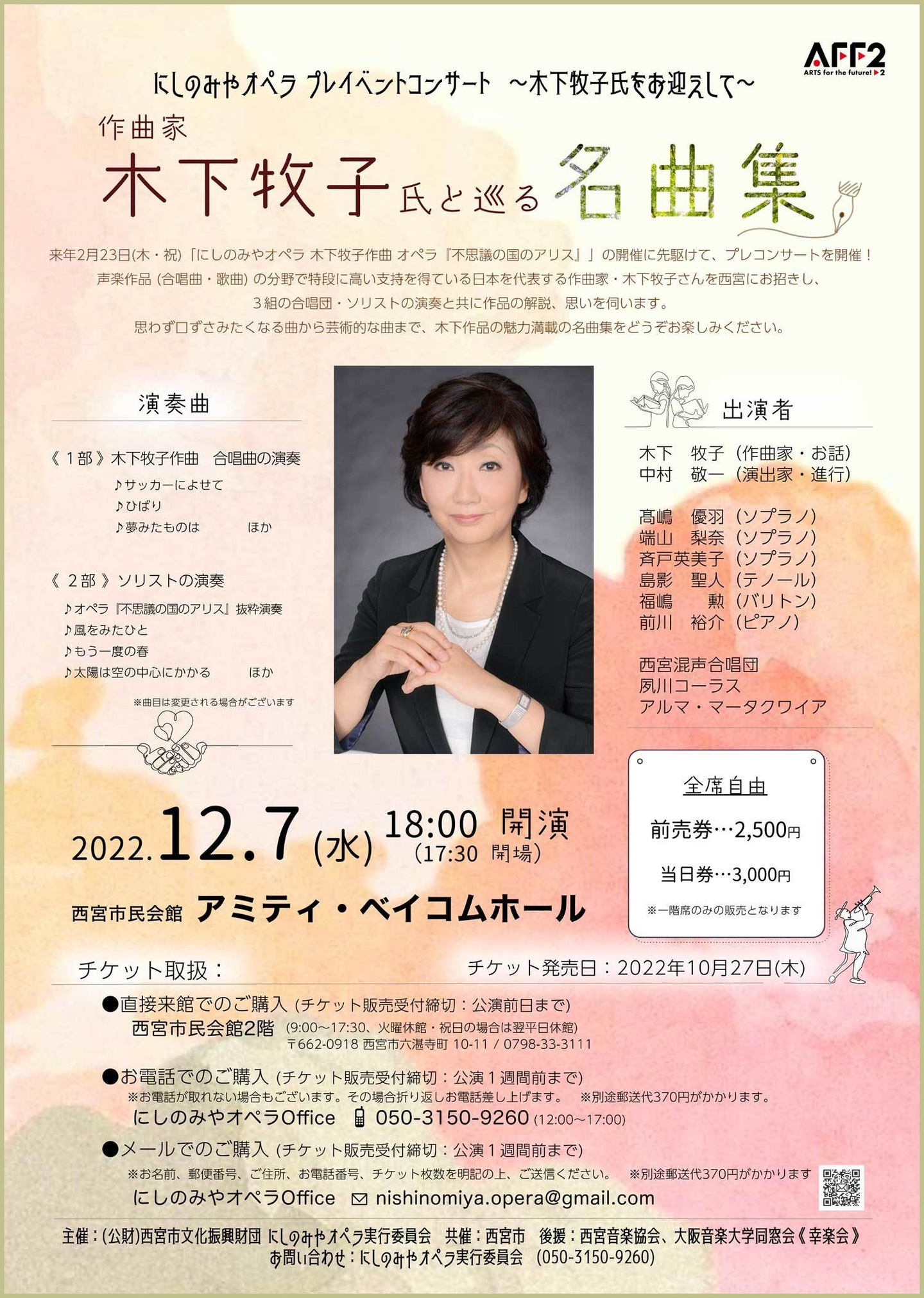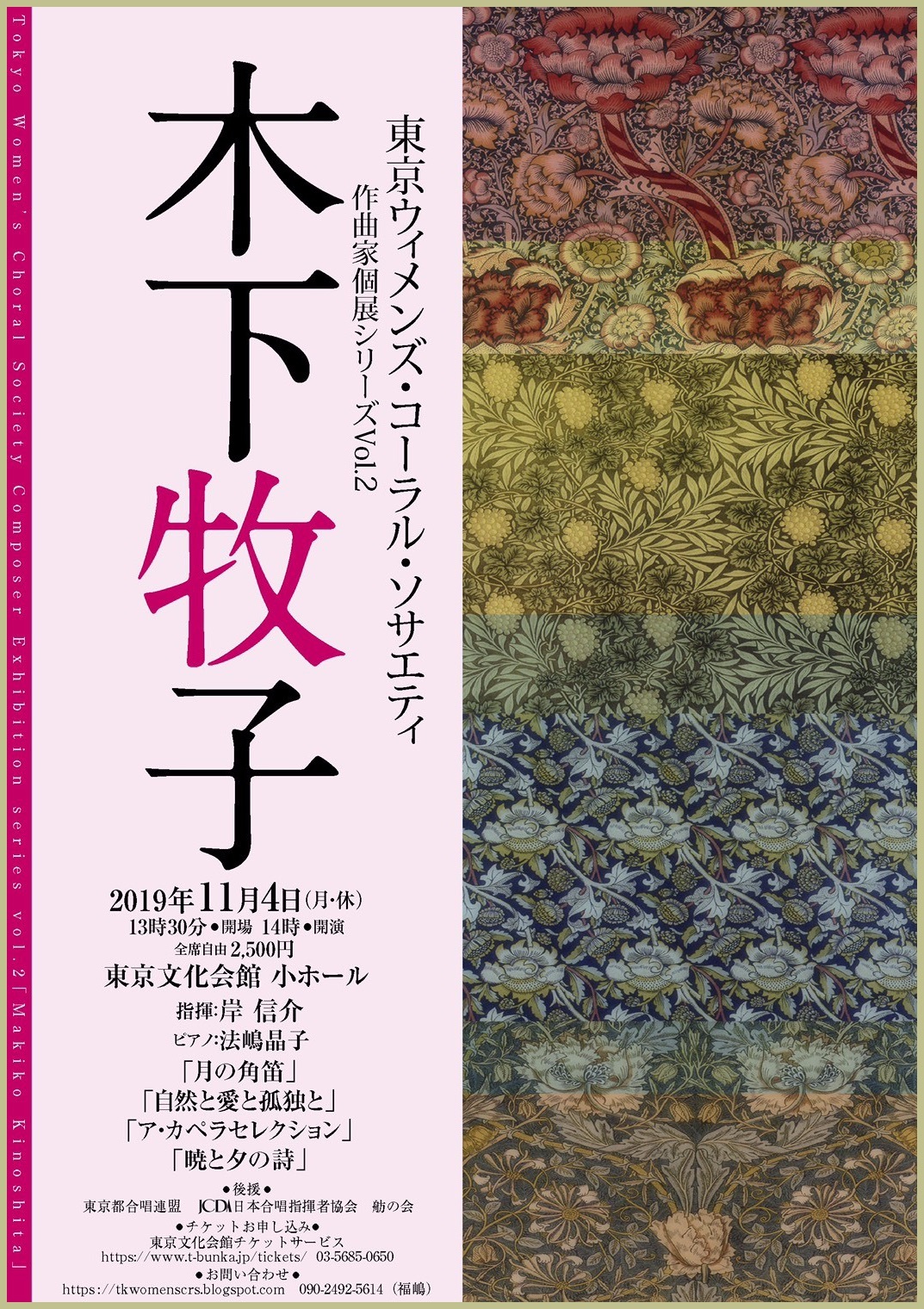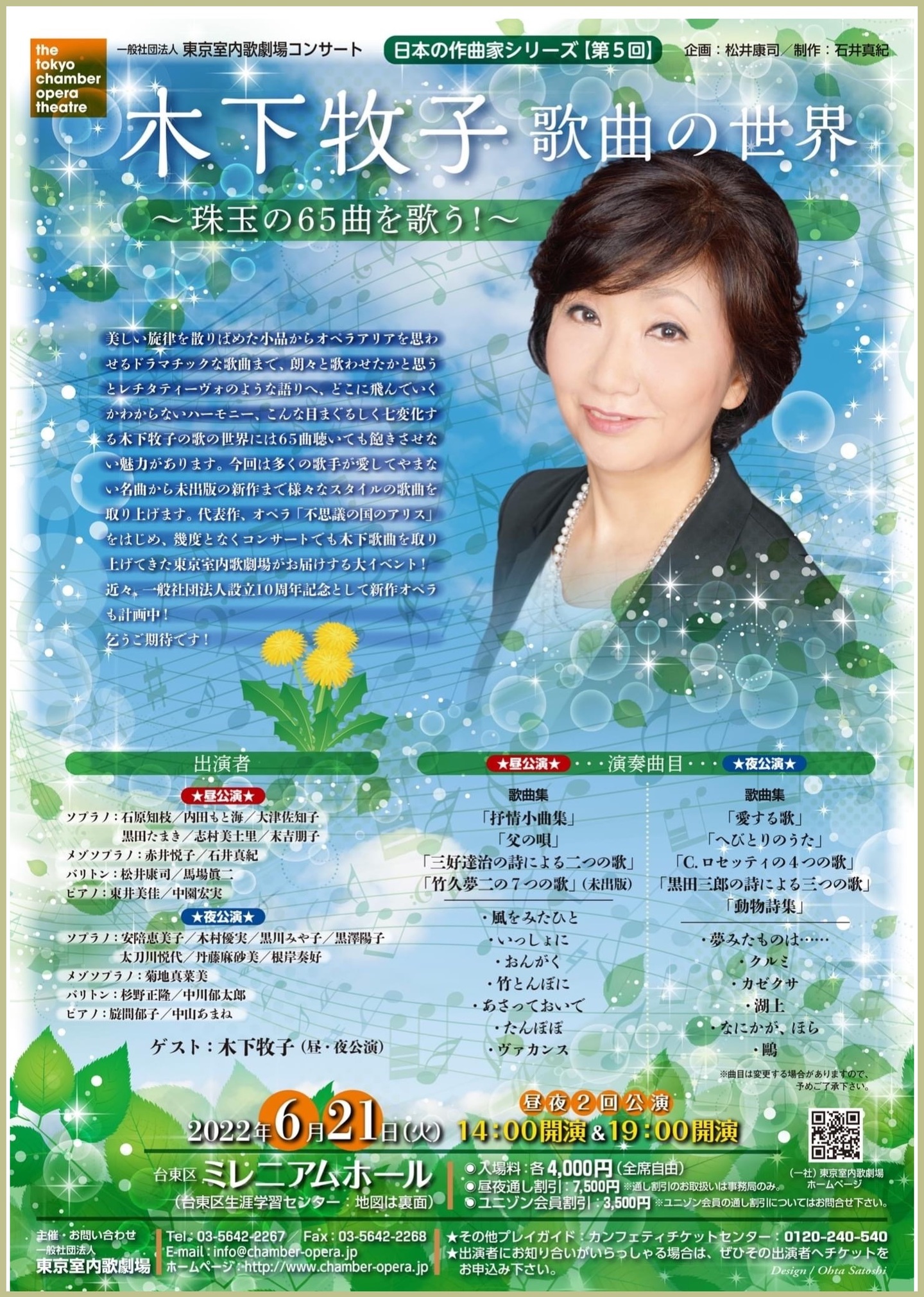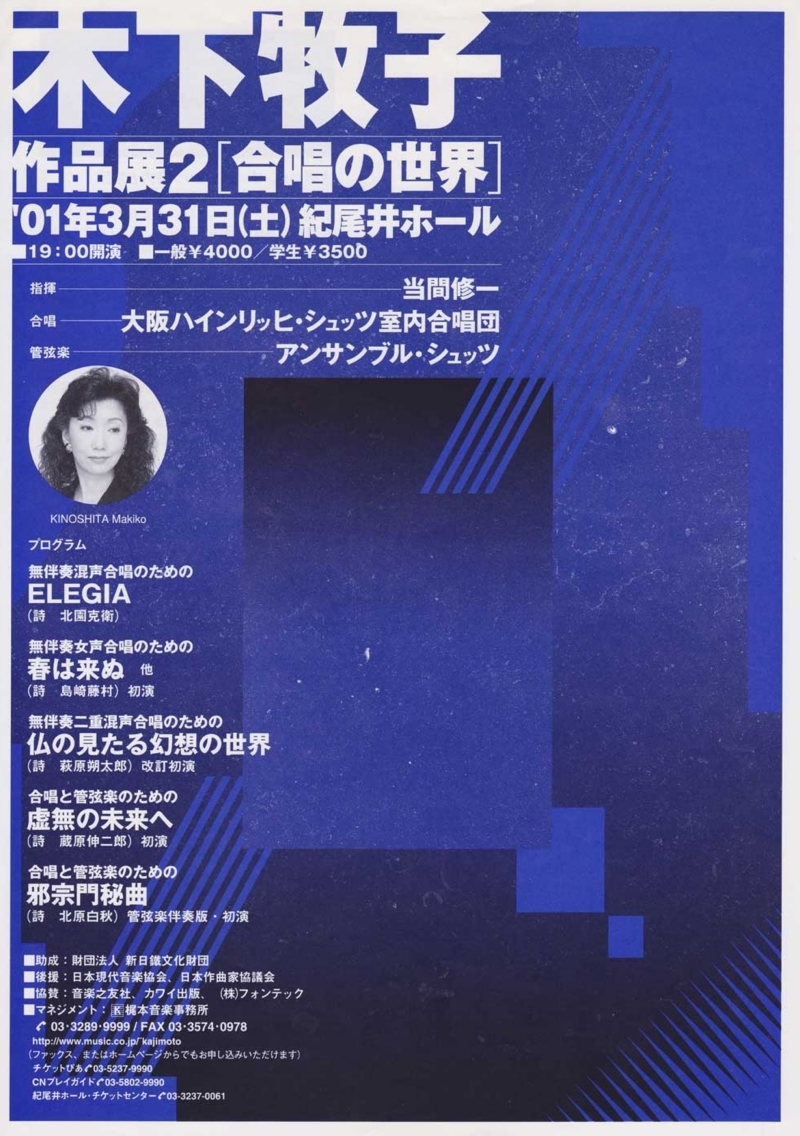 ●曲目 全作曲:木下牧子 [合唱]混声合唱組曲「方舟」より、「花のかず」より、「愛する歌」より、「アカペラ・コーラス・セレクション」より/[歌曲]歌曲集「父の唄」、「涅槃」、「抒情小曲集」より