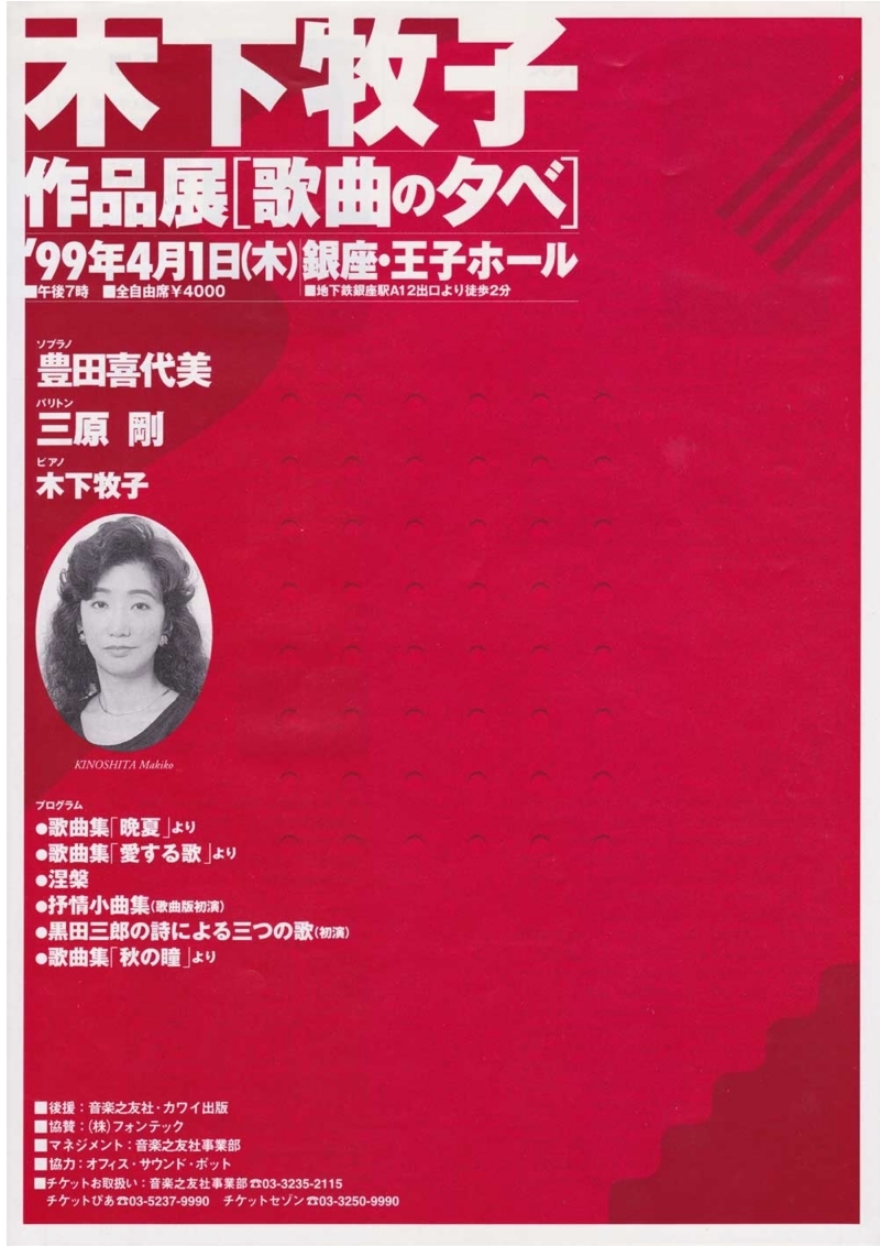 ●曲目 全作曲:木下牧子 「抒情小曲集」より 「愛する歌」より 「晩夏」より 「六つの浪漫」より 「秋の瞳」より 「古風な月」より 「動物詩集」より ゆうぐれ 「花のかず」より しぬまえにおじいさんがいったこと 私が死んでも 「竹久夢二の詩による7つの歌」全曲