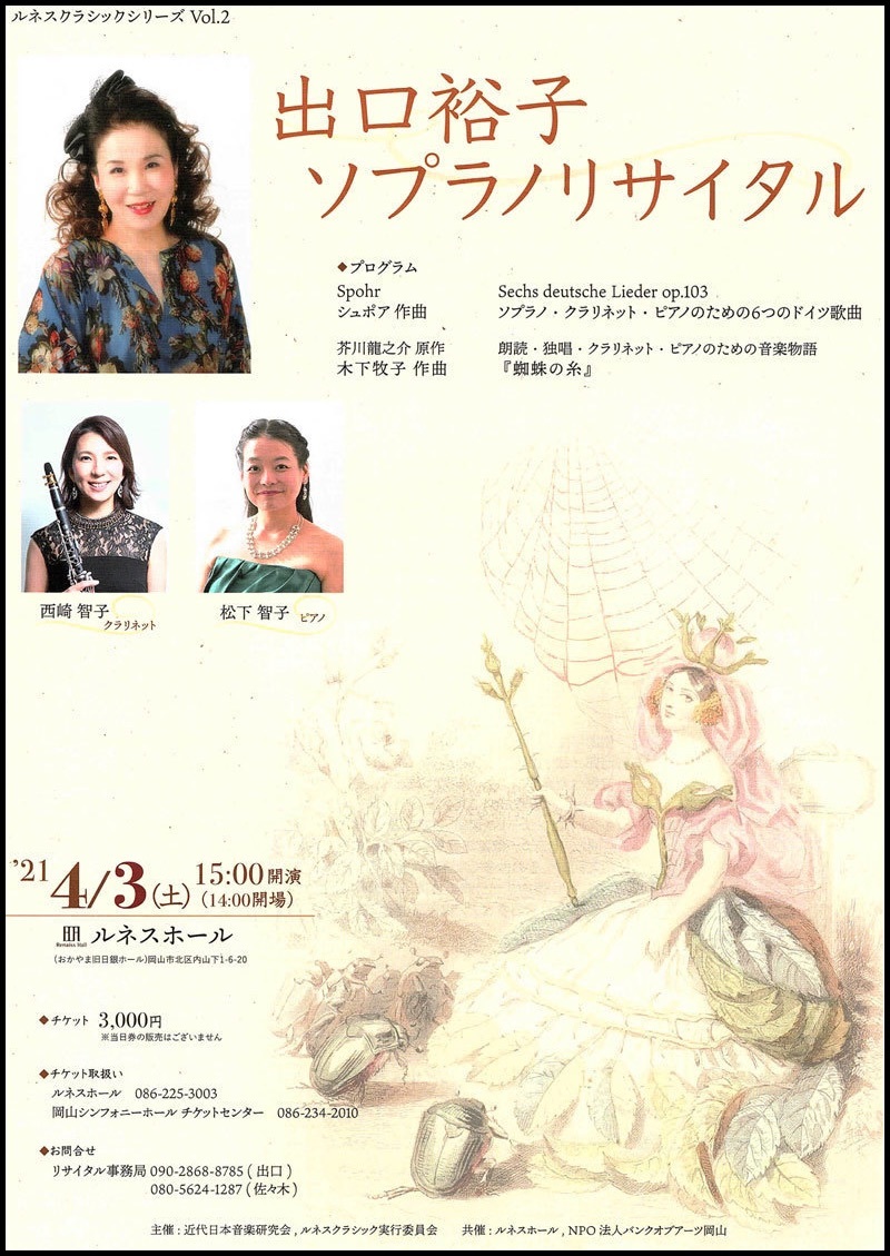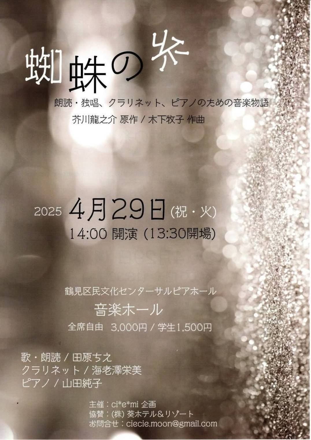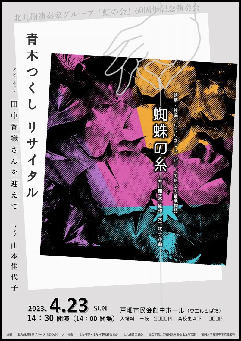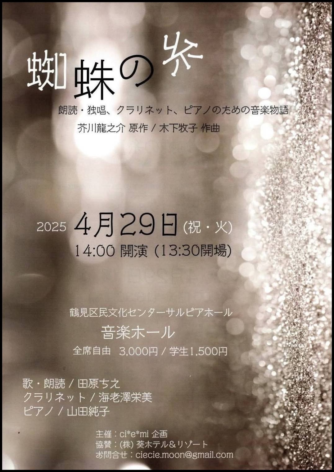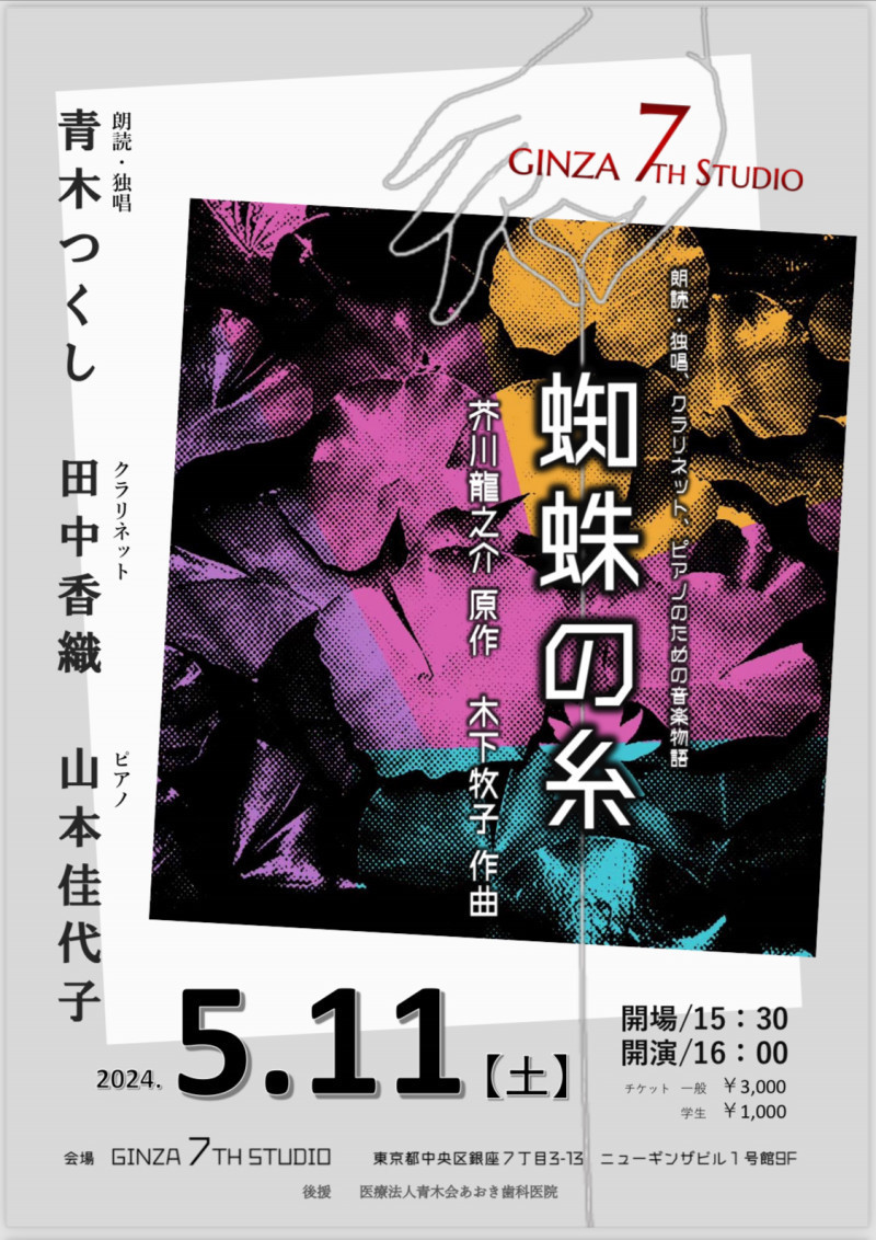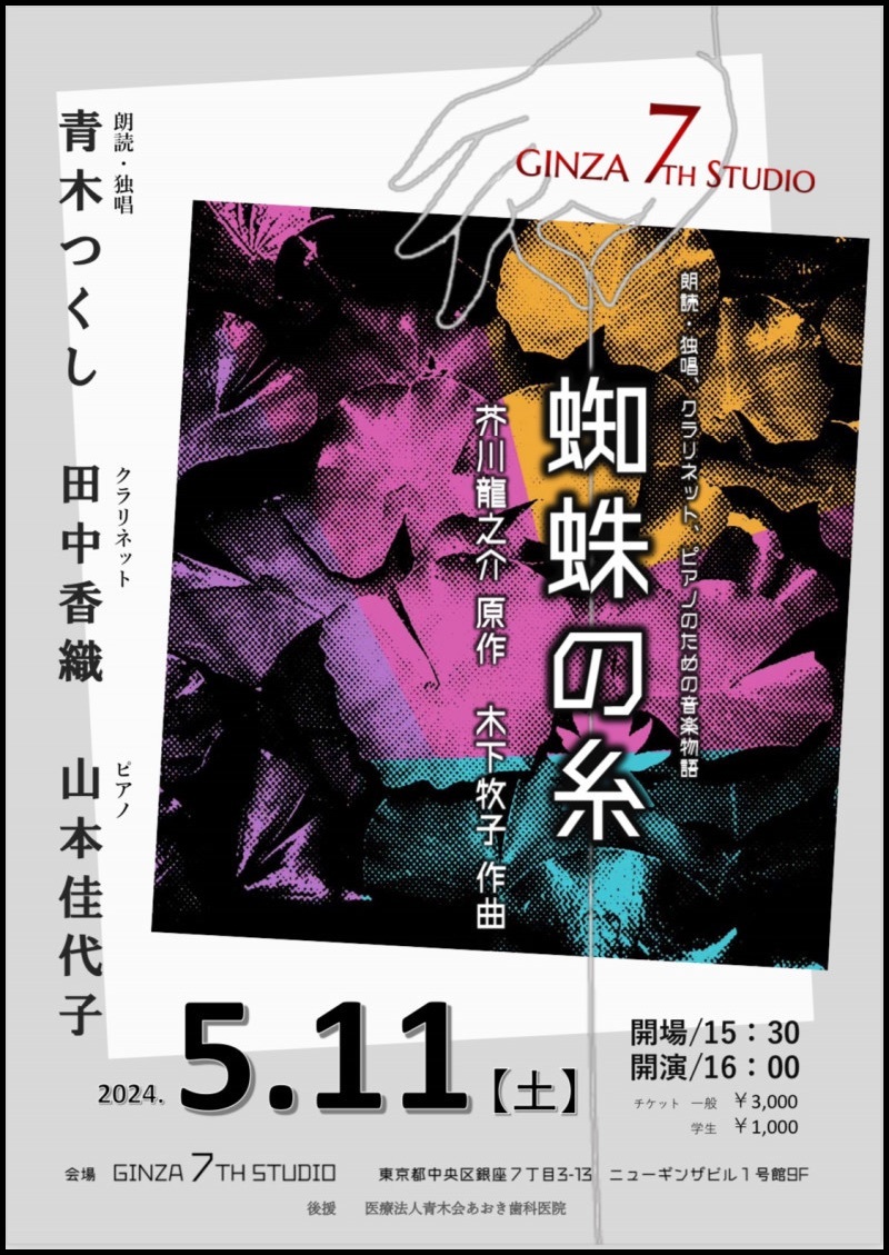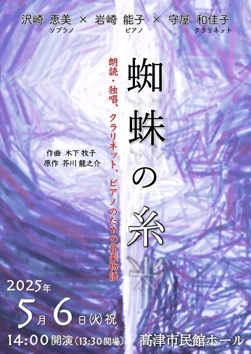 音楽物語「蜘蛛の糸」ちらしコレクション(40) ※画像をクリックすると拡大します。 '25.6/14 (土)朗読.高津 佳 S.藤井ひろみ Cl.遠藤文江 Pf.田中悠一郎金沢市アートホール♦︎ ♦︎ ♦︎ ♦︎ ♦︎ '25.5/6 (火/祝)S/朗読 沢崎恵美 Cl.守屋和佳子 Pf.岩崎能子高津市民館ホール♦︎ ♦︎ ♦︎ ♦︎ ♦︎ '25.4/29 (火/祝)S/朗読 田原ちえCl.海老澤栄美 Pf.田中純子鶴見区民文化センターサルビアH♦︎ ♦︎ ♦︎ ♦︎ ♦︎ '25.4/13(日)朗読.浅井彰子 Ms.田島聖子Cl. 浅田文子 Pf.日下部かおり人形操演.百鬼ゆめひなぎふ清流文化プラザ長良川H♦︎ ♦︎ ♦︎ ♦︎ ♦︎ '25.3/30 (日)朗読.浅井彰子 Ms.田島聖子 Sax.西浦 颯 Pf.日下部かおり人形操演.百鬼ゆめひな阿智村中央公民館ホール♦︎ ♦︎ ♦︎ ♦︎ ♦︎ '25.3/22 (土) S/朗読 大賀千夏子 Cl.東出菜々 Pf.山崎祥代久保惣Eiホール♦︎ ♦︎ ♦︎ ♦︎ ♦︎ '25.3/1 (土)S/朗読 井坂 恵 Cl.西村 薫 Pf.松川 儒美術.出射 茂川西町フレンドリープラザ♦︎ ♦︎ ♦︎ ♦︎ ♦︎ '24.8/30 (土)S/朗読 涂 櫻Vc.三谷野絵 Pf.谷口若菜マリー コンツェルト♦︎ ♦︎ ♦︎ ♦︎ ♦︎ '24.8/4(日) S/朗読 家田紀子Cl. 黒尾文恵 Pf.坂元陽子ムジカーザ♦︎ ♦︎ ♦︎ ♦︎ ♦︎ '24.7/20 (土)S/朗読 和田美菜子Cl. 西村 薫 Pf.高橋ドレミきららホール♦︎ ♦︎ ♦︎ ♦︎ ♦︎ '24.5/11 (土)S/朗読 青木つくしCl.田中香織 Pf.山本佳代子GINZA7TH STUDIO♦︎ ♦︎ ♦︎ ♦︎ ♦︎ '24.3/24(日)S/朗読 松浦(郷津) 恵Cl. 郷津隆幸 Pf.郷津由紀子Perc.郷津幸男山形市民会館小ホール♦︎ ♦︎ ♦︎ ♦︎ ♦︎ '23.4/23 (日)S/朗読 青木つくしCl. 田中香織 Pf.山本佳代子戸畑市民会館中ホール♦︎ ♦︎ ♦︎ ♦︎ ♦︎ '23.4/15 (土)S/朗読 北島佳世Cl. 照沼夢輝 Pf.小林萌里観蔵院 曼荼羅美術館♦︎ ♦︎ ♦︎ ♦︎ ♦︎ '23.1/29 (日)S/朗読 和田美菜子 Cl.西村 薫 Pf.斎藤誠二プラッツ習志野市民ホール♦︎ ♦︎ ♦︎ ♦︎ ♦︎ '22.12/3(土)S/朗読 里中トヨコCl. 黒尾文恵 Pf.坂元陽子御影公会堂白鶴ホール♦︎ ♦︎ ♦︎ ♦︎ ♦︎ '22.11/6 (日)S/朗読 真野綾子 Cl.丸木一巧 Pf.田邉安紀恵Pfカフェ ベヒシュタイン♦︎ ♦︎ ♦︎ ♦︎ ♦︎ '22.8/27 (土)N.花燈明桂 S.友利あつ子Cl.根間安代 Pf.大城伸悟アイム・ユニバースてだこ小♦︎ ♦︎ ♦︎ ♦︎ ♦︎ '22.4/29 (金/祝)S/朗読 里中トヨコCl. 黒尾文恵 Pf.石橋衣里東京オペラシティリサイタルH♦︎ ♦︎ ♦︎ ♦︎ ♦︎ '22.4/16(土)S/朗読 栗原未和Cl.小谷口直子 Pf.二塚裕美京都アスニー♦︎ ♦︎ ♦︎ ♦︎ ♦︎ '22.4/3(日)S/朗読 小山瑠美子Cl. 西村 薫 Pf.斉藤晴海りゅーとぴあ スタジオA♦︎ ♦︎ ♦︎ ♦︎ ♦︎ '22.3/21 (日)S/朗読 大賀千夏子 Cl.東出菜々 Pf.山崎祥代久保惣Eiホール♦︎ ♦︎ ♦︎ ♦︎ ♦︎ '21.12/26 (日)S/朗読 平野則子 Cl.三瓶佳紀 Pf.浅井智子渡辺淳一文学館♦︎ ♦︎ ♦︎ ♦︎ ♦︎ '21.12/12 (日)S/朗読 吉田美紀 Cl.小宮山由佳 Pf.岩元志真潮音寺♦︎ ♦︎ ♦︎ ♦︎ ♦︎ '21.4/3(土)S/朗読 出口裕子 Cl.西崎智子 Pf.松下智子岡山 ルネスホール♦︎ ♦︎ ♦︎ ♦︎ ♦︎ '21.3/7(日)S/朗読 宮地里実 Cl.小嶋慶子 Pf.吉田 純横浜市歴史博物館エントランスH♦︎ ♦︎ ♦︎ ♦︎ ♦︎ '21.2/9(火)S/朗読 久保菊子Cl.藤原猛浩 Pf.田中涼太兵庫県立芸術文化センター小 ♦︎ ♦︎ ♦︎ ♦︎ ♦︎ '20.12/20(日)S/朗読 針生美智子 Cl.河野泰幸 Pf.外山啓介札幌大谷大学記念ホール ♦︎ ♦︎ ♦︎ ♦︎ ♦︎ '20.1/26(日)S/朗読 和田美菜子 Cl.西村 薫 Pf.田村瑞記トーキョーコンサーツ•ラボ ♦︎ ♦︎ ♦︎ ♦︎ ♦︎ '19.10/23(水)S/朗読 里中トヨコ Cl.黒尾文恵 Pf.坂元陽子けやきホール ♦︎ ♦︎ ♦︎ ♦︎ ♦︎ '19.10/20(日)S/朗読 和泉聰子Cl.小林利彰 Pf. 藤岡由記蕨市立文化ホール くるる ♦︎ ♦︎ ♦︎ ♦︎ ♦︎ '19.9/26(木) S/朗読.三輪晴美Cl.本田沙紀 Pf.田中 恵岡崎市シビックコンサートホール ♦︎ ♦︎ ♦︎ ♦︎ ♦︎ '19.8/4(日) S.豐田かおリ 朗読.大場由香Cl.岡林和歌 Pf.岩永圭司HITOMIホール♦︎ ♦︎ ♦︎ ♦︎ ♦︎ '18.11/23(金) 主催:日本甲状腺学会S/朗読 加藤千春Cl.齋藤 Pf.榊原紀保子ウェスタ川越小ホール ♦︎ ♦︎ ♦︎ ♦︎ ♦︎ '18.8/25(土)S/朗読 松下悦子 Cl.小谷口直子 Pf.土居知子京都府民ホール•アルティ♦︎ ♦︎ ♦︎ ♦︎ ♦︎ '17.9/2(土)9/5(火)S/朗読 針生美智子Cl.人見 剛 Pf.平野裕樹子千葉市男女共同参画C東京建物 八重洲ホール♦︎ ♦︎ ♦︎ ♦︎ ♦︎ '16. 11/5 (土)主催:栄区文化協会S/朗読 浅野美帆子Cl.松本安津美 Pf.田中初芽栄区民文化センターリリス ♦︎ ♦︎ ♦︎ ♦︎ ♦︎ '16.4/17(日)主催:オフィス・マキナS/朗読 駒井ゆり子 Cl.草刈民代 Pf.榊原紀保子サントリーH ブルーローズ♦︎ ♦︎ ♦︎ ♦︎ ♦︎ '13.11/2(土)S/朗読 森 朋子 Cl.薗田可奈子 Pf.黒田聡子 やなか音楽ホール ♦︎ ♦︎ ♦︎ ♦︎ ♦︎ '12.6/30(土)委嘱初演 Deux LilasS/朗読 加藤千春 Cl.伊藤圭 Pf.榊原紀保子けやきホール ♦︎ ♦︎ ♦︎ ♦︎ ♦︎ ページトップへ