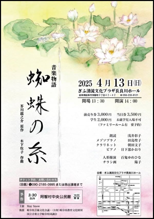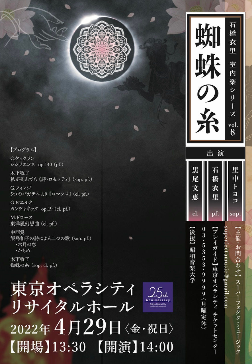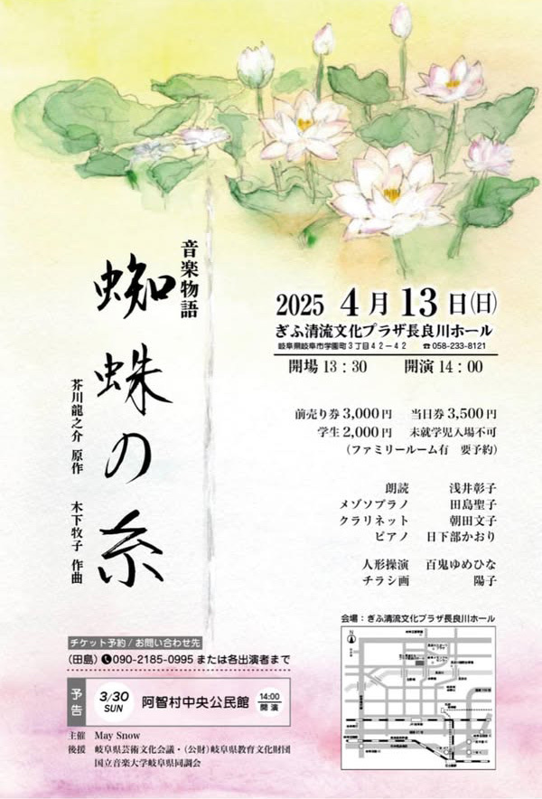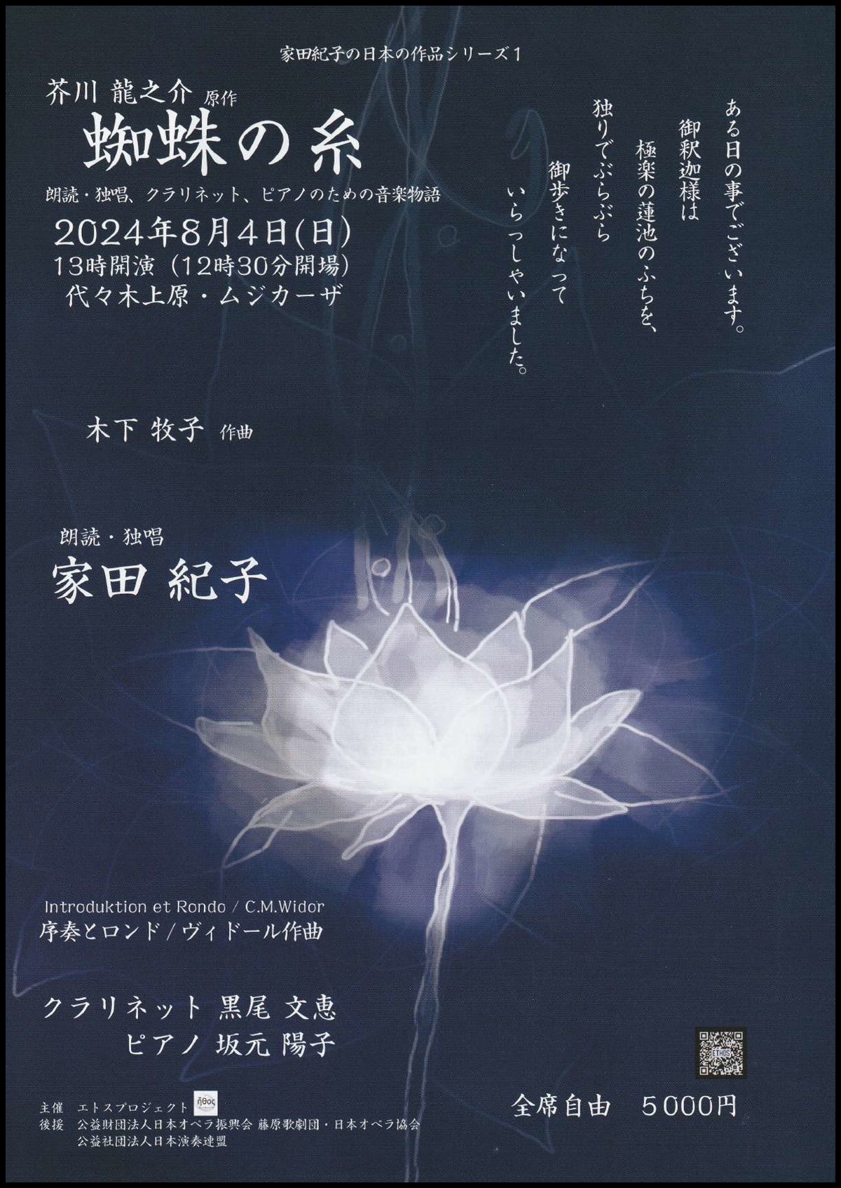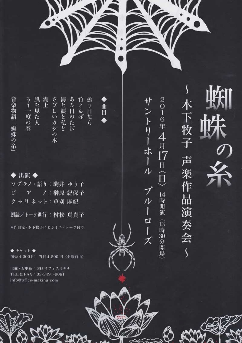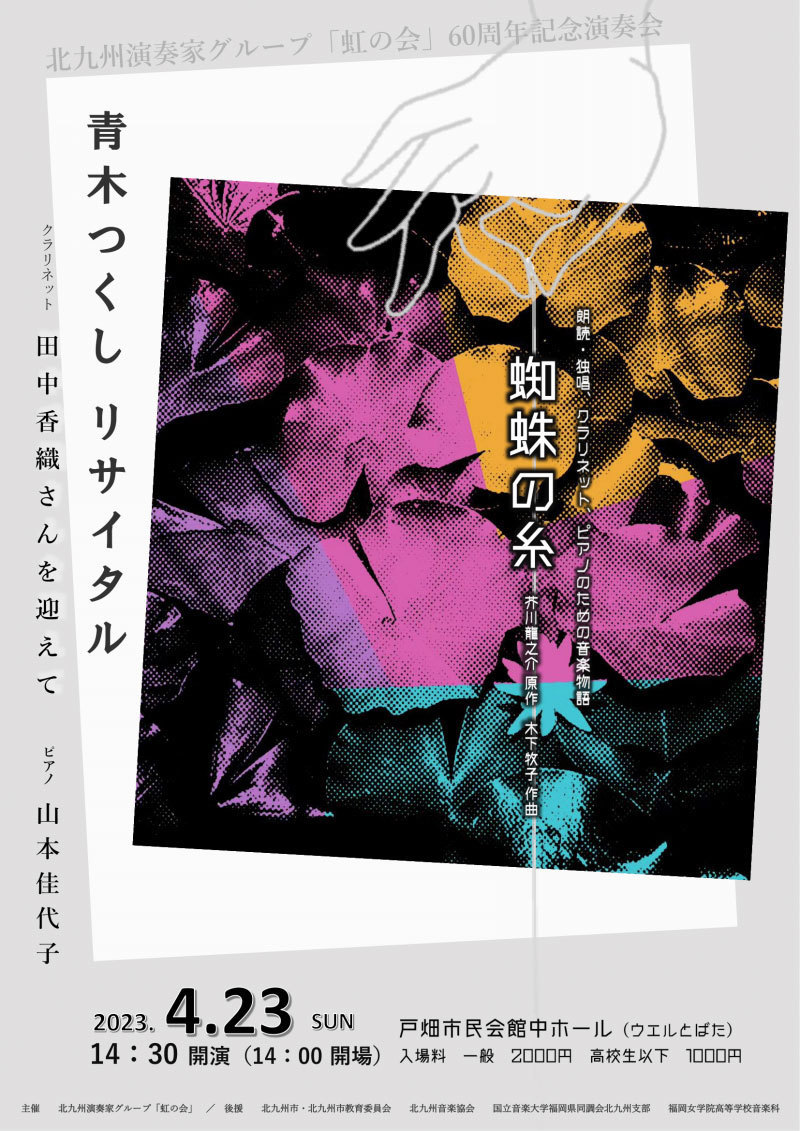 音楽物語「蜘蛛の糸」ちらしコレクション(40) ※画像をクリックすると拡大します。 '25.6/14 (土)朗読.高津 佳 S.藤井ひろみ Cl.遠藤文江 Pf.田中悠一郎金沢市アートホール♦︎ ♦︎ ♦︎ ♦︎ ♦︎ '25.5/6 (火/祝)S/朗読 沢崎恵美 Cl.守屋和佳子 Pf.岩崎能子高津市民館ホール♦︎ ♦︎ ♦︎ ♦︎ ♦︎ '25.4/29 (火/祝)S/朗読 田原ちえCl.海老澤栄美 Pf.田中純子鶴見区民文化センターサルビアH♦︎ ♦︎ ♦︎ ♦︎ ♦︎ '25.4/13(日)朗読.浅井彰子 Ms.田島聖子Cl. 浅田文子 Pf.日下部かおり人形操演.百鬼ゆめひなぎふ清流文化プラザ長良川H♦︎ ♦︎ ♦︎ ♦︎ ♦︎ '25.3/30 (日)朗読.浅井彰子 Ms.田島聖子 Sax.西浦 颯 Pf.日下部かおり人形操演.百鬼ゆめひな阿智村中央公民館ホール♦︎ ♦︎ ♦︎ ♦︎ ♦︎ '25.3/22 (土) S/朗読 大賀千夏子 Cl.東出菜々 Pf.山崎祥代久保惣Eiホール♦︎ ♦︎ ♦︎ ♦︎ ♦︎ '25.3/1 (土)S/朗読 井坂 恵 Cl.西村 薫 Pf.松川 儒美術.出射 茂川西町フレンドリープラザ♦︎ ♦︎ ♦︎ ♦︎ ♦︎ '24.8/30 (土)S/朗読 涂 櫻Vc.三谷野絵 Pf.谷口若菜マリー コンツェルト♦︎ ♦︎ ♦︎ ♦︎ ♦︎ '24.8/4(日) S/朗読 家田紀子Cl. 黒尾文恵 Pf.坂元陽子ムジカーザ♦︎ ♦︎ ♦︎ ♦︎ ♦︎ '24.7/20 (土)S/朗読 和田美菜子Cl. 西村 薫 Pf.高橋ドレミきららホール♦︎ ♦︎ ♦︎ ♦︎ ♦︎ '24.5/11 (土)S/朗読 青木つくしCl.田中香織 Pf.山本佳代子GINZA7TH STUDIO♦︎ ♦︎ ♦︎ ♦︎ ♦︎ '24.3/24(日)S/朗読 松浦(郷津) 恵Cl. 郷津隆幸 Pf.郷津由紀子Perc.郷津幸男山形市民会館小ホール♦︎ ♦︎ ♦︎ ♦︎ ♦︎ '23.4/23 (日)S/朗読 青木つくしCl. 田中香織 Pf.山本佳代子戸畑市民会館中ホール♦︎ ♦︎ ♦︎ ♦︎ ♦︎ '23.4/15 (土)S/朗読 北島佳世Cl. 照沼夢輝 Pf.小林萌里観蔵院 曼荼羅美術館♦︎ ♦︎ ♦︎ ♦︎ ♦︎ '23.1/29 (日)S/朗読 和田美菜子 Cl.西村 薫 Pf.斎藤誠二プラッツ習志野市民ホール♦︎ ♦︎ ♦︎ ♦︎ ♦︎ '22.12/3(土)S/朗読 里中トヨコCl. 黒尾文恵 Pf.坂元陽子御影公会堂白鶴ホール♦︎ ♦︎ ♦︎ ♦︎ ♦︎ '22.11/6 (日)S/朗読 真野綾子 Cl.丸木一巧 Pf.田邉安紀恵Pfカフェ ベヒシュタイン♦︎ ♦︎ ♦︎ ♦︎ ♦︎ '22.8/27 (土)N.花燈明桂 S.友利あつ子Cl.根間安代 Pf.大城伸悟アイム・ユニバースてだこ小♦︎ ♦︎ ♦︎ ♦︎ ♦︎ '22.4/29 (金/祝)S/朗読 里中トヨコCl. 黒尾文恵 Pf.石橋衣里東京オペラシティリサイタルH♦︎ ♦︎ ♦︎ ♦︎ ♦︎ '22.4/16(土)S/朗読 栗原未和Cl.小谷口直子 Pf.二塚裕美京都アスニー♦︎ ♦︎ ♦︎ ♦︎ ♦︎ '22.4/3(日)S/朗読 小山瑠美子Cl. 西村 薫 Pf.斉藤晴海りゅーとぴあ スタジオA♦︎ ♦︎ ♦︎ ♦︎ ♦︎ '22.3/21 (日)S/朗読 大賀千夏子 Cl.東出菜々 Pf.山崎祥代久保惣Eiホール♦︎ ♦︎ ♦︎ ♦︎ ♦︎ '21.12/26 (日)S/朗読 平野則子 Cl.三瓶佳紀 Pf.浅井智子渡辺淳一文学館♦︎ ♦︎ ♦︎ ♦︎ ♦︎ '21.12/12 (日)S/朗読 吉田美紀 Cl.小宮山由佳 Pf.岩元志真潮音寺♦︎ ♦︎ ♦︎ ♦︎ ♦︎ '21.4/3(土)S/朗読 出口裕子 Cl.西崎智子 Pf.松下智子岡山 ルネスホール♦︎ ♦︎ ♦︎ ♦︎ ♦︎ '21.3/7(日)S/朗読 宮地里実 Cl.小嶋慶子 Pf.吉田 純横浜市歴史博物館エントランスH♦︎ ♦︎ ♦︎ ♦︎ ♦︎ '21.2/9(火)S/朗読 久保菊子Cl.藤原猛浩 Pf.田中涼太兵庫県立芸術文化センター小 ♦︎ ♦︎ ♦︎ ♦︎ ♦︎ '20.12/20(日)S/朗読 針生美智子 Cl.河野泰幸 Pf.外山啓介札幌大谷大学記念ホール ♦︎ ♦︎ ♦︎ ♦︎ ♦︎ '20.1/26(日)S/朗読 和田美菜子 Cl.西村 薫 Pf.田村瑞記トーキョーコンサーツ•ラボ ♦︎ ♦︎ ♦︎ ♦︎ ♦︎ '19.10/23(水)S/朗読 里中トヨコ Cl.黒尾文恵 Pf.坂元陽子けやきホール ♦︎ ♦︎ ♦︎ ♦︎ ♦︎ '19.10/20(日)S/朗読 和泉聰子Cl.小林利彰 Pf. 藤岡由記蕨市立文化ホール くるる ♦︎ ♦︎ ♦︎ ♦︎ ♦︎ '19.9/26(木) S/朗読.三輪晴美Cl.本田沙紀 Pf.田中 恵岡崎市シビックコンサートホール ♦︎ ♦︎ ♦︎ ♦︎ ♦︎ '19.8/4(日) S.豐田かおリ 朗読.大場由香Cl.岡林和歌 Pf.岩永圭司HITOMIホール♦︎ ♦︎ ♦︎ ♦︎ ♦︎ '18.11/23(金) 主催:日本甲状腺学会S/朗読 加藤千春Cl.齋藤 Pf.榊原紀保子ウェスタ川越小ホール ♦︎ ♦︎ ♦︎ ♦︎ ♦︎ '18.8/25(土)S/朗読 松下悦子 Cl.小谷口直子 Pf.土居知子京都府民ホール•アルティ♦︎ ♦︎ ♦︎ ♦︎ ♦︎ '17.9/2(土)9/5(火)S/朗読 針生美智子Cl.人見 剛 Pf.平野裕樹子千葉市男女共同参画C東京建物 八重洲ホール♦︎ ♦︎ ♦︎ ♦︎ ♦︎ '16. 11/5 (土)主催:栄区文化協会S/朗読 浅野美帆子Cl.松本安津美 Pf.田中初芽栄区民文化センターリリス ♦︎ ♦︎ ♦︎ ♦︎ ♦︎ '16.4/17(日)主催:オフィス・マキナS/朗読 駒井ゆり子 Cl.草刈民代 Pf.榊原紀保子サントリーH ブルーローズ♦︎ ♦︎ ♦︎ ♦︎ ♦︎ '13.11/2(土)S/朗読 森 朋子 Cl.薗田可奈子 Pf.黒田聡子 やなか音楽ホール ♦︎ ♦︎ ♦︎ ♦︎ ♦︎ '12.6/30(土)委嘱初演 Deux LilasS/朗読 加藤千春 Cl.伊藤圭 Pf.榊原紀保子けやきホール ♦︎ ♦︎ ♦︎ ♦︎ ♦︎ ページトップへ