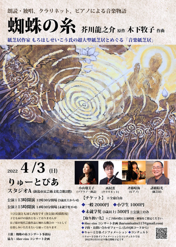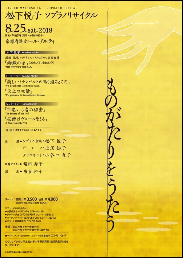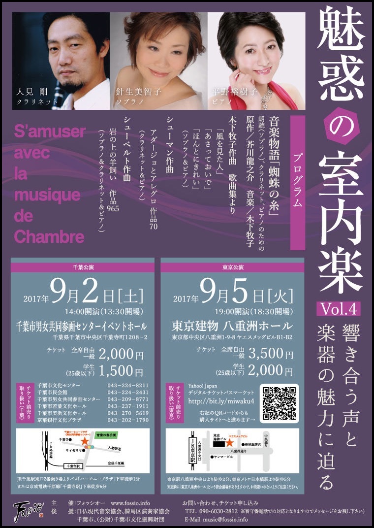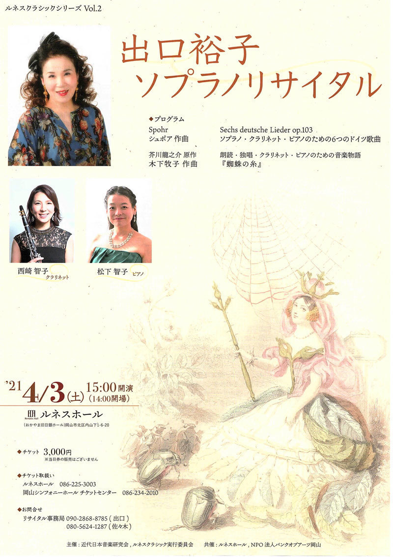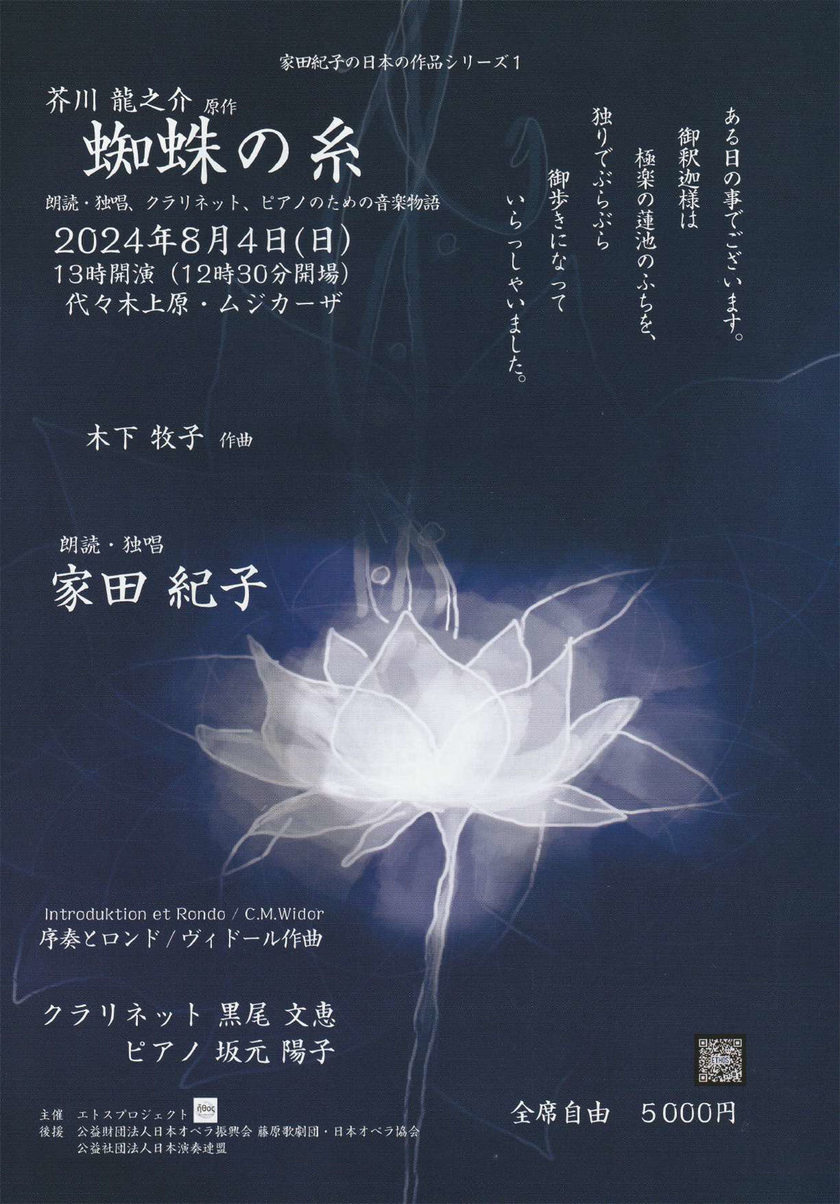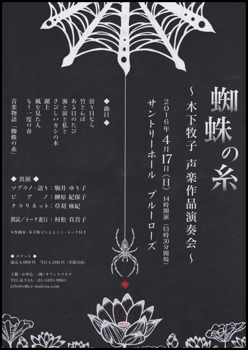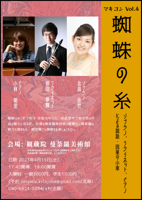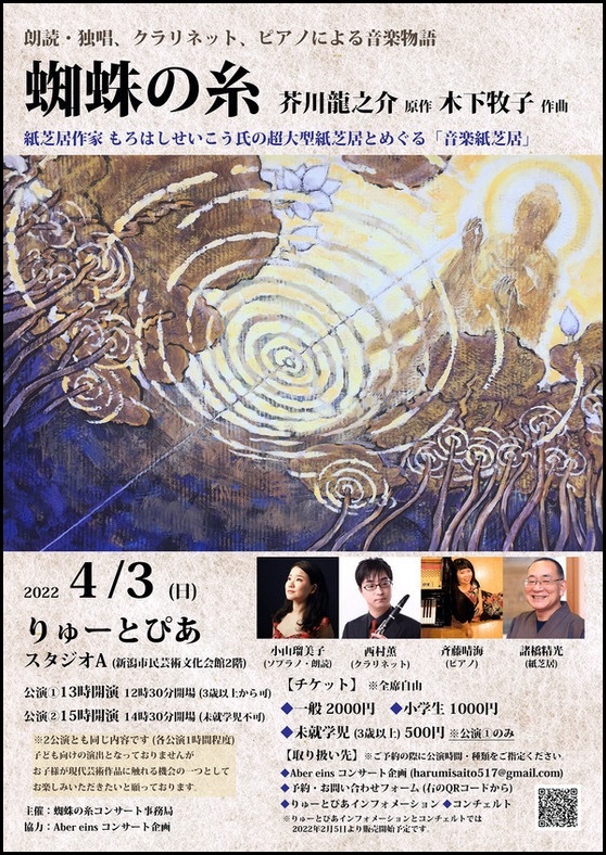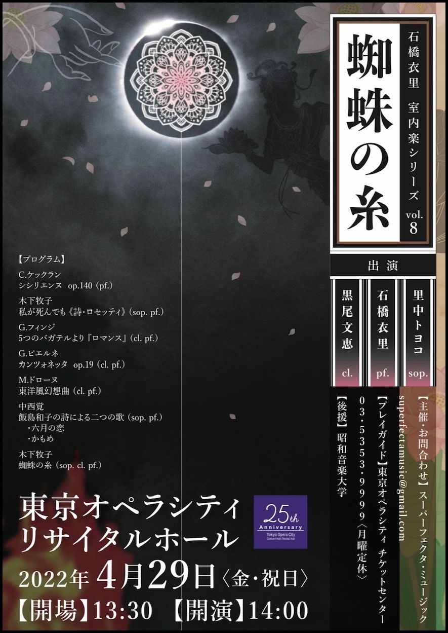 音楽物語「蜘蛛の糸」ちらしコレクション(40) ※画像をクリックすると拡大します。 '25.6/14 (土)朗読.高津 佳 S.藤井ひろみ Cl.遠藤文江 Pf.田中悠一郎金沢市アートホール♦︎ ♦︎ ♦︎ ♦︎ ♦︎ '25.5/6 (火/祝)S/朗読 沢崎恵美 Cl.守屋和佳子 Pf.岩崎能子高津市民館ホール♦︎ ♦︎ ♦︎ ♦︎ ♦︎ '25.4/29 (火/祝)S/朗読 田原ちえCl.海老澤栄美 Pf.田中純子鶴見区民文化センターサルビアH♦︎ ♦︎ ♦︎ ♦︎ ♦︎ '25.4/13(日)朗読.浅井彰子 Ms.田島聖子Cl. 浅田文子 Pf.日下部かおり人形操演.百鬼ゆめひなぎふ清流文化プラザ長良川H♦︎ ♦︎ ♦︎ ♦︎ ♦︎ '25.3/30 (日)朗読.浅井彰子 Ms.田島聖子 Sax.西浦 颯 Pf.日下部かおり人形操演.百鬼ゆめひな阿智村中央公民館ホール♦︎ ♦︎ ♦︎ ♦︎ ♦︎ '25.3/22 (土) S/朗読 大賀千夏子 Cl.東出菜々 Pf.山崎祥代久保惣Eiホール♦︎ ♦︎ ♦︎ ♦︎ ♦︎ '25.3/1 (土)S/朗読 井坂 恵 Cl.西村 薫 Pf.松川 儒美術.出射 茂川西町フレンドリープラザ♦︎ ♦︎ ♦︎ ♦︎ ♦︎ '24.8/30 (土)S/朗読 涂 櫻Vc.三谷野絵 Pf.谷口若菜マリー コンツェルト♦︎ ♦︎ ♦︎ ♦︎ ♦︎ '24.8/4(日) S/朗読 家田紀子Cl. 黒尾文恵 Pf.坂元陽子ムジカーザ♦︎ ♦︎ ♦︎ ♦︎ ♦︎ '24.7/20 (土)S/朗読 和田美菜子Cl. 西村 薫 Pf.高橋ドレミきららホール♦︎ ♦︎ ♦︎ ♦︎ ♦︎ '24.5/11 (土)S/朗読 青木つくしCl.田中香織 Pf.山本佳代子GINZA7TH STUDIO♦︎ ♦︎ ♦︎ ♦︎ ♦︎ '24.3/24(日)S/朗読 松浦(郷津) 恵Cl. 郷津隆幸 Pf.郷津由紀子Perc.郷津幸男山形市民会館小ホール♦︎ ♦︎ ♦︎ ♦︎ ♦︎ '23.4/23 (日)S/朗読 青木つくしCl. 田中香織 Pf.山本佳代子戸畑市民会館中ホール♦︎ ♦︎ ♦︎ ♦︎ ♦︎ '23.4/15 (土)S/朗読 北島佳世Cl. 照沼夢輝 Pf.小林萌里観蔵院 曼荼羅美術館♦︎ ♦︎ ♦︎ ♦︎ ♦︎ '23.1/29 (日)S/朗読 和田美菜子 Cl.西村 薫 Pf.斎藤誠二プラッツ習志野市民ホール♦︎ ♦︎ ♦︎ ♦︎ ♦︎ '22.12/3(土)S/朗読 里中トヨコCl. 黒尾文恵 Pf.坂元陽子御影公会堂白鶴ホール♦︎ ♦︎ ♦︎ ♦︎ ♦︎ '22.11/6 (日)S/朗読 真野綾子 Cl.丸木一巧 Pf.田邉安紀恵Pfカフェ ベヒシュタイン♦︎ ♦︎ ♦︎ ♦︎ ♦︎ '22.8/27 (土)N.花燈明桂 S.友利あつ子Cl.根間安代 Pf.大城伸悟アイム・ユニバースてだこ小♦︎ ♦︎ ♦︎ ♦︎ ♦︎ '22.4/29 (金/祝)S/朗読 里中トヨコCl. 黒尾文恵 Pf.石橋衣里東京オペラシティリサイタルH♦︎ ♦︎ ♦︎ ♦︎ ♦︎ '22.4/16(土)S/朗読 栗原未和Cl.小谷口直子 Pf.二塚裕美京都アスニー♦︎ ♦︎ ♦︎ ♦︎ ♦︎ '22.4/3(日)S/朗読 小山瑠美子Cl. 西村 薫 Pf.斉藤晴海りゅーとぴあ スタジオA♦︎ ♦︎ ♦︎ ♦︎ ♦︎ '22.3/21 (日)S/朗読 大賀千夏子 Cl.東出菜々 Pf.山崎祥代久保惣Eiホール♦︎ ♦︎ ♦︎ ♦︎ ♦︎ '21.12/26 (日)S/朗読 平野則子 Cl.三瓶佳紀 Pf.浅井智子渡辺淳一文学館♦︎ ♦︎ ♦︎ ♦︎ ♦︎ '21.12/12 (日)S/朗読 吉田美紀 Cl.小宮山由佳 Pf.岩元志真潮音寺♦︎ ♦︎ ♦︎ ♦︎ ♦︎ '21.4/3(土)S/朗読 出口裕子 Cl.西崎智子 Pf.松下智子岡山 ルネスホール♦︎ ♦︎ ♦︎ ♦︎ ♦︎ '21.3/7(日)S/朗読 宮地里実 Cl.小嶋慶子 Pf.吉田 純横浜市歴史博物館エントランスH♦︎ ♦︎ ♦︎ ♦︎ ♦︎ '21.2/9(火)S/朗読 久保菊子Cl.藤原猛浩 Pf.田中涼太兵庫県立芸術文化センター小 ♦︎ ♦︎ ♦︎ ♦︎ ♦︎ '20.12/20(日)S/朗読 針生美智子 Cl.河野泰幸 Pf.外山啓介札幌大谷大学記念ホール ♦︎ ♦︎ ♦︎ ♦︎ ♦︎ '20.1/26(日)S/朗読 和田美菜子 Cl.西村 薫 Pf.田村瑞記トーキョーコンサーツ•ラボ ♦︎ ♦︎ ♦︎ ♦︎ ♦︎ '19.10/23(水)S/朗読 里中トヨコ Cl.黒尾文恵 Pf.坂元陽子けやきホール ♦︎ ♦︎ ♦︎ ♦︎ ♦︎ '19.10/20(日)S/朗読 和泉聰子Cl.小林利彰 Pf. 藤岡由記蕨市立文化ホール くるる ♦︎ ♦︎ ♦︎ ♦︎ ♦︎ '19.9/26(木) S/朗読.三輪晴美Cl.本田沙紀 Pf.田中 恵岡崎市シビックコンサートホール ♦︎ ♦︎ ♦︎ ♦︎ ♦︎ '19.8/4(日) S.豐田かおリ 朗読.大場由香Cl.岡林和歌 Pf.岩永圭司HITOMIホール♦︎ ♦︎ ♦︎ ♦︎ ♦︎ '18.11/23(金) 主催:日本甲状腺学会S/朗読 加藤千春Cl.齋藤 Pf.榊原紀保子ウェスタ川越小ホール ♦︎ ♦︎ ♦︎ ♦︎ ♦︎ '18.8/25(土)S/朗読 松下悦子 Cl.小谷口直子 Pf.土居知子京都府民ホール•アルティ♦︎ ♦︎ ♦︎ ♦︎ ♦︎ '17.9/2(土)9/5(火)S/朗読 針生美智子Cl.人見 剛 Pf.平野裕樹子千葉市男女共同参画C東京建物 八重洲ホール♦︎ ♦︎ ♦︎ ♦︎ ♦︎ '16. 11/5 (土)主催:栄区文化協会S/朗読 浅野美帆子Cl.松本安津美 Pf.田中初芽栄区民文化センターリリス ♦︎ ♦︎ ♦︎ ♦︎ ♦︎ '16.4/17(日)主催:オフィス・マキナS/朗読 駒井ゆり子 Cl.草刈民代 Pf.榊原紀保子サントリーH ブルーローズ♦︎ ♦︎ ♦︎ ♦︎ ♦︎ '13.11/2(土)S/朗読 森 朋子 Cl.薗田可奈子 Pf.黒田聡子 やなか音楽ホール ♦︎ ♦︎ ♦︎ ♦︎ ♦︎ '12.6/30(土)委嘱初演 Deux LilasS/朗読 加藤千春 Cl.伊藤圭 Pf.榊原紀保子けやきホール ♦︎ ♦︎ ♦︎ ♦︎ ♦︎ ページトップへ
