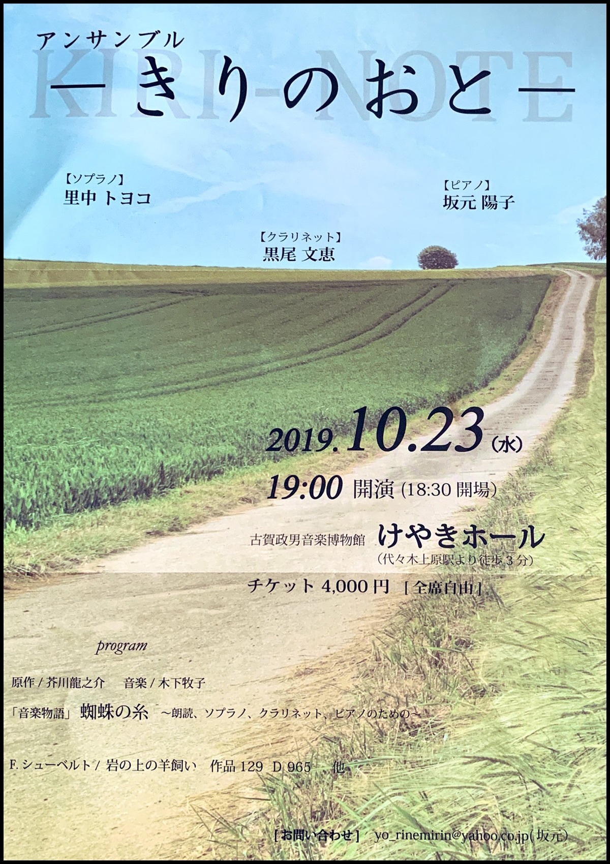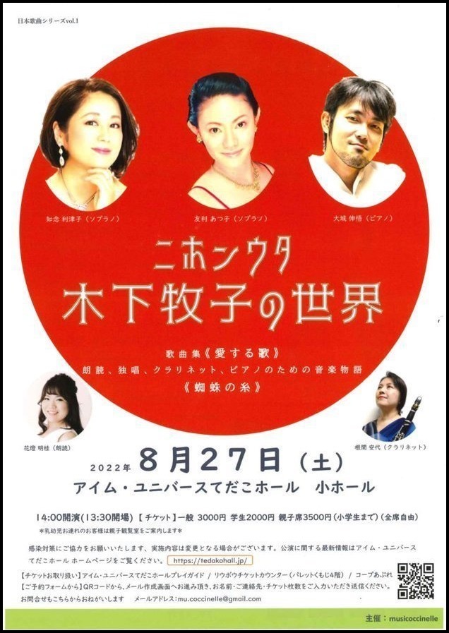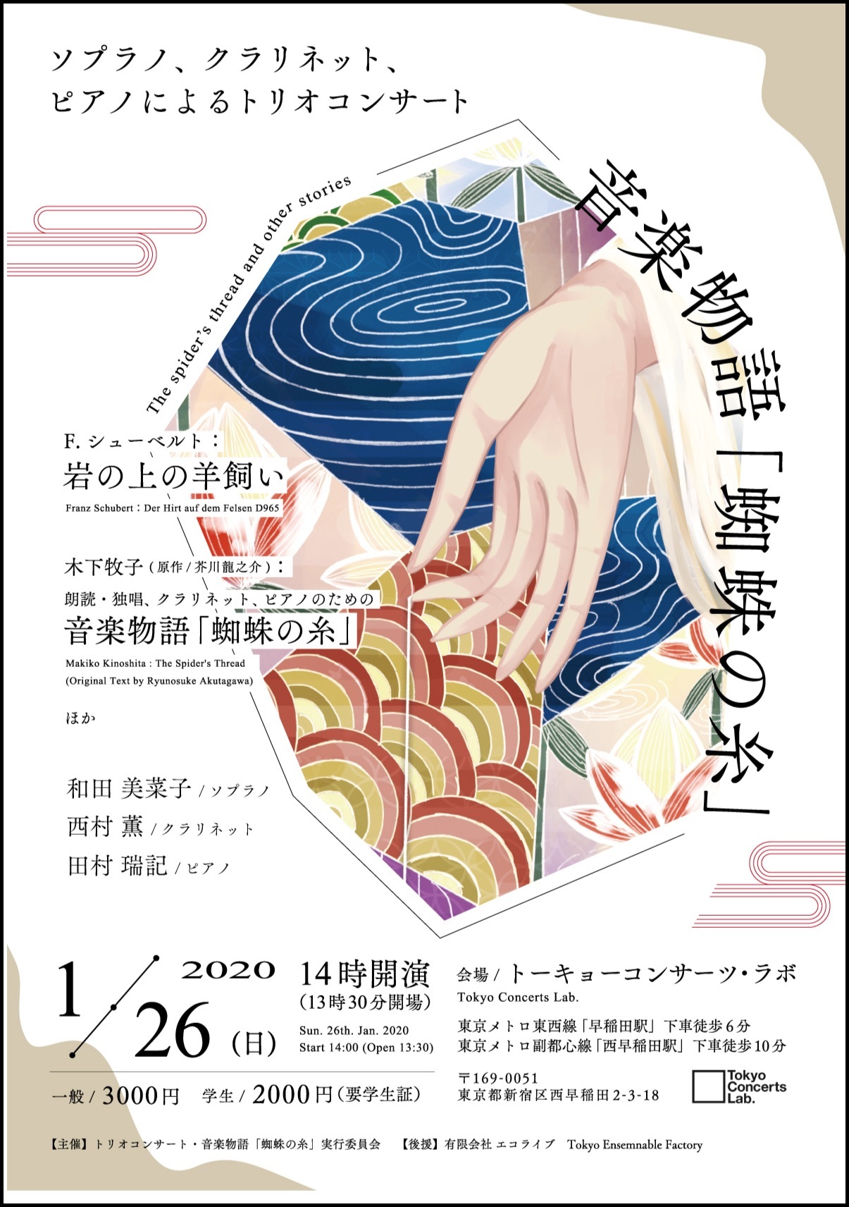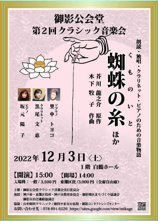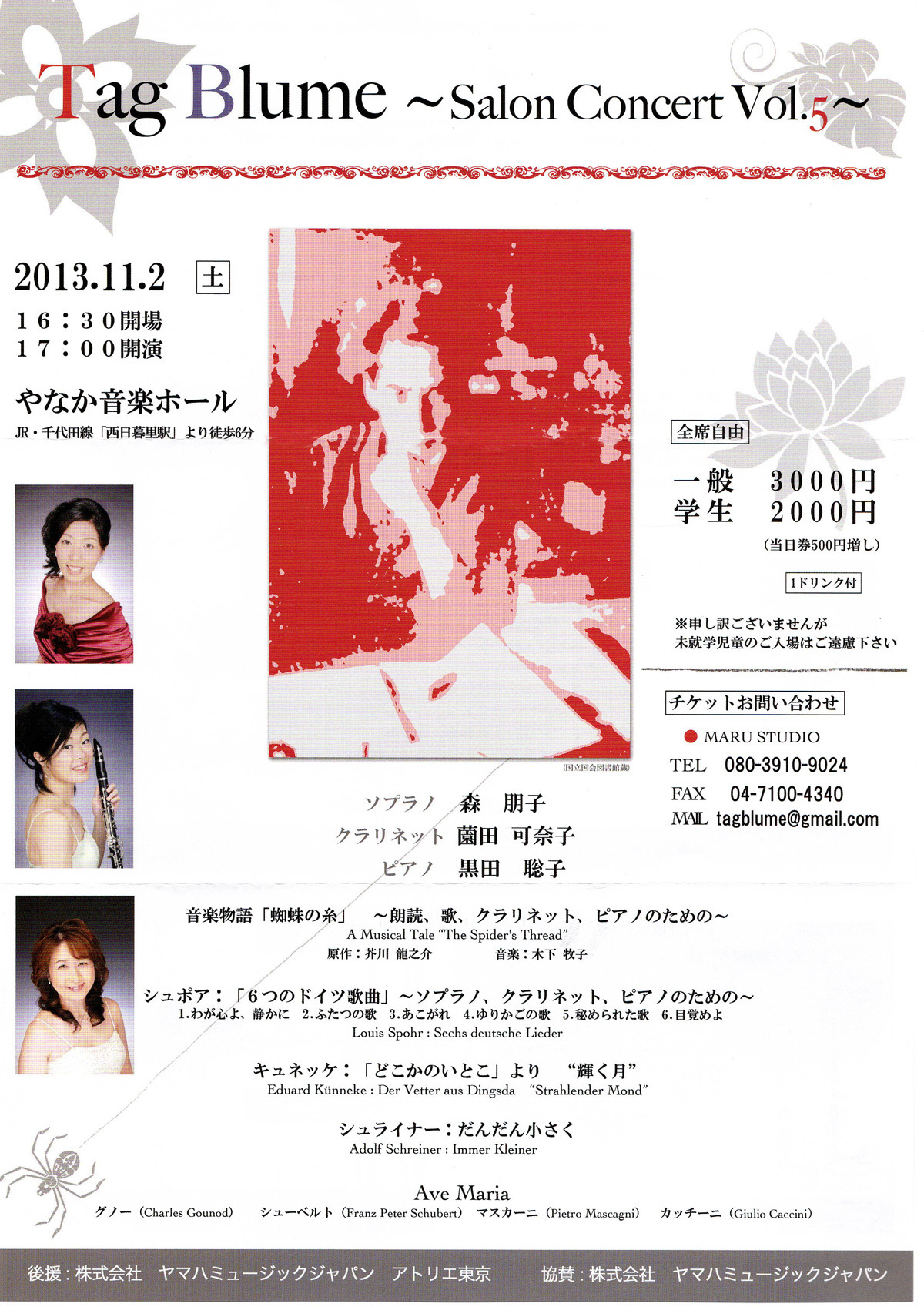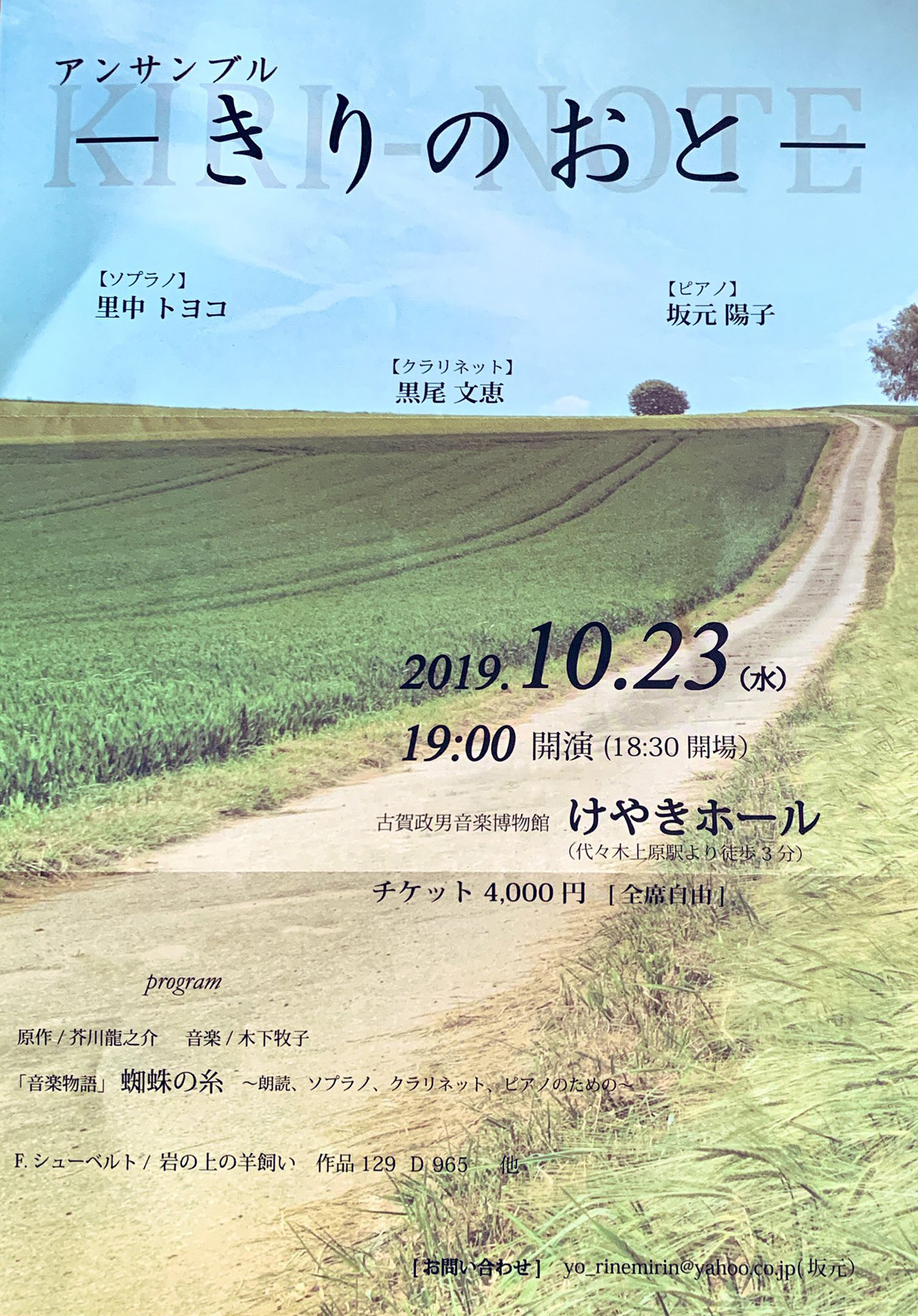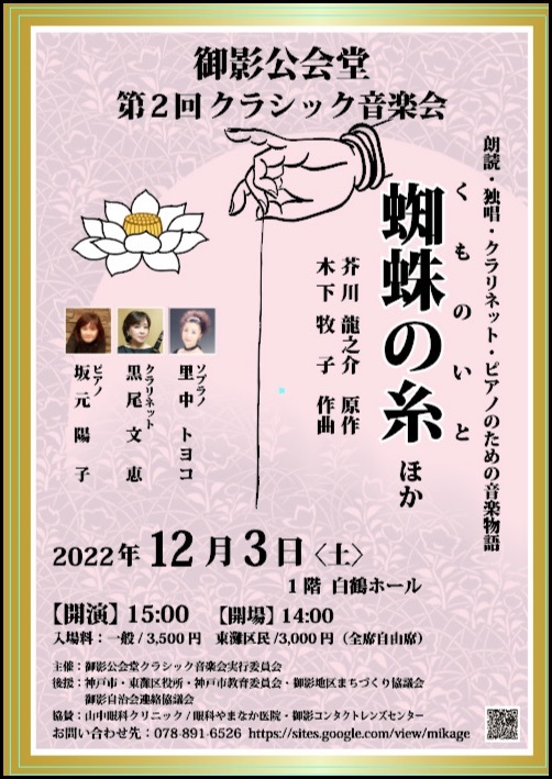 音楽物語「蜘蛛の糸」ちらしコレクション(40) ※画像をクリックすると拡大します。 '25.6/14 (土)朗読.高津 佳 S.藤井ひろみ Cl.遠藤文江 Pf.田中悠一郎金沢市アートホール♦︎ ♦︎ ♦︎ ♦︎ ♦︎ '25.5/6 (火/祝)S/朗読 沢崎恵美 Cl.守屋和佳子 Pf.岩崎能子高津市民館ホール♦︎ ♦︎ ♦︎ ♦︎ ♦︎ '25.4/29 (火/祝)S/朗読 田原ちえCl.海老澤栄美 Pf.田中純子鶴見区民文化センターサルビアH♦︎ ♦︎ ♦︎ ♦︎ ♦︎ '25.4/13(日)朗読.浅井彰子 Ms.田島聖子Cl. 浅田文子 Pf.日下部かおり人形操演.百鬼ゆめひなぎふ清流文化プラザ長良川H♦︎ ♦︎ ♦︎ ♦︎ ♦︎ '25.3/30 (日)朗読.浅井彰子 Ms.田島聖子 Sax.西浦 颯 Pf.日下部かおり人形操演.百鬼ゆめひな阿智村中央公民館ホール♦︎ ♦︎ ♦︎ ♦︎ ♦︎ '25.3/22 (土) S/朗読 大賀千夏子 Cl.東出菜々 Pf.山崎祥代久保惣Eiホール♦︎ ♦︎ ♦︎ ♦︎ ♦︎ '25.3/1 (土)S/朗読 井坂 恵 Cl.西村 薫 Pf.松川 儒美術.出射 茂川西町フレンドリープラザ♦︎ ♦︎ ♦︎ ♦︎ ♦︎ '24.8/30 (土)S/朗読 涂 櫻Vc.三谷野絵 Pf.谷口若菜マリー コンツェルト♦︎ ♦︎ ♦︎ ♦︎ ♦︎ '24.8/4(日) S/朗読 家田紀子Cl. 黒尾文恵 Pf.坂元陽子ムジカーザ♦︎ ♦︎ ♦︎ ♦︎ ♦︎ '24.7/20 (土)S/朗読 和田美菜子Cl. 西村 薫 Pf.高橋ドレミきららホール♦︎ ♦︎ ♦︎ ♦︎ ♦︎ '24.5/11 (土)S/朗読 青木つくしCl.田中香織 Pf.山本佳代子GINZA7TH STUDIO♦︎ ♦︎ ♦︎ ♦︎ ♦︎ '24.3/24(日)S/朗読 松浦(郷津) 恵Cl. 郷津隆幸 Pf.郷津由紀子Perc.郷津幸男山形市民会館小ホール♦︎ ♦︎ ♦︎ ♦︎ ♦︎ '23.4/23 (日)S/朗読 青木つくしCl. 田中香織 Pf.山本佳代子戸畑市民会館中ホール♦︎ ♦︎ ♦︎ ♦︎ ♦︎ '23.4/15 (土)S/朗読 北島佳世Cl. 照沼夢輝 Pf.小林萌里観蔵院 曼荼羅美術館♦︎ ♦︎ ♦︎ ♦︎ ♦︎ '23.1/29 (日)S/朗読 和田美菜子 Cl.西村 薫 Pf.斎藤誠二プラッツ習志野市民ホール♦︎ ♦︎ ♦︎ ♦︎ ♦︎ '22.12/3(土)S/朗読 里中トヨコCl. 黒尾文恵 Pf.坂元陽子御影公会堂白鶴ホール♦︎ ♦︎ ♦︎ ♦︎ ♦︎ '22.11/6 (日)S/朗読 真野綾子 Cl.丸木一巧 Pf.田邉安紀恵Pfカフェ ベヒシュタイン♦︎ ♦︎ ♦︎ ♦︎ ♦︎ '22.8/27 (土)N.花燈明桂 S.友利あつ子Cl.根間安代 Pf.大城伸悟アイム・ユニバースてだこ小♦︎ ♦︎ ♦︎ ♦︎ ♦︎ '22.4/29 (金/祝)S/朗読 里中トヨコCl. 黒尾文恵 Pf.石橋衣里東京オペラシティリサイタルH♦︎ ♦︎ ♦︎ ♦︎ ♦︎ '22.4/16(土)S/朗読 栗原未和Cl.小谷口直子 Pf.二塚裕美京都アスニー♦︎ ♦︎ ♦︎ ♦︎ ♦︎ '22.4/3(日)S/朗読 小山瑠美子Cl. 西村 薫 Pf.斉藤晴海りゅーとぴあ スタジオA♦︎ ♦︎ ♦︎ ♦︎ ♦︎ '22.3/21 (日)S/朗読 大賀千夏子 Cl.東出菜々 Pf.山崎祥代久保惣Eiホール♦︎ ♦︎ ♦︎ ♦︎ ♦︎ '21.12/26 (日)S/朗読 平野則子 Cl.三瓶佳紀 Pf.浅井智子渡辺淳一文学館♦︎ ♦︎ ♦︎ ♦︎ ♦︎ '21.12/12 (日)S/朗読 吉田美紀 Cl.小宮山由佳 Pf.岩元志真潮音寺♦︎ ♦︎ ♦︎ ♦︎ ♦︎ '21.4/3(土)S/朗読 出口裕子 Cl.西崎智子 Pf.松下智子岡山 ルネスホール♦︎ ♦︎ ♦︎ ♦︎ ♦︎ '21.3/7(日)S/朗読 宮地里実 Cl.小嶋慶子 Pf.吉田 純横浜市歴史博物館エントランスH♦︎ ♦︎ ♦︎ ♦︎ ♦︎ '21.2/9(火)S/朗読 久保菊子Cl.藤原猛浩 Pf.田中涼太兵庫県立芸術文化センター小 ♦︎ ♦︎ ♦︎ ♦︎ ♦︎ '20.12/20(日)S/朗読 針生美智子 Cl.河野泰幸 Pf.外山啓介札幌大谷大学記念ホール ♦︎ ♦︎ ♦︎ ♦︎ ♦︎ '20.1/26(日)S/朗読 和田美菜子 Cl.西村 薫 Pf.田村瑞記トーキョーコンサーツ•ラボ ♦︎ ♦︎ ♦︎ ♦︎ ♦︎ '19.10/23(水)S/朗読 里中トヨコ Cl.黒尾文恵 Pf.坂元陽子けやきホール ♦︎ ♦︎ ♦︎ ♦︎ ♦︎ '19.10/20(日)S/朗読 和泉聰子Cl.小林利彰 Pf. 藤岡由記蕨市立文化ホール くるる ♦︎ ♦︎ ♦︎ ♦︎ ♦︎ '19.9/26(木) S/朗読.三輪晴美Cl.本田沙紀 Pf.田中 恵岡崎市シビックコンサートホール ♦︎ ♦︎ ♦︎ ♦︎ ♦︎ '19.8/4(日) S.豐田かおリ 朗読.大場由香Cl.岡林和歌 Pf.岩永圭司HITOMIホール♦︎ ♦︎ ♦︎ ♦︎ ♦︎ '18.11/23(金) 主催:日本甲状腺学会S/朗読 加藤千春Cl.齋藤 Pf.榊原紀保子ウェスタ川越小ホール ♦︎ ♦︎ ♦︎ ♦︎ ♦︎ '18.8/25(土)S/朗読 松下悦子 Cl.小谷口直子 Pf.土居知子京都府民ホール•アルティ♦︎ ♦︎ ♦︎ ♦︎ ♦︎ '17.9/2(土)9/5(火)S/朗読 針生美智子Cl.人見 剛 Pf.平野裕樹子千葉市男女共同参画C東京建物 八重洲ホール♦︎ ♦︎ ♦︎ ♦︎ ♦︎ '16. 11/5 (土)主催:栄区文化協会S/朗読 浅野美帆子Cl.松本安津美 Pf.田中初芽栄区民文化センターリリス ♦︎ ♦︎ ♦︎ ♦︎ ♦︎ '16.4/17(日)主催:オフィス・マキナS/朗読 駒井ゆり子 Cl.草刈民代 Pf.榊原紀保子サントリーH ブルーローズ♦︎ ♦︎ ♦︎ ♦︎ ♦︎ '13.11/2(土)S/朗読 森 朋子 Cl.薗田可奈子 Pf.黒田聡子 やなか音楽ホール ♦︎ ♦︎ ♦︎ ♦︎ ♦︎ '12.6/30(土)委嘱初演 Deux LilasS/朗読 加藤千春 Cl.伊藤圭 Pf.榊原紀保子けやきホール ♦︎ ♦︎ ♦︎ ♦︎ ♦︎ ページトップへ