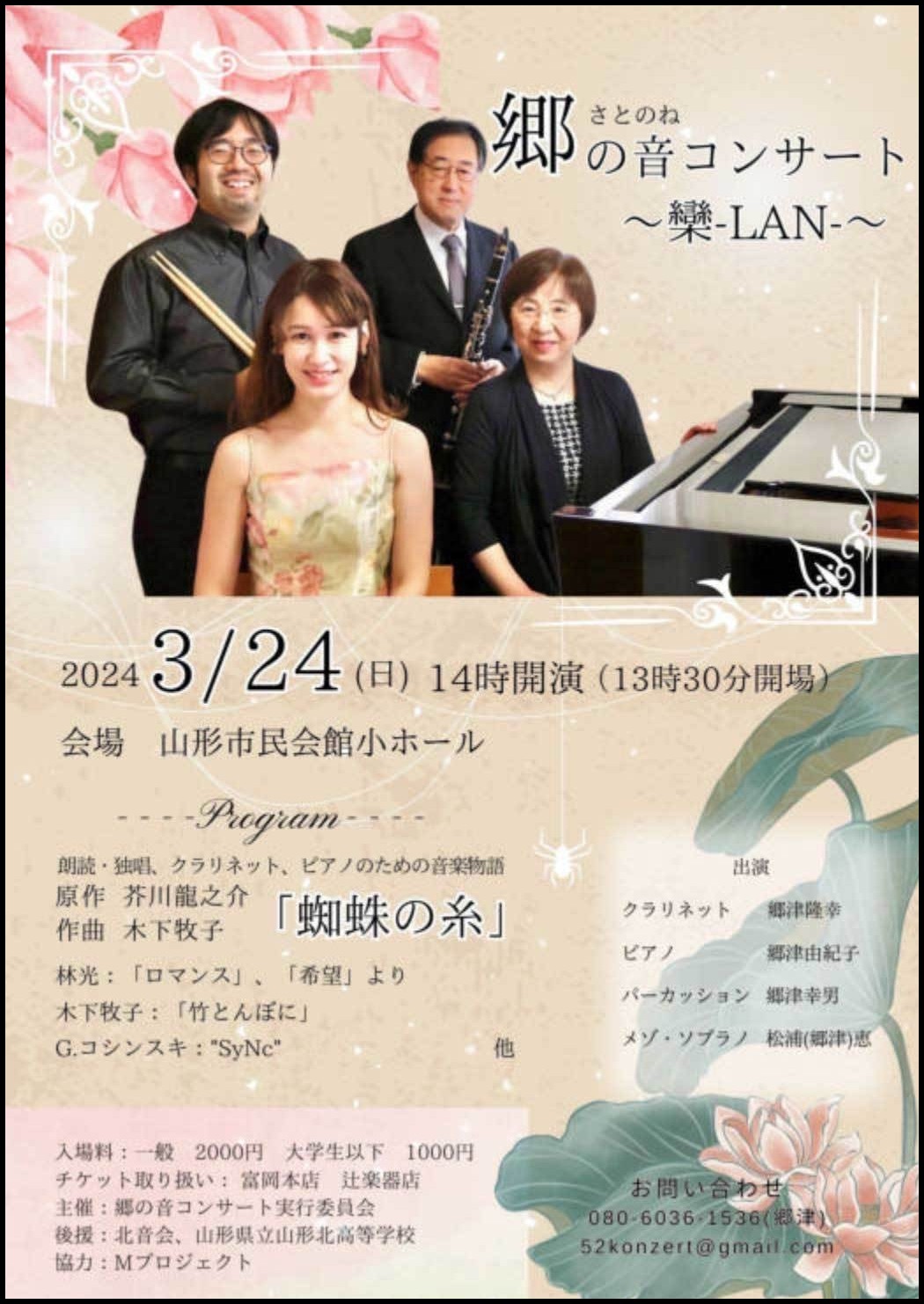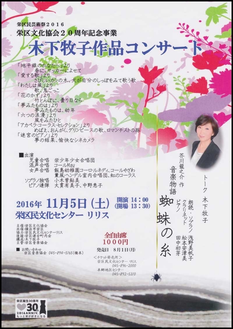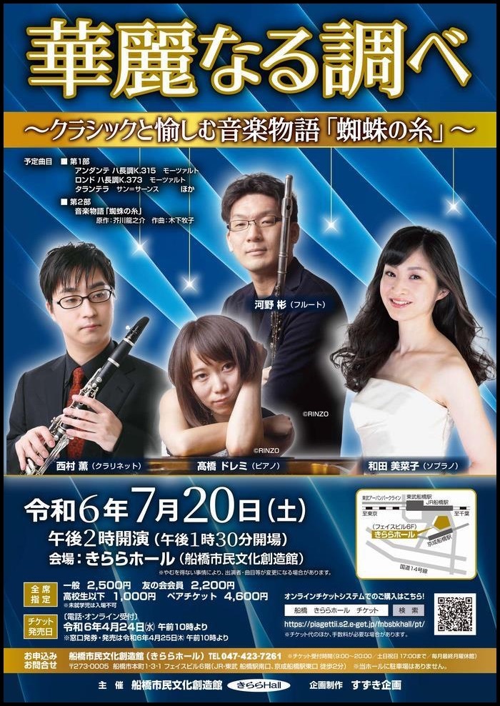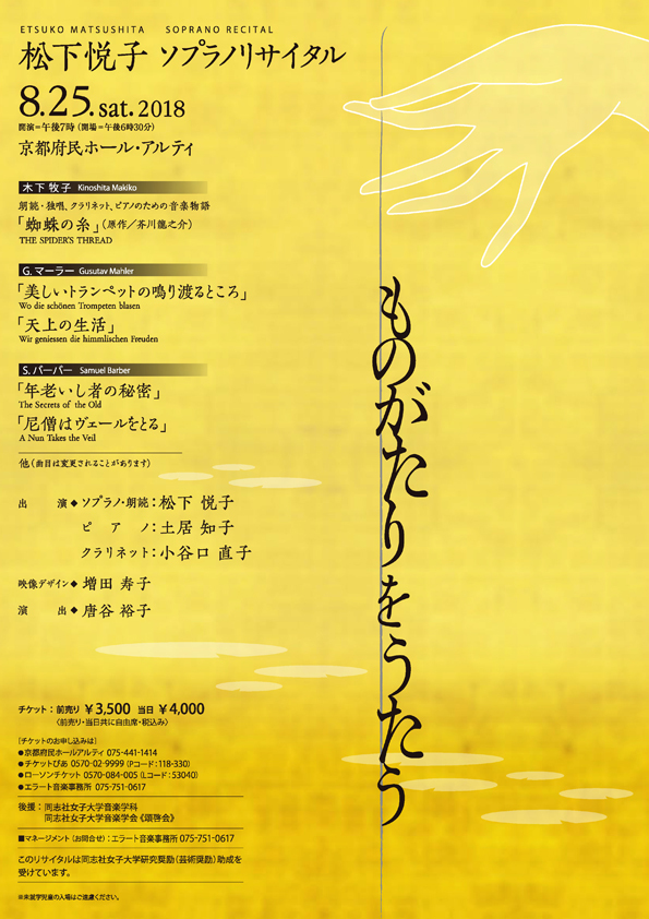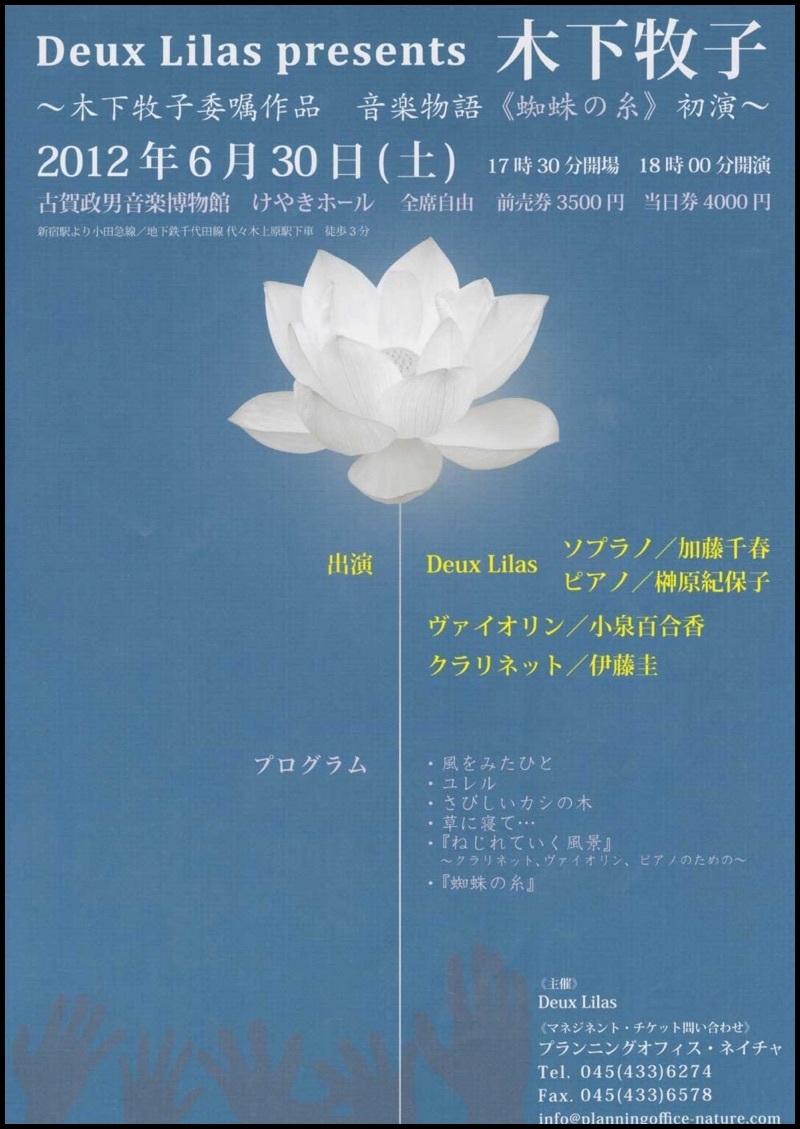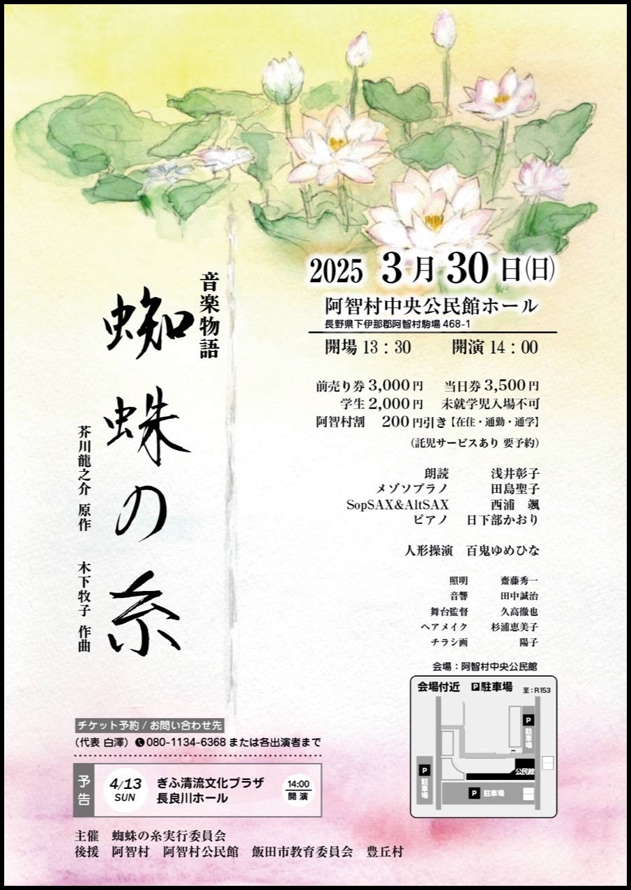 音楽物語「蜘蛛の糸」ちらしコレクション(40) ※画像をクリックすると拡大します。 '25.6/14 (土)朗読.高津 佳 S.藤井ひろみ Cl.遠藤文江 Pf.田中悠一郎金沢市アートホール♦︎ ♦︎ ♦︎ ♦︎ ♦︎ '25.5/6 (火/祝)S/朗読 沢崎恵美 Cl.守屋和佳子 Pf.岩崎能子高津市民館ホール♦︎ ♦︎ ♦︎ ♦︎ ♦︎ '25.4/29 (火/祝)S/朗読 田原ちえCl.海老澤栄美 Pf.田中純子鶴見区民文化センターサルビアH♦︎ ♦︎ ♦︎ ♦︎ ♦︎ '25.4/13(日)朗読.浅井彰子 Ms.田島聖子Cl. 浅田文子 Pf.日下部かおり人形操演.百鬼ゆめひなぎふ清流文化プラザ長良川H♦︎ ♦︎ ♦︎ ♦︎ ♦︎ '25.3/30 (日)朗読.浅井彰子 Ms.田島聖子 Sax.西浦 颯 Pf.日下部かおり人形操演.百鬼ゆめひな阿智村中央公民館ホール♦︎ ♦︎ ♦︎ ♦︎ ♦︎ '25.3/22 (土) S/朗読 大賀千夏子 Cl.東出菜々 Pf.山崎祥代久保惣Eiホール♦︎ ♦︎ ♦︎ ♦︎ ♦︎ '25.3/1 (土)S/朗読 井坂 恵 Cl.西村 薫 Pf.松川 儒美術.出射 茂川西町フレンドリープラザ♦︎ ♦︎ ♦︎ ♦︎ ♦︎ '24.8/30 (土)S/朗読 涂 櫻Vc.三谷野絵 Pf.谷口若菜マリー コンツェルト♦︎ ♦︎ ♦︎ ♦︎ ♦︎ '24.8/4(日) S/朗読 家田紀子Cl. 黒尾文恵 Pf.坂元陽子ムジカーザ♦︎ ♦︎ ♦︎ ♦︎ ♦︎ '24.7/20 (土)S/朗読 和田美菜子Cl. 西村 薫 Pf.高橋ドレミきららホール♦︎ ♦︎ ♦︎ ♦︎ ♦︎ '24.5/11 (土)S/朗読 青木つくしCl.田中香織 Pf.山本佳代子GINZA7TH STUDIO♦︎ ♦︎ ♦︎ ♦︎ ♦︎ '24.3/24(日)S/朗読 松浦(郷津) 恵Cl. 郷津隆幸 Pf.郷津由紀子Perc.郷津幸男山形市民会館小ホール♦︎ ♦︎ ♦︎ ♦︎ ♦︎ '23.4/23 (日)S/朗読 青木つくしCl. 田中香織 Pf.山本佳代子戸畑市民会館中ホール♦︎ ♦︎ ♦︎ ♦︎ ♦︎ '23.4/15 (土)S/朗読 北島佳世Cl. 照沼夢輝 Pf.小林萌里観蔵院 曼荼羅美術館♦︎ ♦︎ ♦︎ ♦︎ ♦︎ '23.1/29 (日)S/朗読 和田美菜子 Cl.西村 薫 Pf.斎藤誠二プラッツ習志野市民ホール♦︎ ♦︎ ♦︎ ♦︎ ♦︎ '22.12/3(土)S/朗読 里中トヨコCl. 黒尾文恵 Pf.坂元陽子御影公会堂白鶴ホール♦︎ ♦︎ ♦︎ ♦︎ ♦︎ '22.11/6 (日)S/朗読 真野綾子 Cl.丸木一巧 Pf.田邉安紀恵Pfカフェ ベヒシュタイン♦︎ ♦︎ ♦︎ ♦︎ ♦︎ '22.8/27 (土)N.花燈明桂 S.友利あつ子Cl.根間安代 Pf.大城伸悟アイム・ユニバースてだこ小♦︎ ♦︎ ♦︎ ♦︎ ♦︎ '22.4/29 (金/祝)S/朗読 里中トヨコCl. 黒尾文恵 Pf.石橋衣里東京オペラシティリサイタルH♦︎ ♦︎ ♦︎ ♦︎ ♦︎ '22.4/16(土)S/朗読 栗原未和Cl.小谷口直子 Pf.二塚裕美京都アスニー♦︎ ♦︎ ♦︎ ♦︎ ♦︎ '22.4/3(日)S/朗読 小山瑠美子Cl. 西村 薫 Pf.斉藤晴海りゅーとぴあ スタジオA♦︎ ♦︎ ♦︎ ♦︎ ♦︎ '22.3/21 (日)S/朗読 大賀千夏子 Cl.東出菜々 Pf.山崎祥代久保惣Eiホール♦︎ ♦︎ ♦︎ ♦︎ ♦︎ '21.12/26 (日)S/朗読 平野則子 Cl.三瓶佳紀 Pf.浅井智子渡辺淳一文学館♦︎ ♦︎ ♦︎ ♦︎ ♦︎ '21.12/12 (日)S/朗読 吉田美紀 Cl.小宮山由佳 Pf.岩元志真潮音寺♦︎ ♦︎ ♦︎ ♦︎ ♦︎ '21.4/3(土)S/朗読 出口裕子 Cl.西崎智子 Pf.松下智子岡山 ルネスホール♦︎ ♦︎ ♦︎ ♦︎ ♦︎ '21.3/7(日)S/朗読 宮地里実 Cl.小嶋慶子 Pf.吉田 純横浜市歴史博物館エントランスH♦︎ ♦︎ ♦︎ ♦︎ ♦︎ '21.2/9(火)S/朗読 久保菊子Cl.藤原猛浩 Pf.田中涼太兵庫県立芸術文化センター小 ♦︎ ♦︎ ♦︎ ♦︎ ♦︎ '20.12/20(日)S/朗読 針生美智子 Cl.河野泰幸 Pf.外山啓介札幌大谷大学記念ホール ♦︎ ♦︎ ♦︎ ♦︎ ♦︎ '20.1/26(日)S/朗読 和田美菜子 Cl.西村 薫 Pf.田村瑞記トーキョーコンサーツ•ラボ ♦︎ ♦︎ ♦︎ ♦︎ ♦︎ '19.10/23(水)S/朗読 里中トヨコ Cl.黒尾文恵 Pf.坂元陽子けやきホール ♦︎ ♦︎ ♦︎ ♦︎ ♦︎ '19.10/20(日)S/朗読 和泉聰子Cl.小林利彰 Pf. 藤岡由記蕨市立文化ホール くるる ♦︎ ♦︎ ♦︎ ♦︎ ♦︎ '19.9/26(木) S/朗読.三輪晴美Cl.本田沙紀 Pf.田中 恵岡崎市シビックコンサートホール ♦︎ ♦︎ ♦︎ ♦︎ ♦︎ '19.8/4(日) S.豐田かおリ 朗読.大場由香Cl.岡林和歌 Pf.岩永圭司HITOMIホール♦︎ ♦︎ ♦︎ ♦︎ ♦︎ '18.11/23(金) 主催:日本甲状腺学会S/朗読 加藤千春Cl.齋藤 Pf.榊原紀保子ウェスタ川越小ホール ♦︎ ♦︎ ♦︎ ♦︎ ♦︎ '18.8/25(土)S/朗読 松下悦子 Cl.小谷口直子 Pf.土居知子京都府民ホール•アルティ♦︎ ♦︎ ♦︎ ♦︎ ♦︎ '17.9/2(土)9/5(火)S/朗読 針生美智子Cl.人見 剛 Pf.平野裕樹子千葉市男女共同参画C東京建物 八重洲ホール♦︎ ♦︎ ♦︎ ♦︎ ♦︎ '16. 11/5 (土)主催:栄区文化協会S/朗読 浅野美帆子Cl.松本安津美 Pf.田中初芽栄区民文化センターリリス ♦︎ ♦︎ ♦︎ ♦︎ ♦︎ '16.4/17(日)主催:オフィス・マキナS/朗読 駒井ゆり子 Cl.草刈民代 Pf.榊原紀保子サントリーH ブルーローズ♦︎ ♦︎ ♦︎ ♦︎ ♦︎ '13.11/2(土)S/朗読 森 朋子 Cl.薗田可奈子 Pf.黒田聡子 やなか音楽ホール ♦︎ ♦︎ ♦︎ ♦︎ ♦︎ '12.6/30(土)委嘱初演 Deux LilasS/朗読 加藤千春 Cl.伊藤圭 Pf.榊原紀保子けやきホール ♦︎ ♦︎ ♦︎ ♦︎ ♦︎ ページトップへ