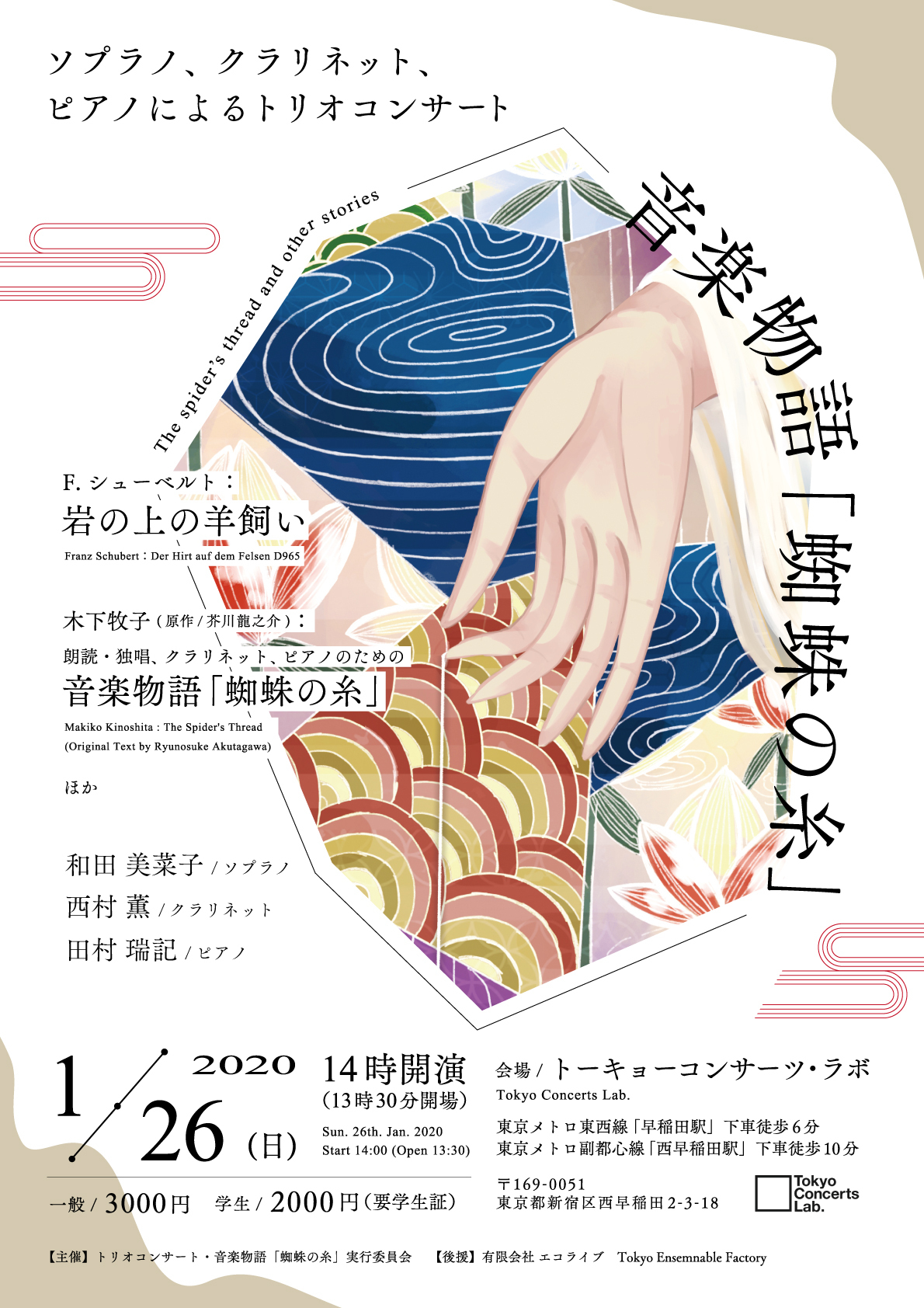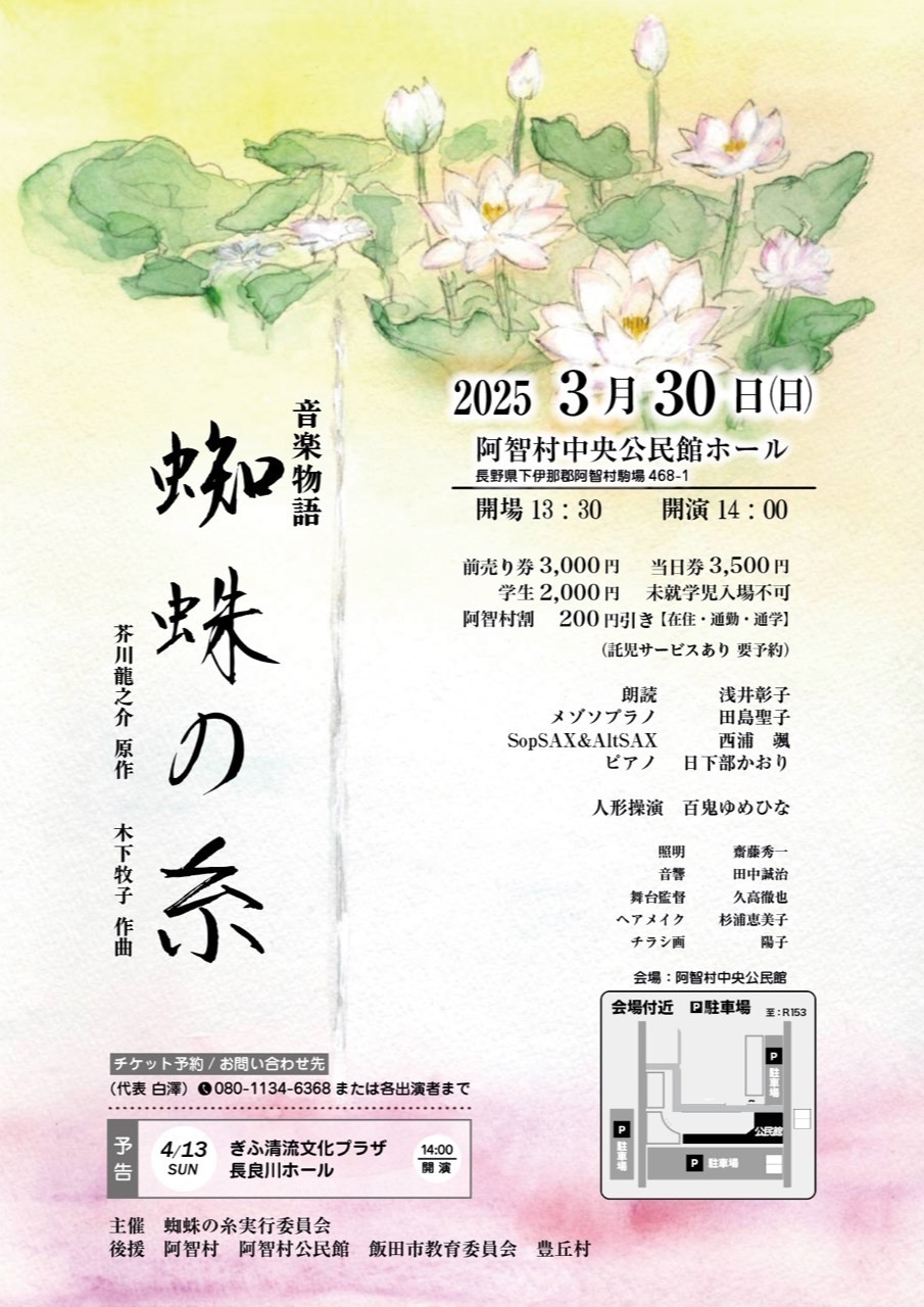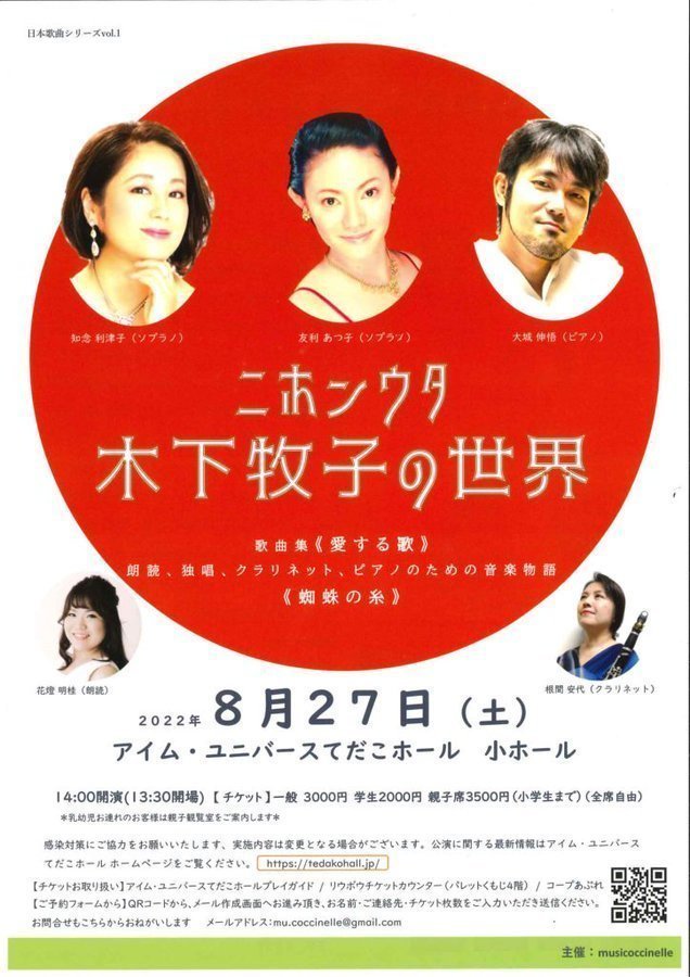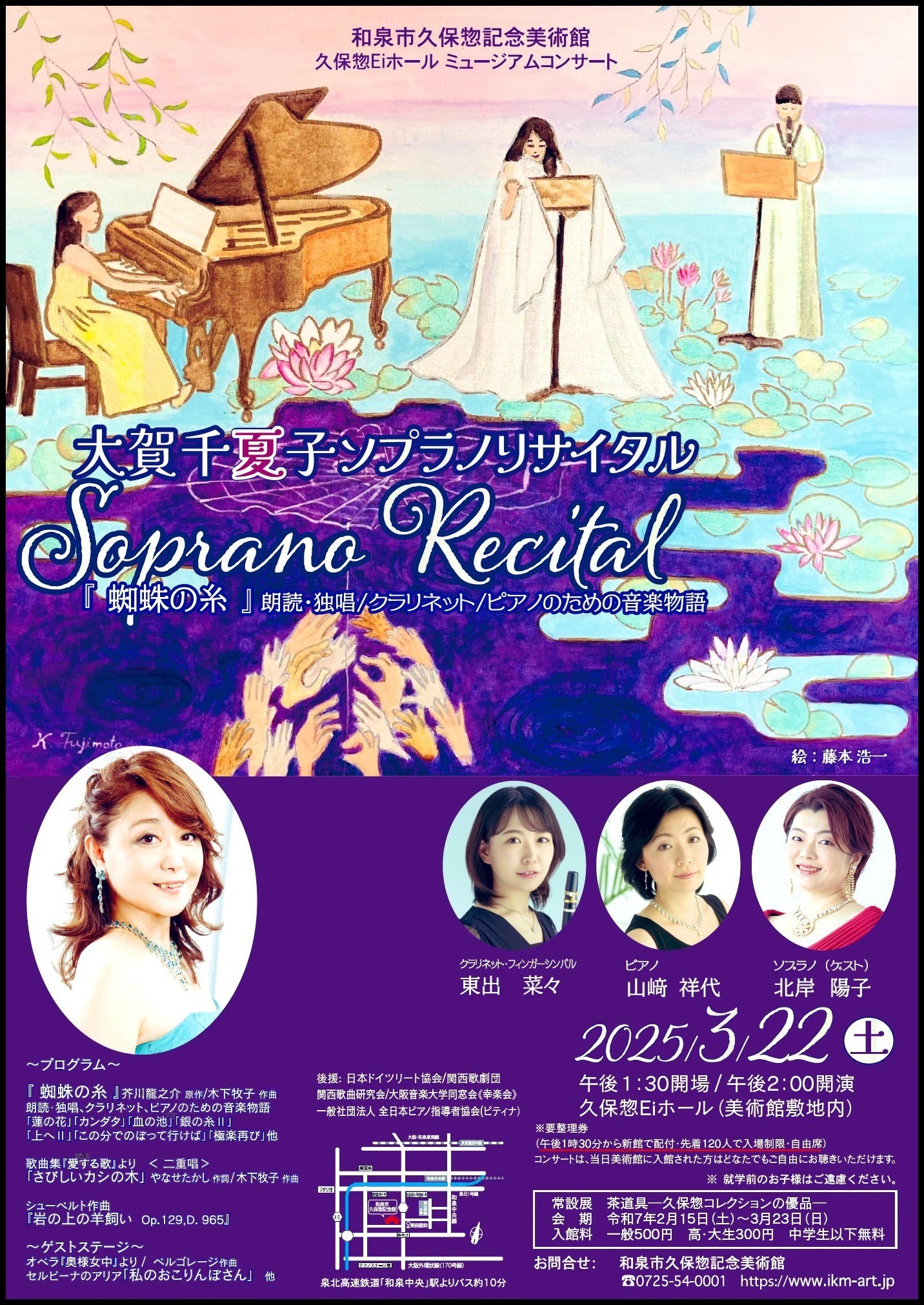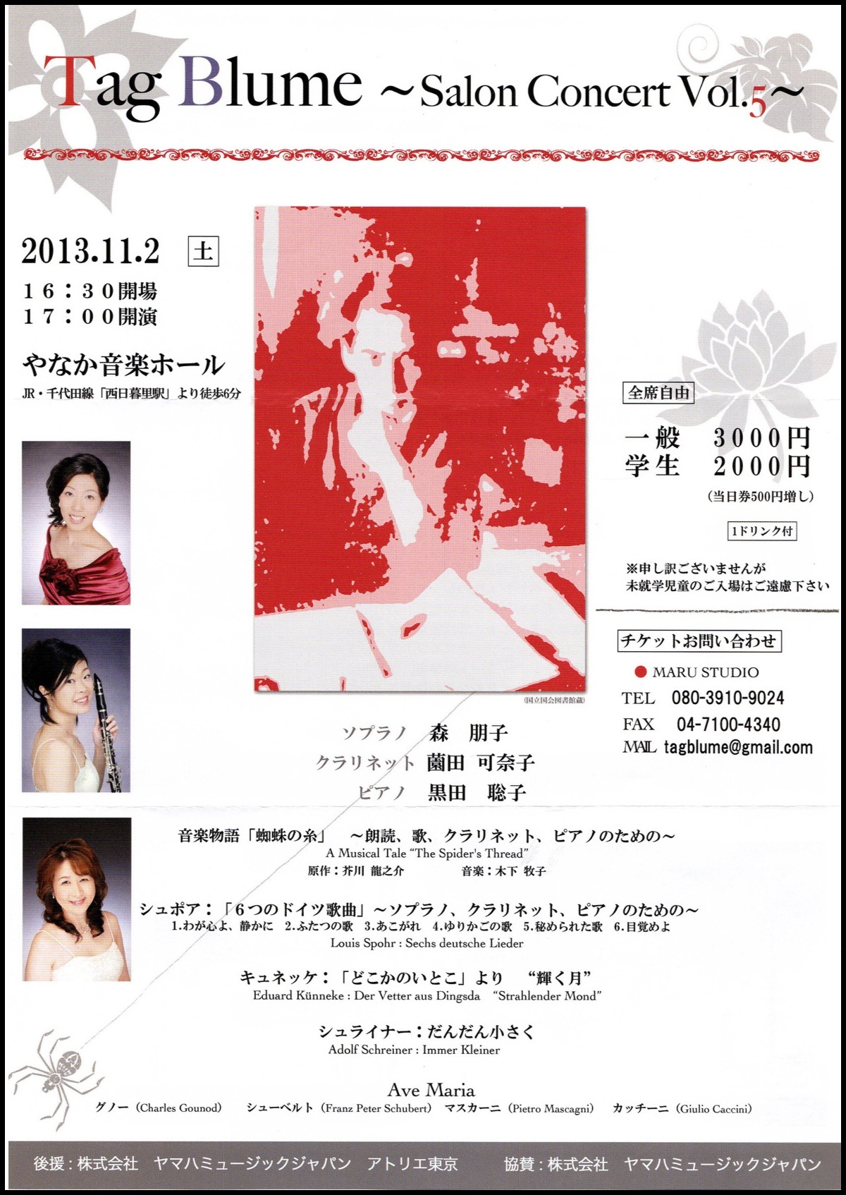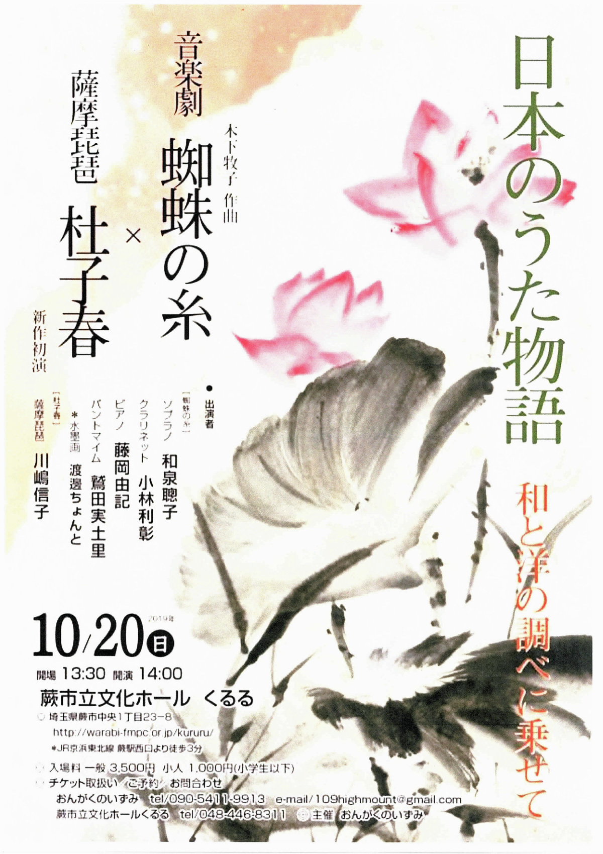 音楽物語「蜘蛛の糸」ちらしコレクション(40) ※画像をクリックすると拡大します。 '25.6/14 (土)朗読.高津 佳 S.藤井ひろみ Cl.遠藤文江 Pf.田中悠一郎金沢市アートホール♦︎ ♦︎ ♦︎ ♦︎ ♦︎ '25.5/6 (火/祝)S/朗読 沢崎恵美 Cl.守屋和佳子 Pf.岩崎能子高津市民館ホール♦︎ ♦︎ ♦︎ ♦︎ ♦︎ '25.4/29 (火/祝)S/朗読 田原ちえCl.海老澤栄美 Pf.田中純子鶴見区民文化センターサルビアH♦︎ ♦︎ ♦︎ ♦︎ ♦︎ '25.4/13(日)朗読.浅井彰子 Ms.田島聖子Cl. 浅田文子 Pf.日下部かおり人形操演.百鬼ゆめひなぎふ清流文化プラザ長良川H♦︎ ♦︎ ♦︎ ♦︎ ♦︎ '25.3/30 (日)朗読.浅井彰子 Ms.田島聖子 Sax.西浦 颯 Pf.日下部かおり人形操演.百鬼ゆめひな阿智村中央公民館ホール♦︎ ♦︎ ♦︎ ♦︎ ♦︎ '25.3/22 (土) S/朗読 大賀千夏子 Cl.東出菜々 Pf.山崎祥代久保惣Eiホール♦︎ ♦︎ ♦︎ ♦︎ ♦︎ '25.3/1 (土)S/朗読 井坂 恵 Cl.西村 薫 Pf.松川 儒美術.出射 茂川西町フレンドリープラザ♦︎ ♦︎ ♦︎ ♦︎ ♦︎ '24.8/30 (土)S/朗読 涂 櫻Vc.三谷野絵 Pf.谷口若菜マリー コンツェルト♦︎ ♦︎ ♦︎ ♦︎ ♦︎ '24.8/4(日) S/朗読 家田紀子Cl. 黒尾文恵 Pf.坂元陽子ムジカーザ♦︎ ♦︎ ♦︎ ♦︎ ♦︎ '24.7/20 (土)S/朗読 和田美菜子Cl. 西村 薫 Pf.高橋ドレミきららホール♦︎ ♦︎ ♦︎ ♦︎ ♦︎ '24.5/11 (土)S/朗読 青木つくしCl.田中香織 Pf.山本佳代子GINZA7TH STUDIO♦︎ ♦︎ ♦︎ ♦︎ ♦︎ '24.3/24(日)S/朗読 松浦(郷津) 恵Cl. 郷津隆幸 Pf.郷津由紀子Perc.郷津幸男山形市民会館小ホール♦︎ ♦︎ ♦︎ ♦︎ ♦︎ '23.4/23 (日)S/朗読 青木つくしCl. 田中香織 Pf.山本佳代子戸畑市民会館中ホール♦︎ ♦︎ ♦︎ ♦︎ ♦︎ '23.4/15 (土)S/朗読 北島佳世Cl. 照沼夢輝 Pf.小林萌里観蔵院 曼荼羅美術館♦︎ ♦︎ ♦︎ ♦︎ ♦︎ '23.1/29 (日)S/朗読 和田美菜子 Cl.西村 薫 Pf.斎藤誠二プラッツ習志野市民ホール♦︎ ♦︎ ♦︎ ♦︎ ♦︎ '22.12/3(土)S/朗読 里中トヨコCl. 黒尾文恵 Pf.坂元陽子御影公会堂白鶴ホール♦︎ ♦︎ ♦︎ ♦︎ ♦︎ '22.11/6 (日)S/朗読 真野綾子 Cl.丸木一巧 Pf.田邉安紀恵Pfカフェ ベヒシュタイン♦︎ ♦︎ ♦︎ ♦︎ ♦︎ '22.8/27 (土)N.花燈明桂 S.友利あつ子Cl.根間安代 Pf.大城伸悟アイム・ユニバースてだこ小♦︎ ♦︎ ♦︎ ♦︎ ♦︎ '22.4/29 (金/祝)S/朗読 里中トヨコCl. 黒尾文恵 Pf.石橋衣里東京オペラシティリサイタルH♦︎ ♦︎ ♦︎ ♦︎ ♦︎ '22.4/16(土)S/朗読 栗原未和Cl.小谷口直子 Pf.二塚裕美京都アスニー♦︎ ♦︎ ♦︎ ♦︎ ♦︎ '22.4/3(日)S/朗読 小山瑠美子Cl. 西村 薫 Pf.斉藤晴海りゅーとぴあ スタジオA♦︎ ♦︎ ♦︎ ♦︎ ♦︎ '22.3/21 (日)S/朗読 大賀千夏子 Cl.東出菜々 Pf.山崎祥代久保惣Eiホール♦︎ ♦︎ ♦︎ ♦︎ ♦︎ '21.12/26 (日)S/朗読 平野則子 Cl.三瓶佳紀 Pf.浅井智子渡辺淳一文学館♦︎ ♦︎ ♦︎ ♦︎ ♦︎ '21.12/12 (日)S/朗読 吉田美紀 Cl.小宮山由佳 Pf.岩元志真潮音寺♦︎ ♦︎ ♦︎ ♦︎ ♦︎ '21.4/3(土)S/朗読 出口裕子 Cl.西崎智子 Pf.松下智子岡山 ルネスホール♦︎ ♦︎ ♦︎ ♦︎ ♦︎ '21.3/7(日)S/朗読 宮地里実 Cl.小嶋慶子 Pf.吉田 純横浜市歴史博物館エントランスH♦︎ ♦︎ ♦︎ ♦︎ ♦︎ '21.2/9(火)S/朗読 久保菊子Cl.藤原猛浩 Pf.田中涼太兵庫県立芸術文化センター小 ♦︎ ♦︎ ♦︎ ♦︎ ♦︎ '20.12/20(日)S/朗読 針生美智子 Cl.河野泰幸 Pf.外山啓介札幌大谷大学記念ホール ♦︎ ♦︎ ♦︎ ♦︎ ♦︎ '20.1/26(日)S/朗読 和田美菜子 Cl.西村 薫 Pf.田村瑞記トーキョーコンサーツ•ラボ ♦︎ ♦︎ ♦︎ ♦︎ ♦︎ '19.10/23(水)S/朗読 里中トヨコ Cl.黒尾文恵 Pf.坂元陽子けやきホール ♦︎ ♦︎ ♦︎ ♦︎ ♦︎ '19.10/20(日)S/朗読 和泉聰子Cl.小林利彰 Pf. 藤岡由記蕨市立文化ホール くるる ♦︎ ♦︎ ♦︎ ♦︎ ♦︎ '19.9/26(木) S/朗読.三輪晴美Cl.本田沙紀 Pf.田中 恵岡崎市シビックコンサートホール ♦︎ ♦︎ ♦︎ ♦︎ ♦︎ '19.8/4(日) S.豐田かおリ 朗読.大場由香Cl.岡林和歌 Pf.岩永圭司HITOMIホール♦︎ ♦︎ ♦︎ ♦︎ ♦︎ '18.11/23(金) 主催:日本甲状腺学会S/朗読 加藤千春Cl.齋藤 Pf.榊原紀保子ウェスタ川越小ホール ♦︎ ♦︎ ♦︎ ♦︎ ♦︎ '18.8/25(土)S/朗読 松下悦子 Cl.小谷口直子 Pf.土居知子京都府民ホール•アルティ♦︎ ♦︎ ♦︎ ♦︎ ♦︎ '17.9/2(土)9/5(火)S/朗読 針生美智子Cl.人見 剛 Pf.平野裕樹子千葉市男女共同参画C東京建物 八重洲ホール♦︎ ♦︎ ♦︎ ♦︎ ♦︎ '16. 11/5 (土)主催:栄区文化協会S/朗読 浅野美帆子Cl.松本安津美 Pf.田中初芽栄区民文化センターリリス ♦︎ ♦︎ ♦︎ ♦︎ ♦︎ '16.4/17(日)主催:オフィス・マキナS/朗読 駒井ゆり子 Cl.草刈民代 Pf.榊原紀保子サントリーH ブルーローズ♦︎ ♦︎ ♦︎ ♦︎ ♦︎ '13.11/2(土)S/朗読 森 朋子 Cl.薗田可奈子 Pf.黒田聡子 やなか音楽ホール ♦︎ ♦︎ ♦︎ ♦︎ ♦︎ '12.6/30(土)委嘱初演 Deux LilasS/朗読 加藤千春 Cl.伊藤圭 Pf.榊原紀保子けやきホール ♦︎ ♦︎ ♦︎ ♦︎ ♦︎ ページトップへ