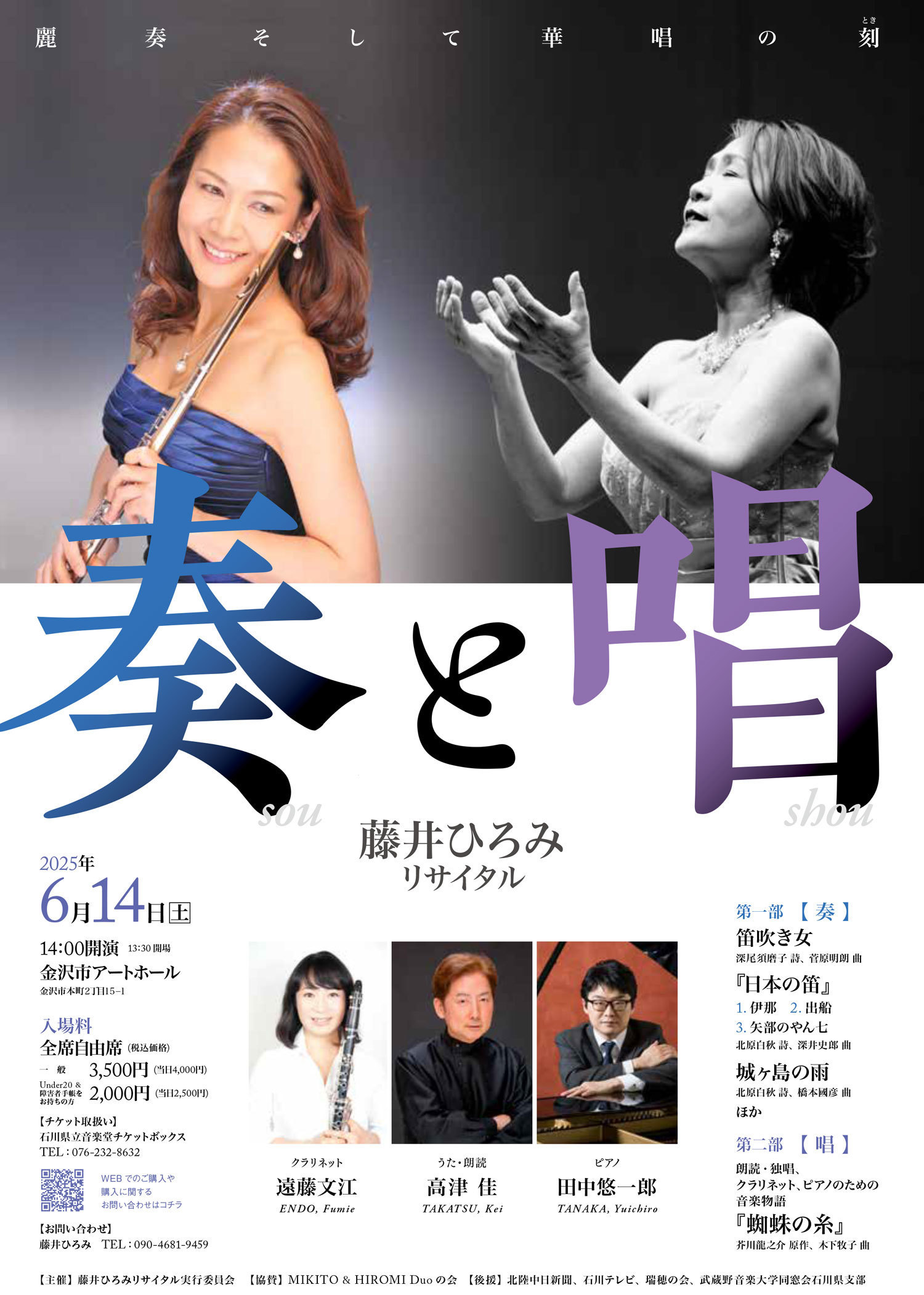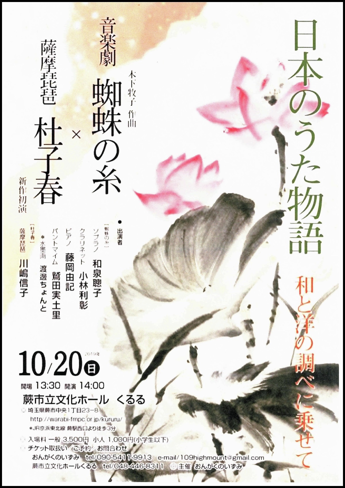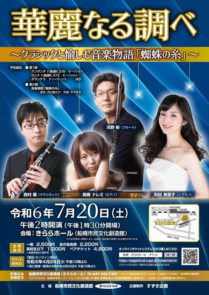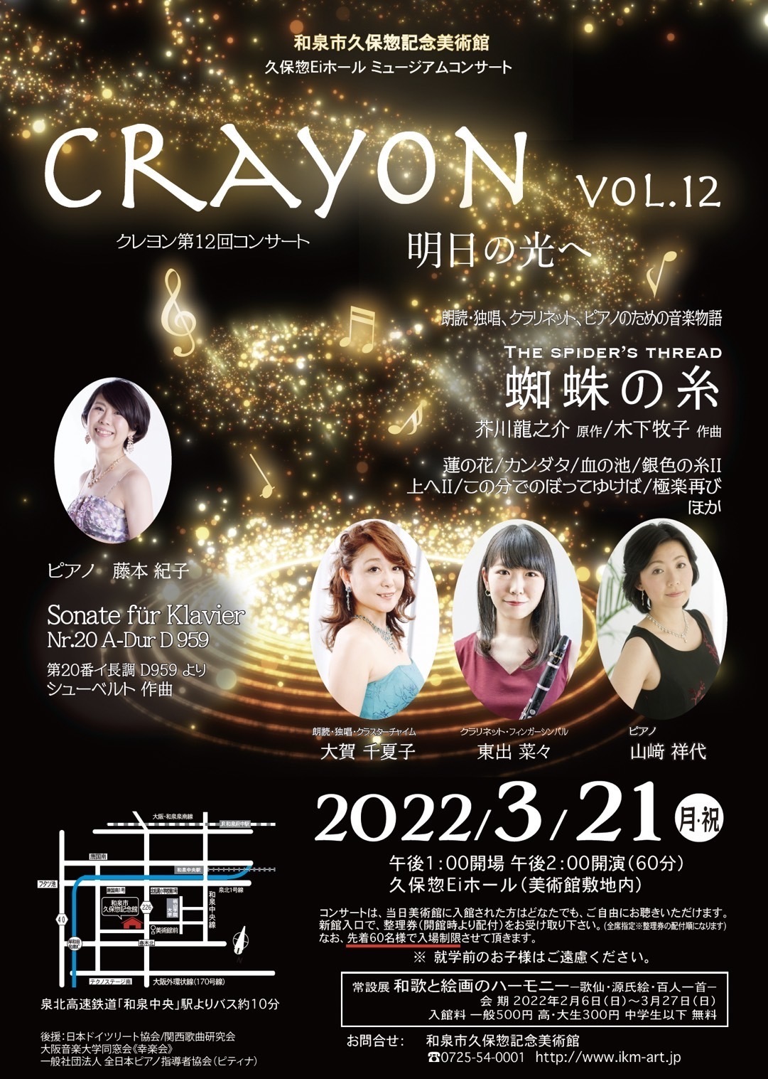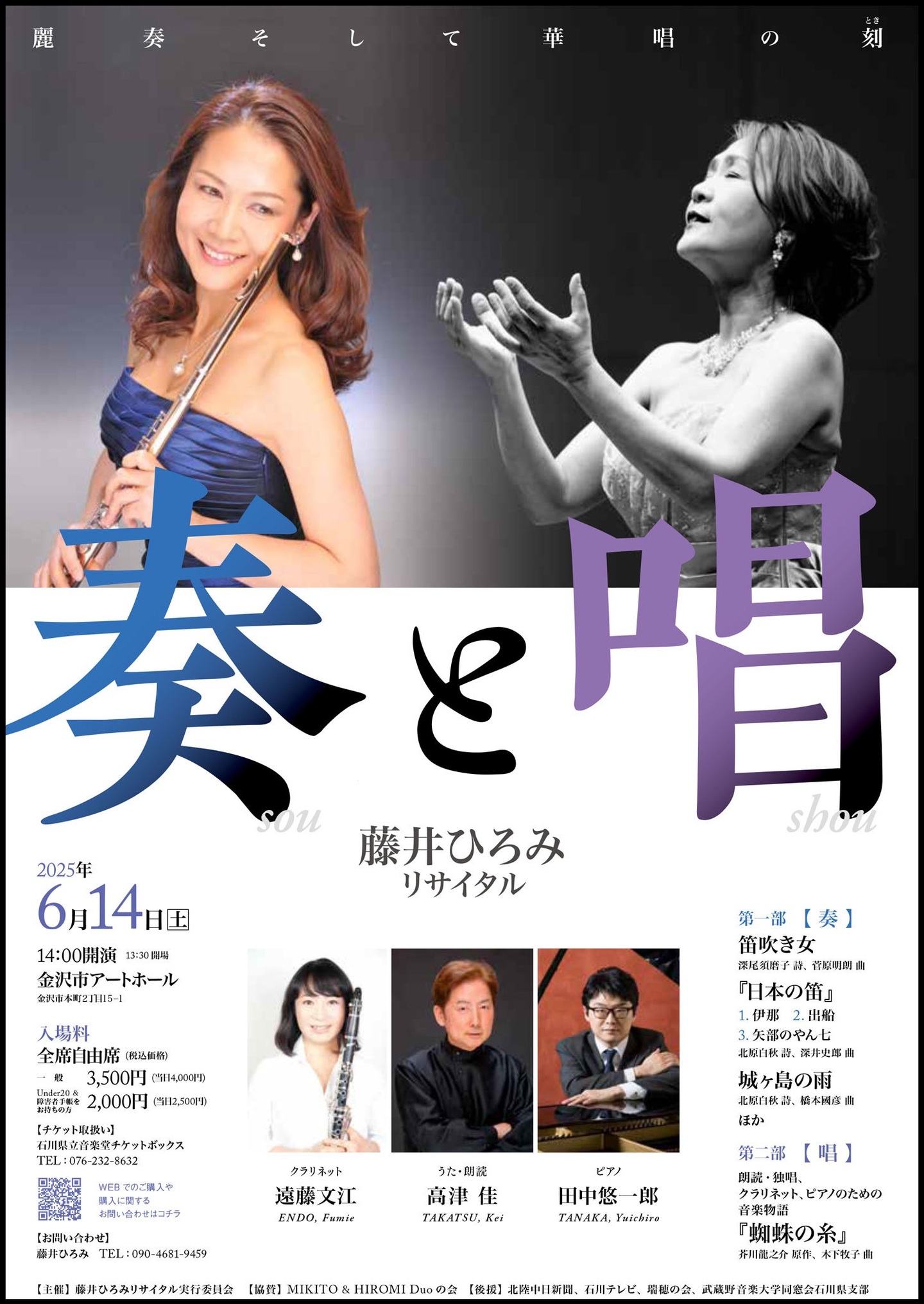 音楽物語「蜘蛛の糸」ちらしコレクション(40) ※画像をクリックすると拡大します。 '25.6/14 (土)朗読.高津 佳 S.藤井ひろみ Cl.遠藤文江 Pf.田中悠一郎金沢市アートホール♦︎ ♦︎ ♦︎ ♦︎ ♦︎ '25.5/6 (火/祝)S/朗読 沢崎恵美 Cl.守屋和佳子 Pf.岩崎能子高津市民館ホール♦︎ ♦︎ ♦︎ ♦︎ ♦︎ '25.4/29 (火/祝)S/朗読 田原ちえCl.海老澤栄美 Pf.田中純子鶴見区民文化センターサルビアH♦︎ ♦︎ ♦︎ ♦︎ ♦︎ '25.4/13(日)朗読.浅井彰子 Ms.田島聖子Cl. 浅田文子 Pf.日下部かおり人形操演.百鬼ゆめひなぎふ清流文化プラザ長良川H♦︎ ♦︎ ♦︎ ♦︎ ♦︎ '25.3/30 (日)朗読.浅井彰子 Ms.田島聖子 Sax.西浦 颯 Pf.日下部かおり人形操演.百鬼ゆめひな阿智村中央公民館ホール♦︎ ♦︎ ♦︎ ♦︎ ♦︎ '25.3/22 (土) S/朗読 大賀千夏子 Cl.東出菜々 Pf.山崎祥代久保惣Eiホール♦︎ ♦︎ ♦︎ ♦︎ ♦︎ '25.3/1 (土)S/朗読 井坂 恵 Cl.西村 薫 Pf.松川 儒美術.出射 茂川西町フレンドリープラザ♦︎ ♦︎ ♦︎ ♦︎ ♦︎ '24.8/30 (土)S/朗読 涂 櫻Vc.三谷野絵 Pf.谷口若菜マリー コンツェルト♦︎ ♦︎ ♦︎ ♦︎ ♦︎ '24.8/4(日) S/朗読 家田紀子Cl. 黒尾文恵 Pf.坂元陽子ムジカーザ♦︎ ♦︎ ♦︎ ♦︎ ♦︎ '24.7/20 (土)S/朗読 和田美菜子Cl. 西村 薫 Pf.高橋ドレミきららホール♦︎ ♦︎ ♦︎ ♦︎ ♦︎ '24.5/11 (土)S/朗読 青木つくしCl.田中香織 Pf.山本佳代子GINZA7TH STUDIO♦︎ ♦︎ ♦︎ ♦︎ ♦︎ '24.3/24(日)S/朗読 松浦(郷津) 恵Cl. 郷津隆幸 Pf.郷津由紀子Perc.郷津幸男山形市民会館小ホール♦︎ ♦︎ ♦︎ ♦︎ ♦︎ '23.4/23 (日)S/朗読 青木つくしCl. 田中香織 Pf.山本佳代子戸畑市民会館中ホール♦︎ ♦︎ ♦︎ ♦︎ ♦︎ '23.4/15 (土)S/朗読 北島佳世Cl. 照沼夢輝 Pf.小林萌里観蔵院 曼荼羅美術館♦︎ ♦︎ ♦︎ ♦︎ ♦︎ '23.1/29 (日)S/朗読 和田美菜子 Cl.西村 薫 Pf.斎藤誠二プラッツ習志野市民ホール♦︎ ♦︎ ♦︎ ♦︎ ♦︎ '22.12/3(土)S/朗読 里中トヨコCl. 黒尾文恵 Pf.坂元陽子御影公会堂白鶴ホール♦︎ ♦︎ ♦︎ ♦︎ ♦︎ '22.11/6 (日)S/朗読 真野綾子 Cl.丸木一巧 Pf.田邉安紀恵Pfカフェ ベヒシュタイン♦︎ ♦︎ ♦︎ ♦︎ ♦︎ '22.8/27 (土)N.花燈明桂 S.友利あつ子Cl.根間安代 Pf.大城伸悟アイム・ユニバースてだこ小♦︎ ♦︎ ♦︎ ♦︎ ♦︎ '22.4/29 (金/祝)S/朗読 里中トヨコCl. 黒尾文恵 Pf.石橋衣里東京オペラシティリサイタルH♦︎ ♦︎ ♦︎ ♦︎ ♦︎ '22.4/16(土)S/朗読 栗原未和Cl.小谷口直子 Pf.二塚裕美京都アスニー♦︎ ♦︎ ♦︎ ♦︎ ♦︎ '22.4/3(日)S/朗読 小山瑠美子Cl. 西村 薫 Pf.斉藤晴海りゅーとぴあ スタジオA♦︎ ♦︎ ♦︎ ♦︎ ♦︎ '22.3/21 (日)S/朗読 大賀千夏子 Cl.東出菜々 Pf.山崎祥代久保惣Eiホール♦︎ ♦︎ ♦︎ ♦︎ ♦︎ '21.12/26 (日)S/朗読 平野則子 Cl.三瓶佳紀 Pf.浅井智子渡辺淳一文学館♦︎ ♦︎ ♦︎ ♦︎ ♦︎ '21.12/12 (日)S/朗読 吉田美紀 Cl.小宮山由佳 Pf.岩元志真潮音寺♦︎ ♦︎ ♦︎ ♦︎ ♦︎ '21.4/3(土)S/朗読 出口裕子 Cl.西崎智子 Pf.松下智子岡山 ルネスホール♦︎ ♦︎ ♦︎ ♦︎ ♦︎ '21.3/7(日)S/朗読 宮地里実 Cl.小嶋慶子 Pf.吉田 純横浜市歴史博物館エントランスH♦︎ ♦︎ ♦︎ ♦︎ ♦︎ '21.2/9(火)S/朗読 久保菊子Cl.藤原猛浩 Pf.田中涼太兵庫県立芸術文化センター小 ♦︎ ♦︎ ♦︎ ♦︎ ♦︎ '20.12/20(日)S/朗読 針生美智子 Cl.河野泰幸 Pf.外山啓介札幌大谷大学記念ホール ♦︎ ♦︎ ♦︎ ♦︎ ♦︎ '20.1/26(日)S/朗読 和田美菜子 Cl.西村 薫 Pf.田村瑞記トーキョーコンサーツ•ラボ ♦︎ ♦︎ ♦︎ ♦︎ ♦︎ '19.10/23(水)S/朗読 里中トヨコ Cl.黒尾文恵 Pf.坂元陽子けやきホール ♦︎ ♦︎ ♦︎ ♦︎ ♦︎ '19.10/20(日)S/朗読 和泉聰子Cl.小林利彰 Pf. 藤岡由記蕨市立文化ホール くるる ♦︎ ♦︎ ♦︎ ♦︎ ♦︎ '19.9/26(木) S/朗読.三輪晴美Cl.本田沙紀 Pf.田中 恵岡崎市シビックコンサートホール ♦︎ ♦︎ ♦︎ ♦︎ ♦︎ '19.8/4(日) S.豐田かおリ 朗読.大場由香Cl.岡林和歌 Pf.岩永圭司HITOMIホール♦︎ ♦︎ ♦︎ ♦︎ ♦︎ '18.11/23(金) 主催:日本甲状腺学会S/朗読 加藤千春Cl.齋藤 Pf.榊原紀保子ウェスタ川越小ホール ♦︎ ♦︎ ♦︎ ♦︎ ♦︎ '18.8/25(土)S/朗読 松下悦子 Cl.小谷口直子 Pf.土居知子京都府民ホール•アルティ♦︎ ♦︎ ♦︎ ♦︎ ♦︎ '17.9/2(土)9/5(火)S/朗読 針生美智子Cl.人見 剛 Pf.平野裕樹子千葉市男女共同参画C東京建物 八重洲ホール♦︎ ♦︎ ♦︎ ♦︎ ♦︎ '16. 11/5 (土)主催:栄区文化協会S/朗読 浅野美帆子Cl.松本安津美 Pf.田中初芽栄区民文化センターリリス ♦︎ ♦︎ ♦︎ ♦︎ ♦︎ '16.4/17(日)主催:オフィス・マキナS/朗読 駒井ゆり子 Cl.草刈民代 Pf.榊原紀保子サントリーH ブルーローズ♦︎ ♦︎ ♦︎ ♦︎ ♦︎ '13.11/2(土)S/朗読 森 朋子 Cl.薗田可奈子 Pf.黒田聡子 やなか音楽ホール ♦︎ ♦︎ ♦︎ ♦︎ ♦︎ '12.6/30(土)委嘱初演 Deux LilasS/朗読 加藤千春 Cl.伊藤圭 Pf.榊原紀保子けやきホール ♦︎ ♦︎ ♦︎ ♦︎ ♦︎ ページトップへ