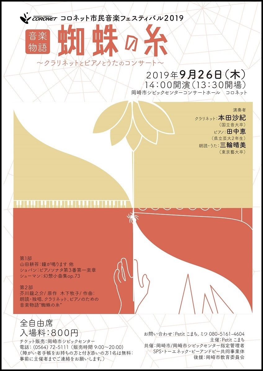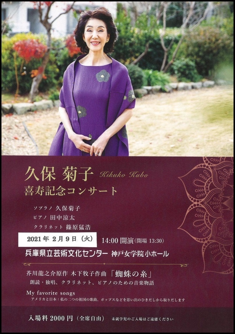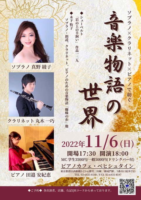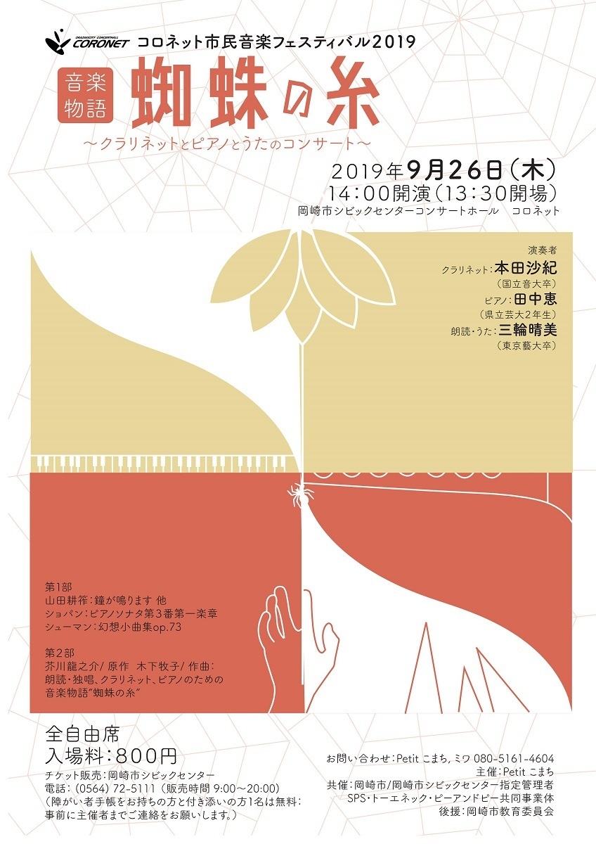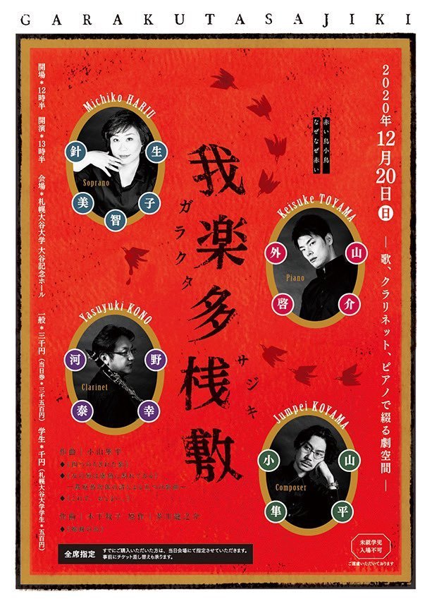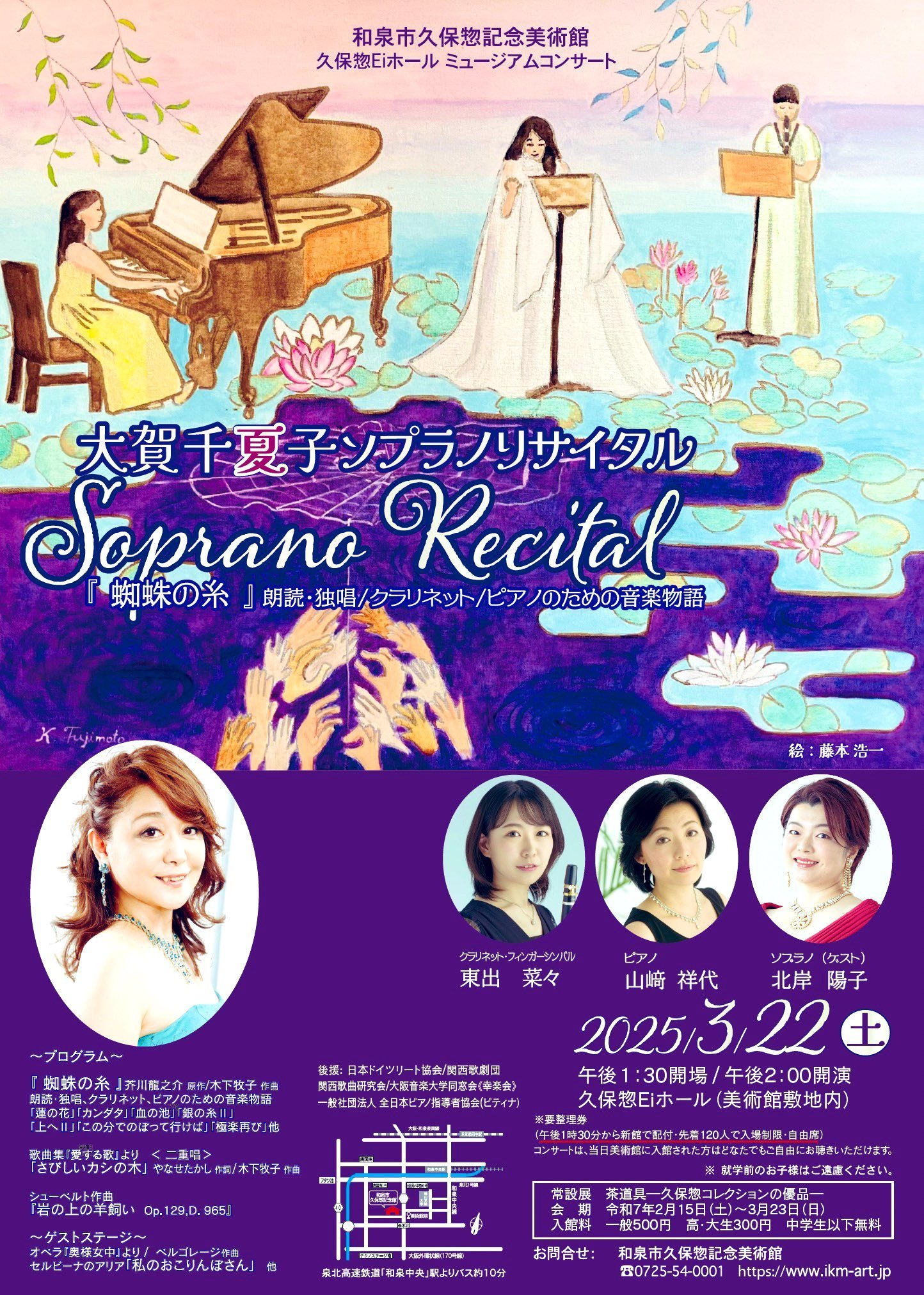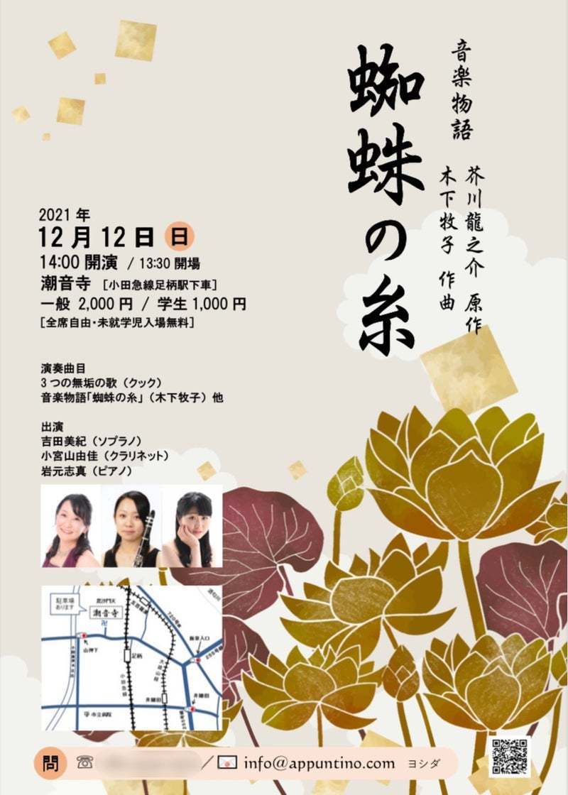 音楽物語「蜘蛛の糸」ちらしコレクション(40) ※画像をクリックすると拡大します。 '25.6/14 (土)朗読.高津 佳 S.藤井ひろみ Cl.遠藤文江 Pf.田中悠一郎金沢市アートホール♦︎ ♦︎ ♦︎ ♦︎ ♦︎ '25.5/6 (火/祝)S/朗読 沢崎恵美 Cl.守屋和佳子 Pf.岩崎能子高津市民館ホール♦︎ ♦︎ ♦︎ ♦︎ ♦︎ '25.4/29 (火/祝)S/朗読 田原ちえCl.海老澤栄美 Pf.田中純子鶴見区民文化センターサルビアH♦︎ ♦︎ ♦︎ ♦︎ ♦︎ '25.4/13(日)朗読.浅井彰子 Ms.田島聖子Cl. 浅田文子 Pf.日下部かおり人形操演.百鬼ゆめひなぎふ清流文化プラザ長良川H♦︎ ♦︎ ♦︎ ♦︎ ♦︎ '25.3/30 (日)朗読.浅井彰子 Ms.田島聖子 Sax.西浦 颯 Pf.日下部かおり人形操演.百鬼ゆめひな阿智村中央公民館ホール♦︎ ♦︎ ♦︎ ♦︎ ♦︎ '25.3/22 (土) S/朗読 大賀千夏子 Cl.東出菜々 Pf.山崎祥代久保惣Eiホール♦︎ ♦︎ ♦︎ ♦︎ ♦︎ '25.3/1 (土)S/朗読 井坂 恵 Cl.西村 薫 Pf.松川 儒美術.出射 茂川西町フレンドリープラザ♦︎ ♦︎ ♦︎ ♦︎ ♦︎ '24.8/30 (土)S/朗読 涂 櫻Vc.三谷野絵 Pf.谷口若菜マリー コンツェルト♦︎ ♦︎ ♦︎ ♦︎ ♦︎ '24.8/4(日) S/朗読 家田紀子Cl. 黒尾文恵 Pf.坂元陽子ムジカーザ♦︎ ♦︎ ♦︎ ♦︎ ♦︎ '24.7/20 (土)S/朗読 和田美菜子Cl. 西村 薫 Pf.高橋ドレミきららホール♦︎ ♦︎ ♦︎ ♦︎ ♦︎ '24.5/11 (土)S/朗読 青木つくしCl.田中香織 Pf.山本佳代子GINZA7TH STUDIO♦︎ ♦︎ ♦︎ ♦︎ ♦︎ '24.3/24(日)S/朗読 松浦(郷津) 恵Cl. 郷津隆幸 Pf.郷津由紀子Perc.郷津幸男山形市民会館小ホール♦︎ ♦︎ ♦︎ ♦︎ ♦︎ '23.4/23 (日)S/朗読 青木つくしCl. 田中香織 Pf.山本佳代子戸畑市民会館中ホール♦︎ ♦︎ ♦︎ ♦︎ ♦︎ '23.4/15 (土)S/朗読 北島佳世Cl. 照沼夢輝 Pf.小林萌里観蔵院 曼荼羅美術館♦︎ ♦︎ ♦︎ ♦︎ ♦︎ '23.1/29 (日)S/朗読 和田美菜子 Cl.西村 薫 Pf.斎藤誠二プラッツ習志野市民ホール♦︎ ♦︎ ♦︎ ♦︎ ♦︎ '22.12/3(土)S/朗読 里中トヨコCl. 黒尾文恵 Pf.坂元陽子御影公会堂白鶴ホール♦︎ ♦︎ ♦︎ ♦︎ ♦︎ '22.11/6 (日)S/朗読 真野綾子 Cl.丸木一巧 Pf.田邉安紀恵Pfカフェ ベヒシュタイン♦︎ ♦︎ ♦︎ ♦︎ ♦︎ '22.8/27 (土)N.花燈明桂 S.友利あつ子Cl.根間安代 Pf.大城伸悟アイム・ユニバースてだこ小♦︎ ♦︎ ♦︎ ♦︎ ♦︎ '22.4/29 (金/祝)S/朗読 里中トヨコCl. 黒尾文恵 Pf.石橋衣里東京オペラシティリサイタルH♦︎ ♦︎ ♦︎ ♦︎ ♦︎ '22.4/16(土)S/朗読 栗原未和Cl.小谷口直子 Pf.二塚裕美京都アスニー♦︎ ♦︎ ♦︎ ♦︎ ♦︎ '22.4/3(日)S/朗読 小山瑠美子Cl. 西村 薫 Pf.斉藤晴海りゅーとぴあ スタジオA♦︎ ♦︎ ♦︎ ♦︎ ♦︎ '22.3/21 (日)S/朗読 大賀千夏子 Cl.東出菜々 Pf.山崎祥代久保惣Eiホール♦︎ ♦︎ ♦︎ ♦︎ ♦︎ '21.12/26 (日)S/朗読 平野則子 Cl.三瓶佳紀 Pf.浅井智子渡辺淳一文学館♦︎ ♦︎ ♦︎ ♦︎ ♦︎ '21.12/12 (日)S/朗読 吉田美紀 Cl.小宮山由佳 Pf.岩元志真潮音寺♦︎ ♦︎ ♦︎ ♦︎ ♦︎ '21.4/3(土)S/朗読 出口裕子 Cl.西崎智子 Pf.松下智子岡山 ルネスホール♦︎ ♦︎ ♦︎ ♦︎ ♦︎ '21.3/7(日)S/朗読 宮地里実 Cl.小嶋慶子 Pf.吉田 純横浜市歴史博物館エントランスH♦︎ ♦︎ ♦︎ ♦︎ ♦︎ '21.2/9(火)S/朗読 久保菊子Cl.藤原猛浩 Pf.田中涼太兵庫県立芸術文化センター小 ♦︎ ♦︎ ♦︎ ♦︎ ♦︎ '20.12/20(日)S/朗読 針生美智子 Cl.河野泰幸 Pf.外山啓介札幌大谷大学記念ホール ♦︎ ♦︎ ♦︎ ♦︎ ♦︎ '20.1/26(日)S/朗読 和田美菜子 Cl.西村 薫 Pf.田村瑞記トーキョーコンサーツ•ラボ ♦︎ ♦︎ ♦︎ ♦︎ ♦︎ '19.10/23(水)S/朗読 里中トヨコ Cl.黒尾文恵 Pf.坂元陽子けやきホール ♦︎ ♦︎ ♦︎ ♦︎ ♦︎ '19.10/20(日)S/朗読 和泉聰子Cl.小林利彰 Pf. 藤岡由記蕨市立文化ホール くるる ♦︎ ♦︎ ♦︎ ♦︎ ♦︎ '19.9/26(木) S/朗読.三輪晴美Cl.本田沙紀 Pf.田中 恵岡崎市シビックコンサートホール ♦︎ ♦︎ ♦︎ ♦︎ ♦︎ '19.8/4(日) S.豐田かおリ 朗読.大場由香Cl.岡林和歌 Pf.岩永圭司HITOMIホール♦︎ ♦︎ ♦︎ ♦︎ ♦︎ '18.11/23(金) 主催:日本甲状腺学会S/朗読 加藤千春Cl.齋藤 Pf.榊原紀保子ウェスタ川越小ホール ♦︎ ♦︎ ♦︎ ♦︎ ♦︎ '18.8/25(土)S/朗読 松下悦子 Cl.小谷口直子 Pf.土居知子京都府民ホール•アルティ♦︎ ♦︎ ♦︎ ♦︎ ♦︎ '17.9/2(土)9/5(火)S/朗読 針生美智子Cl.人見 剛 Pf.平野裕樹子千葉市男女共同参画C東京建物 八重洲ホール♦︎ ♦︎ ♦︎ ♦︎ ♦︎ '16. 11/5 (土)主催:栄区文化協会S/朗読 浅野美帆子Cl.松本安津美 Pf.田中初芽栄区民文化センターリリス ♦︎ ♦︎ ♦︎ ♦︎ ♦︎ '16.4/17(日)主催:オフィス・マキナS/朗読 駒井ゆり子 Cl.草刈民代 Pf.榊原紀保子サントリーH ブルーローズ♦︎ ♦︎ ♦︎ ♦︎ ♦︎ '13.11/2(土)S/朗読 森 朋子 Cl.薗田可奈子 Pf.黒田聡子 やなか音楽ホール ♦︎ ♦︎ ♦︎ ♦︎ ♦︎ '12.6/30(土)委嘱初演 Deux LilasS/朗読 加藤千春 Cl.伊藤圭 Pf.榊原紀保子けやきホール ♦︎ ♦︎ ♦︎ ♦︎ ♦︎ ページトップへ