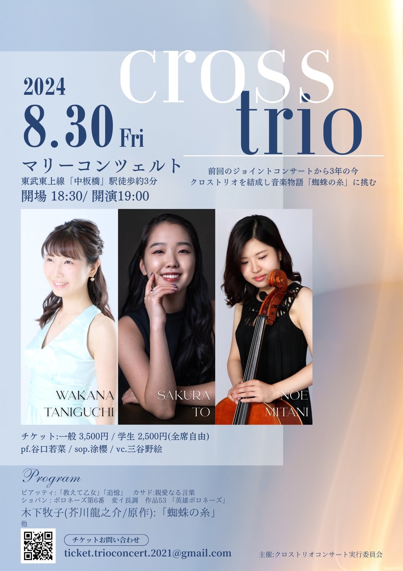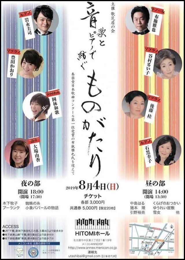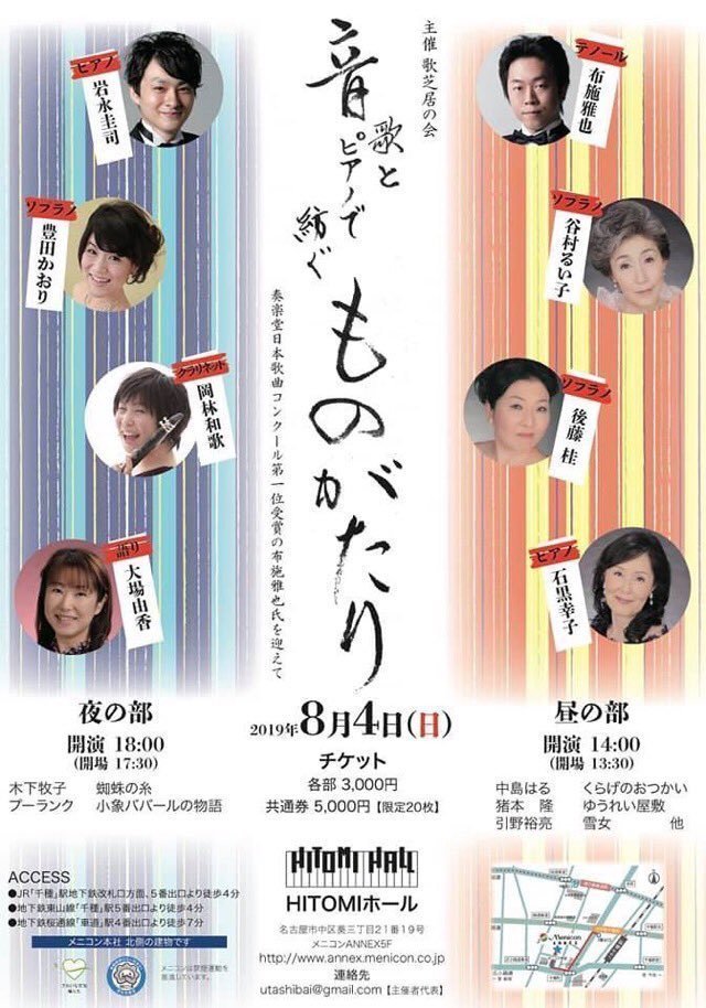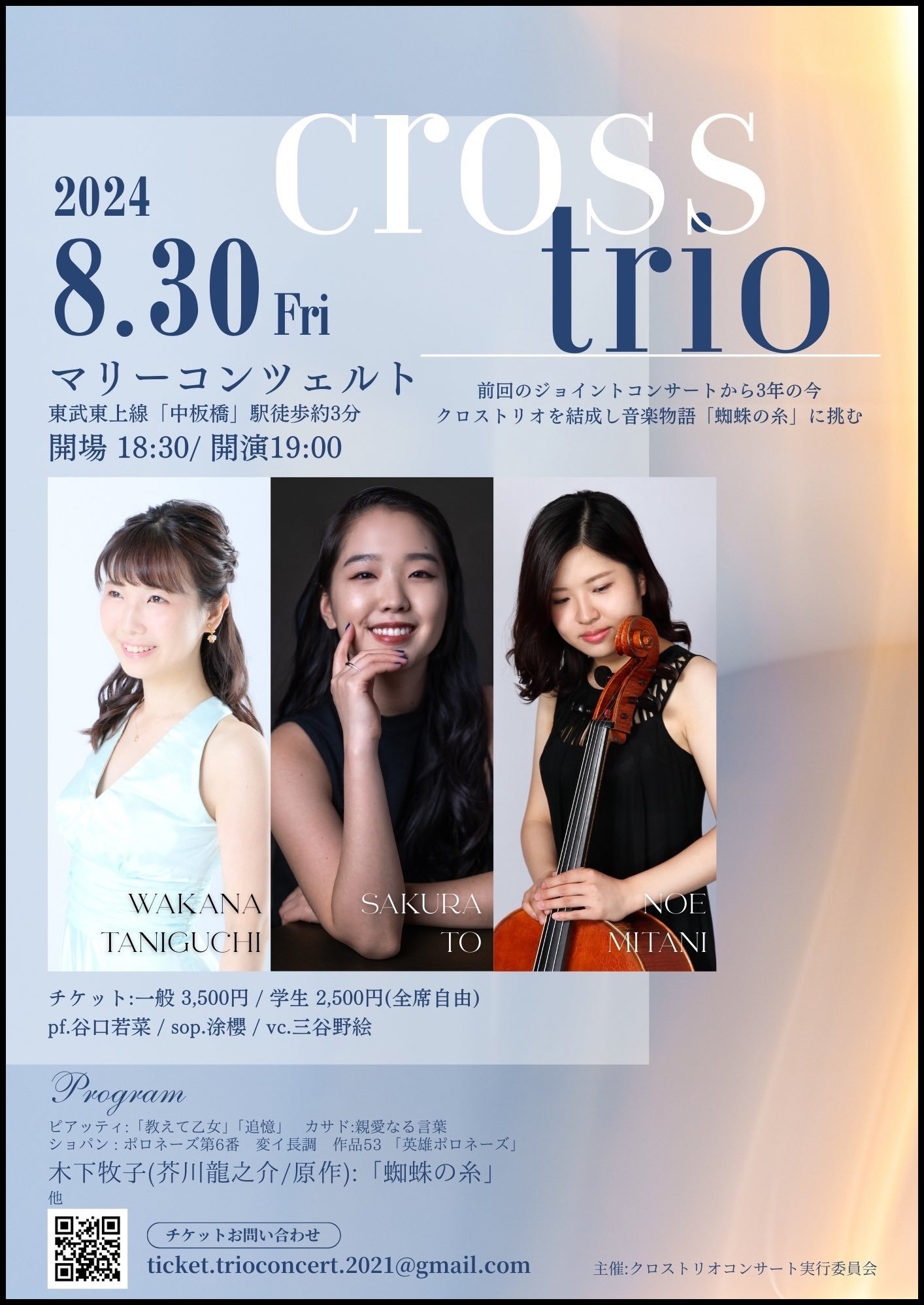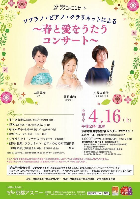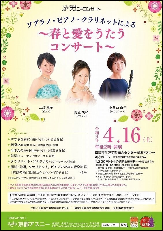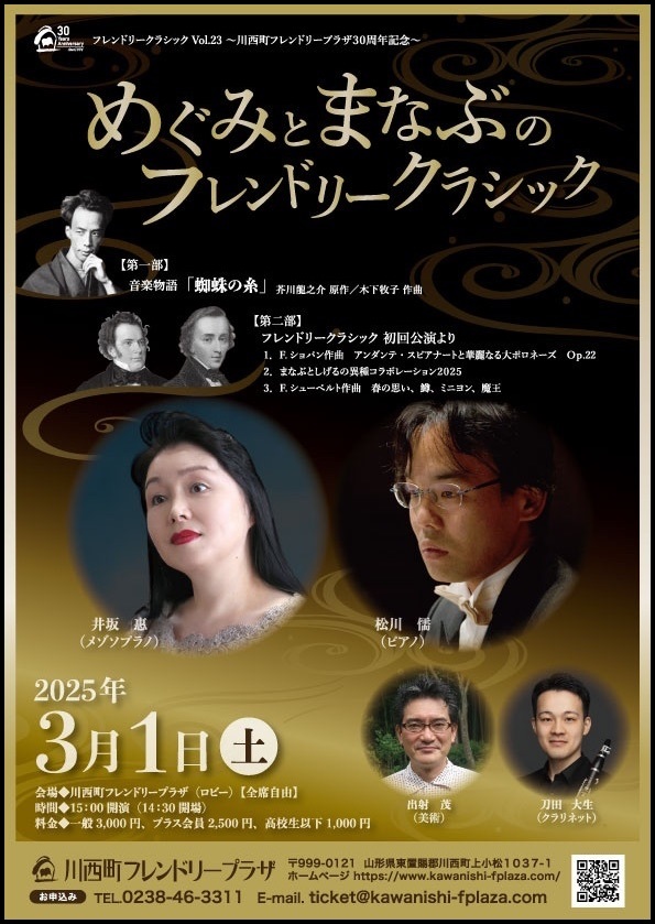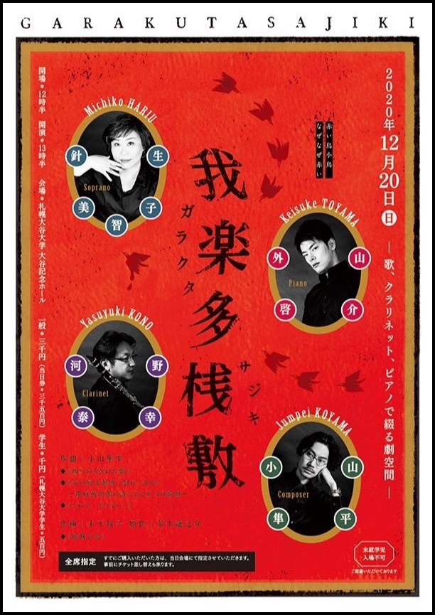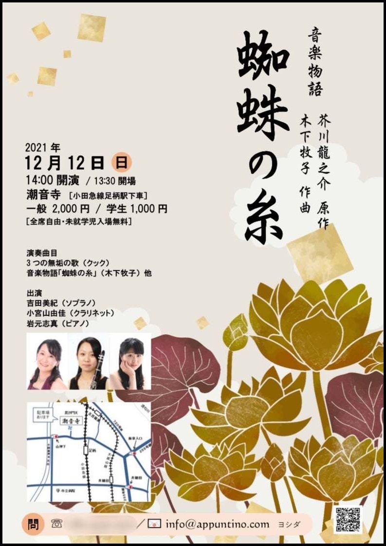 音楽物語「蜘蛛の糸」ちらしコレクション(40) ※画像をクリックすると拡大します。 '25.6/14 (土)朗読.高津 佳 S.藤井ひろみ Cl.遠藤文江 Pf.田中悠一郎金沢市アートホール♦︎ ♦︎ ♦︎ ♦︎ ♦︎ '25.5/6 (火/祝)S/朗読 沢崎恵美 Cl.守屋和佳子 Pf.岩崎能子高津市民館ホール♦︎ ♦︎ ♦︎ ♦︎ ♦︎ '25.4/29 (火/祝)S/朗読 田原ちえCl.海老澤栄美 Pf.田中純子鶴見区民文化センターサルビアH♦︎ ♦︎ ♦︎ ♦︎ ♦︎ '25.4/13(日)朗読.浅井彰子 Ms.田島聖子Cl. 浅田文子 Pf.日下部かおり人形操演.百鬼ゆめひなぎふ清流文化プラザ長良川H♦︎ ♦︎ ♦︎ ♦︎ ♦︎ '25.3/30 (日)朗読.浅井彰子 Ms.田島聖子 Sax.西浦 颯 Pf.日下部かおり人形操演.百鬼ゆめひな阿智村中央公民館ホール♦︎ ♦︎ ♦︎ ♦︎ ♦︎ '25.3/22 (土) S/朗読 大賀千夏子 Cl.東出菜々 Pf.山崎祥代久保惣Eiホール♦︎ ♦︎ ♦︎ ♦︎ ♦︎ '25.3/1 (土)S/朗読 井坂 恵 Cl.西村 薫 Pf.松川 儒美術.出射 茂川西町フレンドリープラザ♦︎ ♦︎ ♦︎ ♦︎ ♦︎ '24.8/30 (土)S/朗読 涂 櫻Vc.三谷野絵 Pf.谷口若菜マリー コンツェルト♦︎ ♦︎ ♦︎ ♦︎ ♦︎ '24.8/4(日) S/朗読 家田紀子Cl. 黒尾文恵 Pf.坂元陽子ムジカーザ♦︎ ♦︎ ♦︎ ♦︎ ♦︎ '24.7/20 (土)S/朗読 和田美菜子Cl. 西村 薫 Pf.高橋ドレミきららホール♦︎ ♦︎ ♦︎ ♦︎ ♦︎ '24.5/11 (土)S/朗読 青木つくしCl.田中香織 Pf.山本佳代子GINZA7TH STUDIO♦︎ ♦︎ ♦︎ ♦︎ ♦︎ '24.3/24(日)S/朗読 松浦(郷津) 恵Cl. 郷津隆幸 Pf.郷津由紀子Perc.郷津幸男山形市民会館小ホール♦︎ ♦︎ ♦︎ ♦︎ ♦︎ '23.4/23 (日)S/朗読 青木つくしCl. 田中香織 Pf.山本佳代子戸畑市民会館中ホール♦︎ ♦︎ ♦︎ ♦︎ ♦︎ '23.4/15 (土)S/朗読 北島佳世Cl. 照沼夢輝 Pf.小林萌里観蔵院 曼荼羅美術館♦︎ ♦︎ ♦︎ ♦︎ ♦︎ '23.1/29 (日)S/朗読 和田美菜子 Cl.西村 薫 Pf.斎藤誠二プラッツ習志野市民ホール♦︎ ♦︎ ♦︎ ♦︎ ♦︎ '22.12/3(土)S/朗読 里中トヨコCl. 黒尾文恵 Pf.坂元陽子御影公会堂白鶴ホール♦︎ ♦︎ ♦︎ ♦︎ ♦︎ '22.11/6 (日)S/朗読 真野綾子 Cl.丸木一巧 Pf.田邉安紀恵Pfカフェ ベヒシュタイン♦︎ ♦︎ ♦︎ ♦︎ ♦︎ '22.8/27 (土)N.花燈明桂 S.友利あつ子Cl.根間安代 Pf.大城伸悟アイム・ユニバースてだこ小♦︎ ♦︎ ♦︎ ♦︎ ♦︎ '22.4/29 (金/祝)S/朗読 里中トヨコCl. 黒尾文恵 Pf.石橋衣里東京オペラシティリサイタルH♦︎ ♦︎ ♦︎ ♦︎ ♦︎ '22.4/16(土)S/朗読 栗原未和Cl.小谷口直子 Pf.二塚裕美京都アスニー♦︎ ♦︎ ♦︎ ♦︎ ♦︎ '22.4/3(日)S/朗読 小山瑠美子Cl. 西村 薫 Pf.斉藤晴海りゅーとぴあ スタジオA♦︎ ♦︎ ♦︎ ♦︎ ♦︎ '22.3/21 (日)S/朗読 大賀千夏子 Cl.東出菜々 Pf.山崎祥代久保惣Eiホール♦︎ ♦︎ ♦︎ ♦︎ ♦︎ '21.12/26 (日)S/朗読 平野則子 Cl.三瓶佳紀 Pf.浅井智子渡辺淳一文学館♦︎ ♦︎ ♦︎ ♦︎ ♦︎ '21.12/12 (日)S/朗読 吉田美紀 Cl.小宮山由佳 Pf.岩元志真潮音寺♦︎ ♦︎ ♦︎ ♦︎ ♦︎ '21.4/3(土)S/朗読 出口裕子 Cl.西崎智子 Pf.松下智子岡山 ルネスホール♦︎ ♦︎ ♦︎ ♦︎ ♦︎ '21.3/7(日)S/朗読 宮地里実 Cl.小嶋慶子 Pf.吉田 純横浜市歴史博物館エントランスH♦︎ ♦︎ ♦︎ ♦︎ ♦︎ '21.2/9(火)S/朗読 久保菊子Cl.藤原猛浩 Pf.田中涼太兵庫県立芸術文化センター小 ♦︎ ♦︎ ♦︎ ♦︎ ♦︎ '20.12/20(日)S/朗読 針生美智子 Cl.河野泰幸 Pf.外山啓介札幌大谷大学記念ホール ♦︎ ♦︎ ♦︎ ♦︎ ♦︎ '20.1/26(日)S/朗読 和田美菜子 Cl.西村 薫 Pf.田村瑞記トーキョーコンサーツ•ラボ ♦︎ ♦︎ ♦︎ ♦︎ ♦︎ '19.10/23(水)S/朗読 里中トヨコ Cl.黒尾文恵 Pf.坂元陽子けやきホール ♦︎ ♦︎ ♦︎ ♦︎ ♦︎ '19.10/20(日)S/朗読 和泉聰子Cl.小林利彰 Pf. 藤岡由記蕨市立文化ホール くるる ♦︎ ♦︎ ♦︎ ♦︎ ♦︎ '19.9/26(木) S/朗読.三輪晴美Cl.本田沙紀 Pf.田中 恵岡崎市シビックコンサートホール ♦︎ ♦︎ ♦︎ ♦︎ ♦︎ '19.8/4(日) S.豐田かおリ 朗読.大場由香Cl.岡林和歌 Pf.岩永圭司HITOMIホール♦︎ ♦︎ ♦︎ ♦︎ ♦︎ '18.11/23(金) 主催:日本甲状腺学会S/朗読 加藤千春Cl.齋藤 Pf.榊原紀保子ウェスタ川越小ホール ♦︎ ♦︎ ♦︎ ♦︎ ♦︎ '18.8/25(土)S/朗読 松下悦子 Cl.小谷口直子 Pf.土居知子京都府民ホール•アルティ♦︎ ♦︎ ♦︎ ♦︎ ♦︎ '17.9/2(土)9/5(火)S/朗読 針生美智子Cl.人見 剛 Pf.平野裕樹子千葉市男女共同参画C東京建物 八重洲ホール♦︎ ♦︎ ♦︎ ♦︎ ♦︎ '16. 11/5 (土)主催:栄区文化協会S/朗読 浅野美帆子Cl.松本安津美 Pf.田中初芽栄区民文化センターリリス ♦︎ ♦︎ ♦︎ ♦︎ ♦︎ '16.4/17(日)主催:オフィス・マキナS/朗読 駒井ゆり子 Cl.草刈民代 Pf.榊原紀保子サントリーH ブルーローズ♦︎ ♦︎ ♦︎ ♦︎ ♦︎ '13.11/2(土)S/朗読 森 朋子 Cl.薗田可奈子 Pf.黒田聡子 やなか音楽ホール ♦︎ ♦︎ ♦︎ ♦︎ ♦︎ '12.6/30(土)委嘱初演 Deux LilasS/朗読 加藤千春 Cl.伊藤圭 Pf.榊原紀保子けやきホール ♦︎ ♦︎ ♦︎ ♦︎ ♦︎ ページトップへ